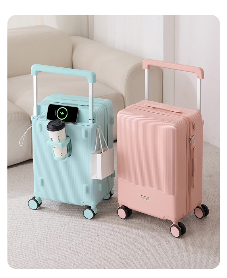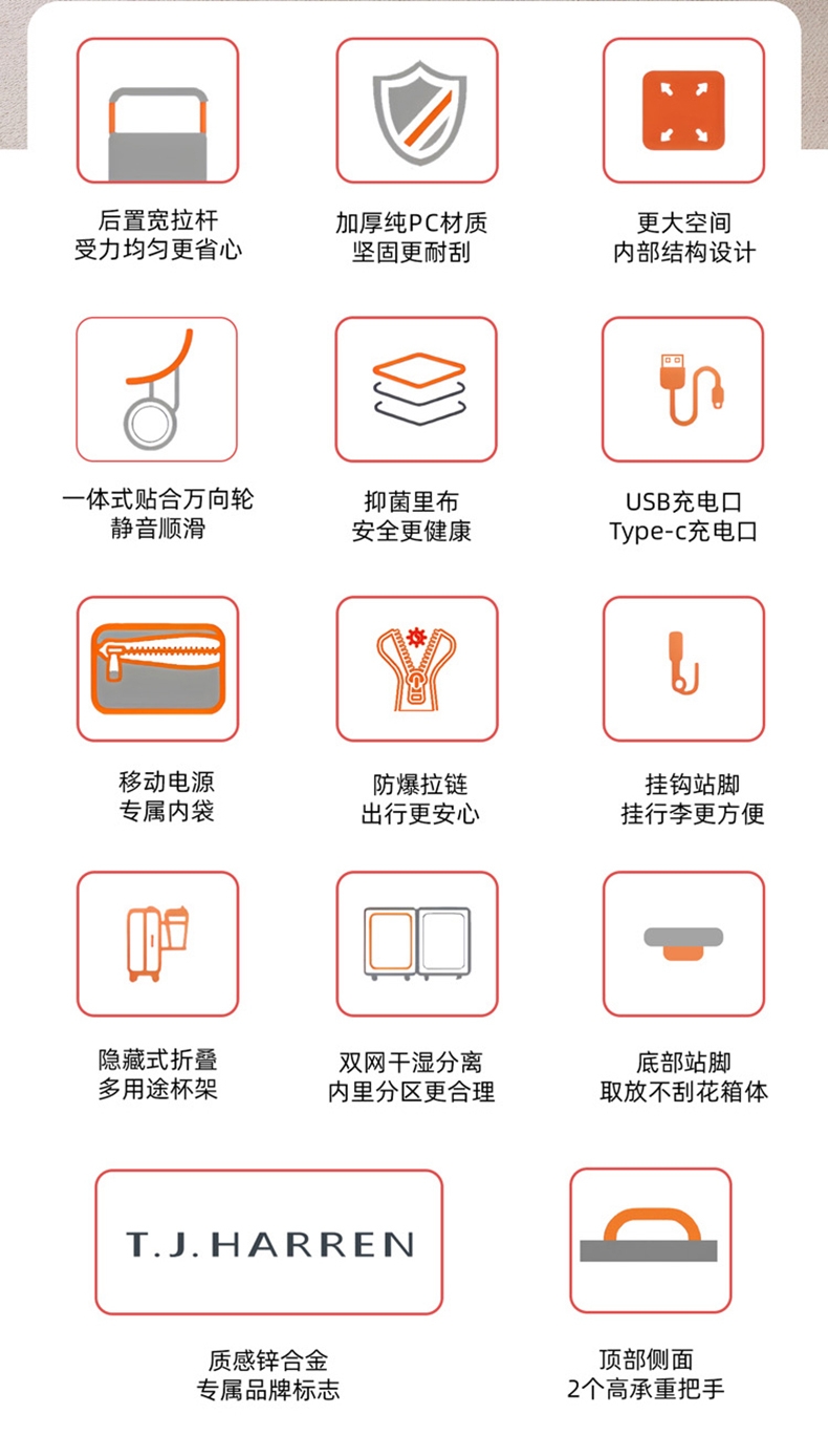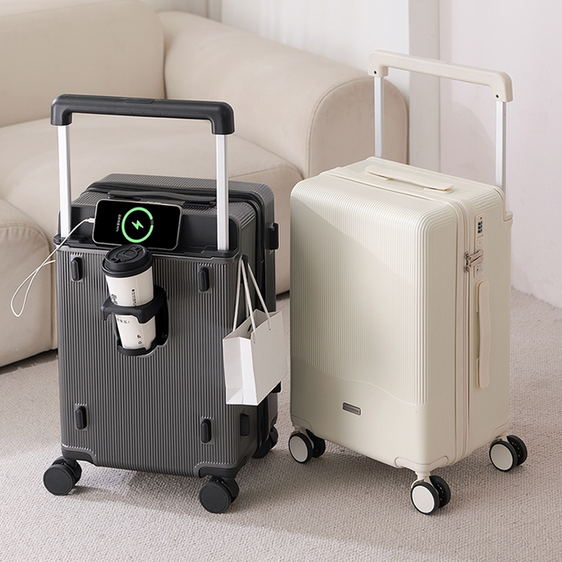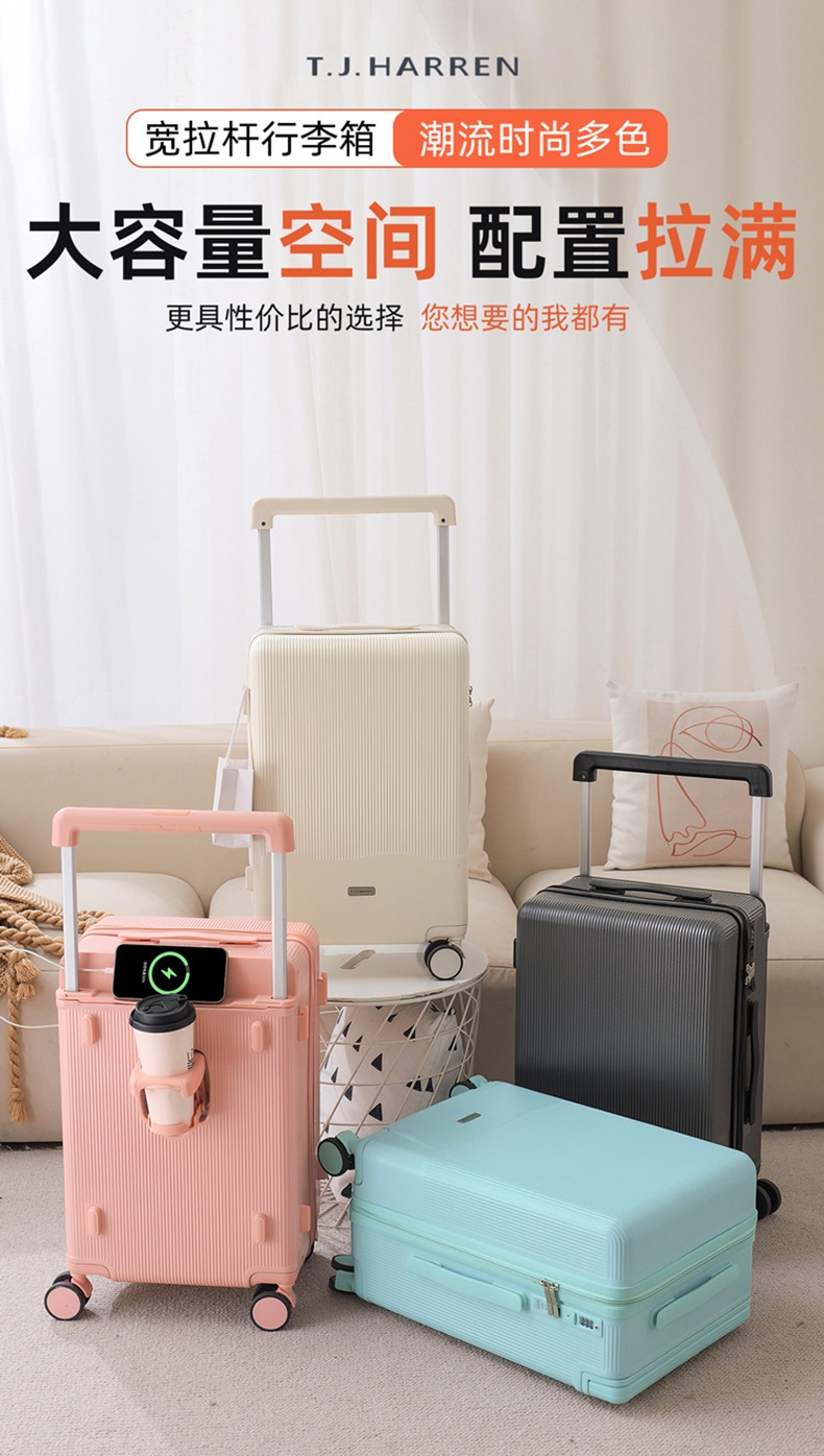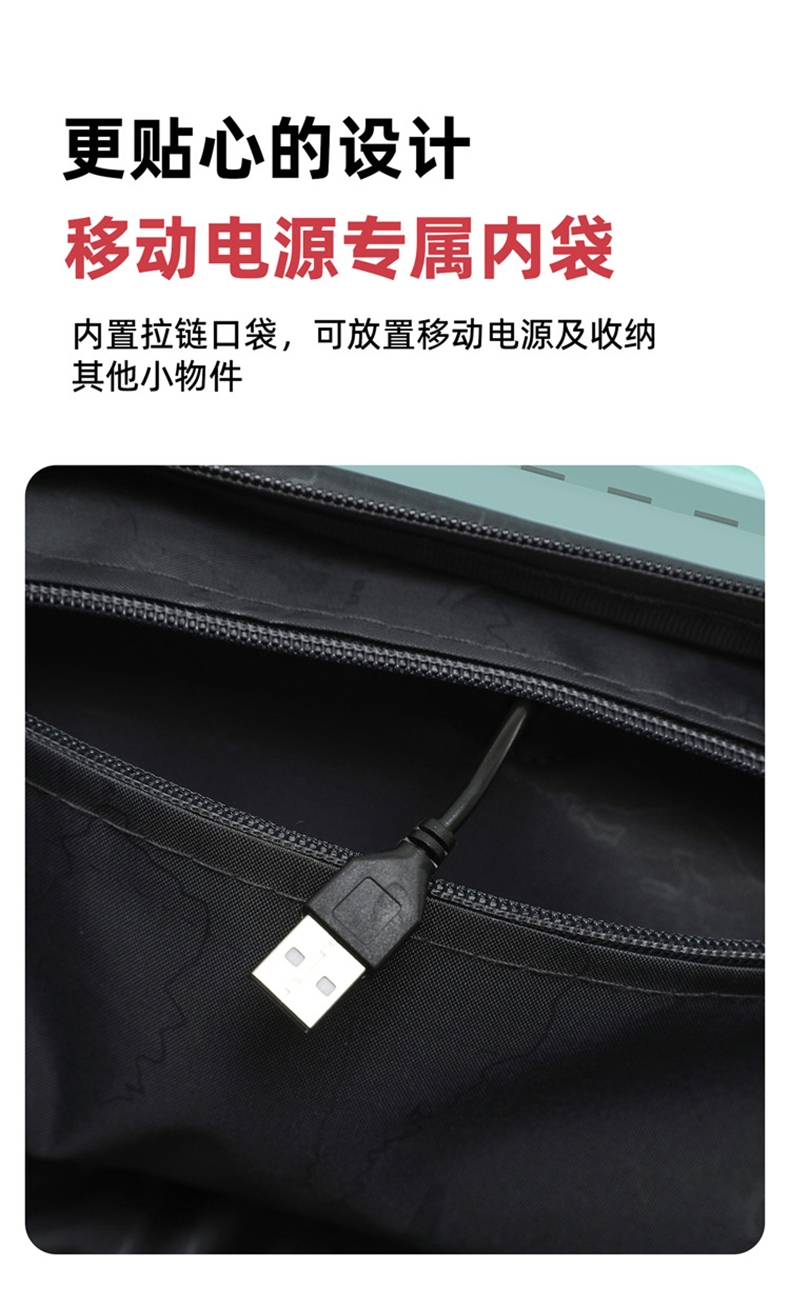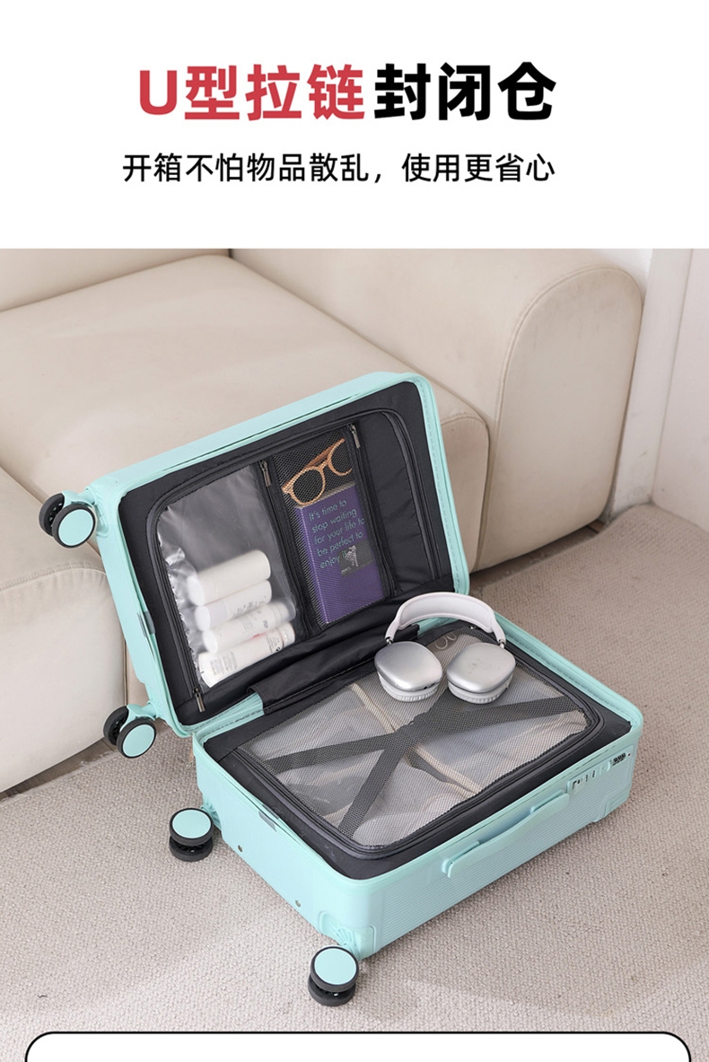 带顶部和侧部提手,竖提横提都方便,带折叠隐形式杯架;底部带4个承重防磨顶脚,取放行李无惧剐蹭箱体;内里大双网结构,干湿分离,分区合理;带USB及Type-C充电口,同时配置移动电源内袋