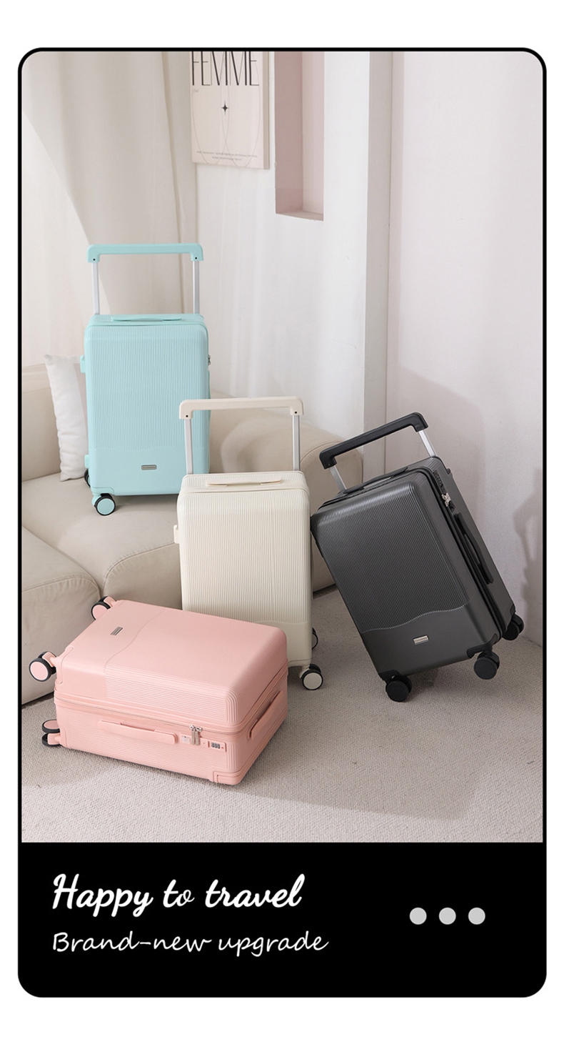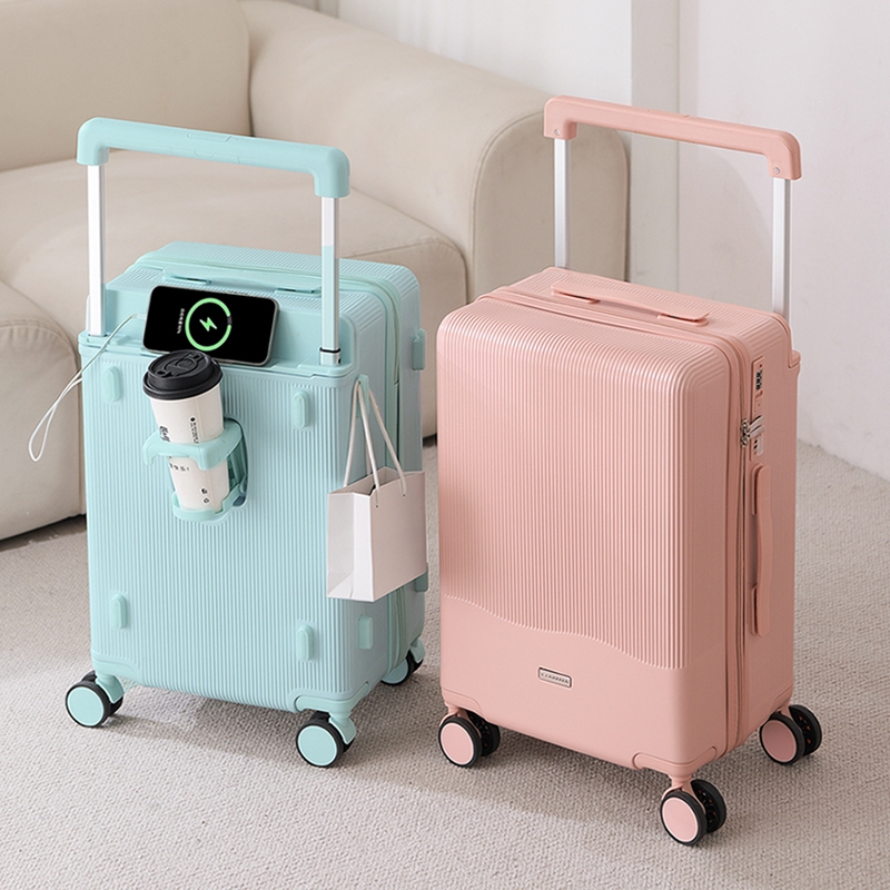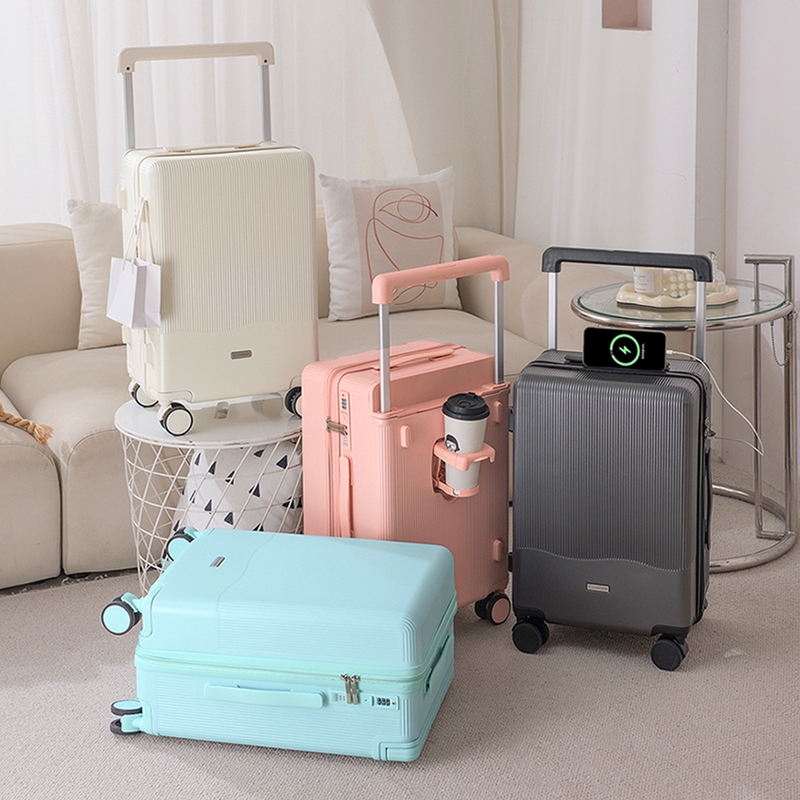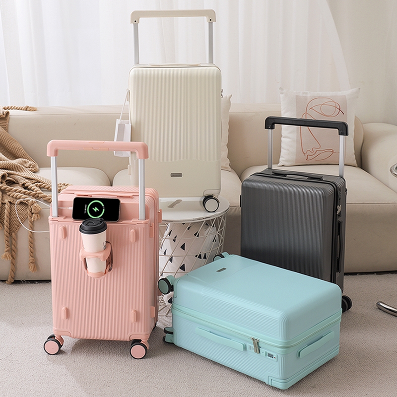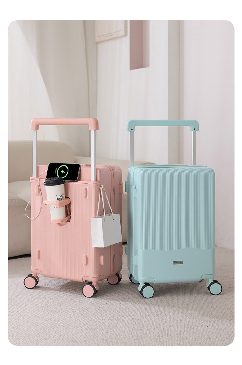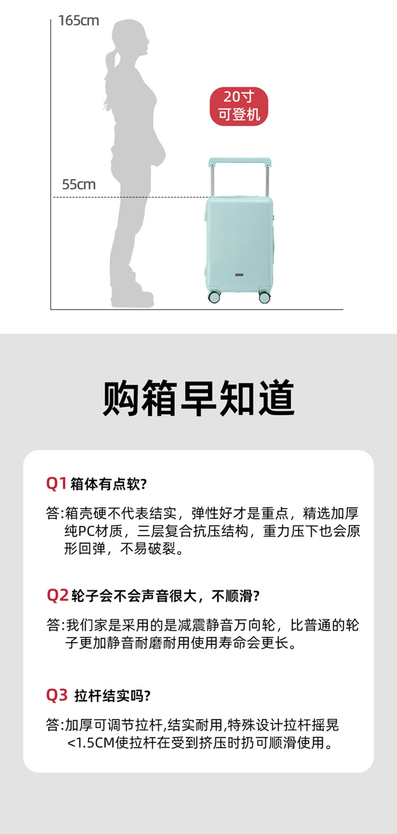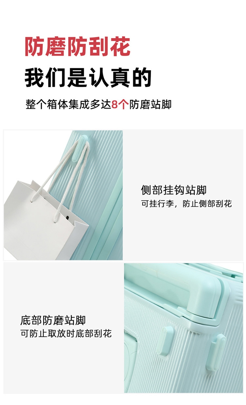 带顶部和侧部提手,竖提横提都方便,带折叠隐形式杯架;底部带4个承重防磨顶脚,取放行李无惧剐蹭箱体;内里大双网结构,干湿分离,分区合理;带USB及Type-C充电口,同时配置移动电源内袋
