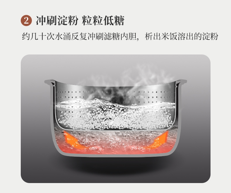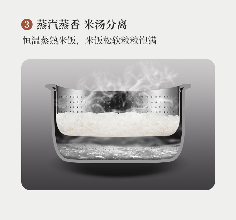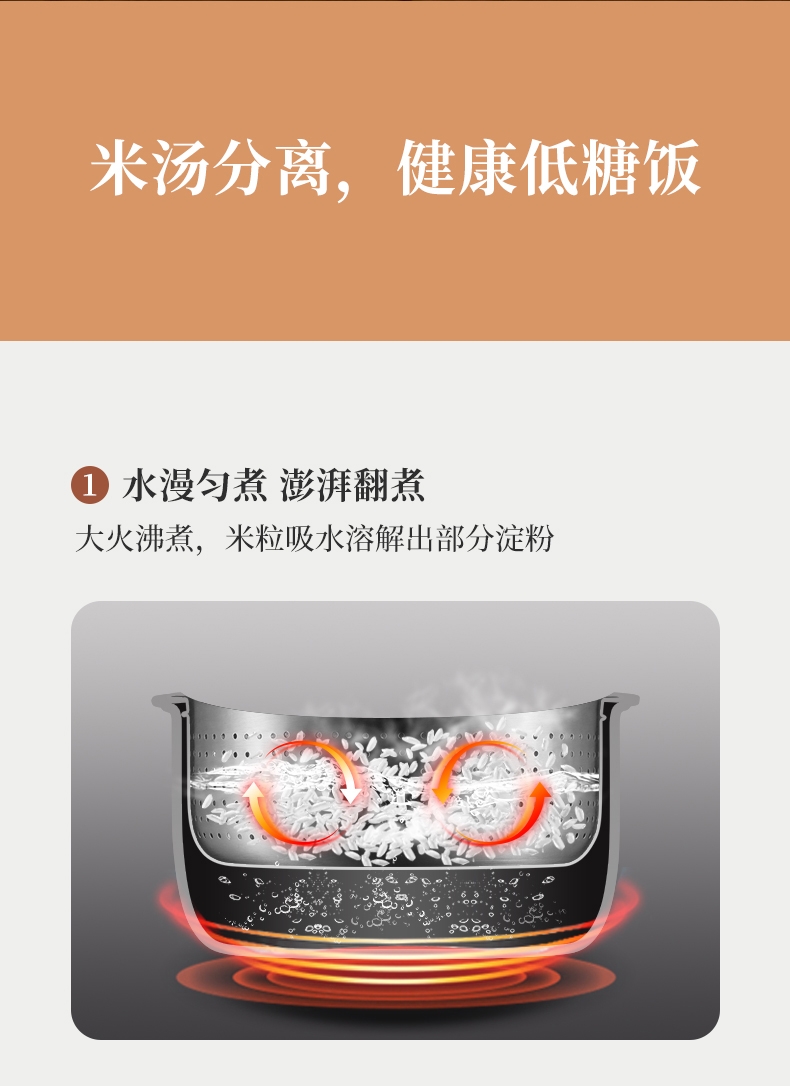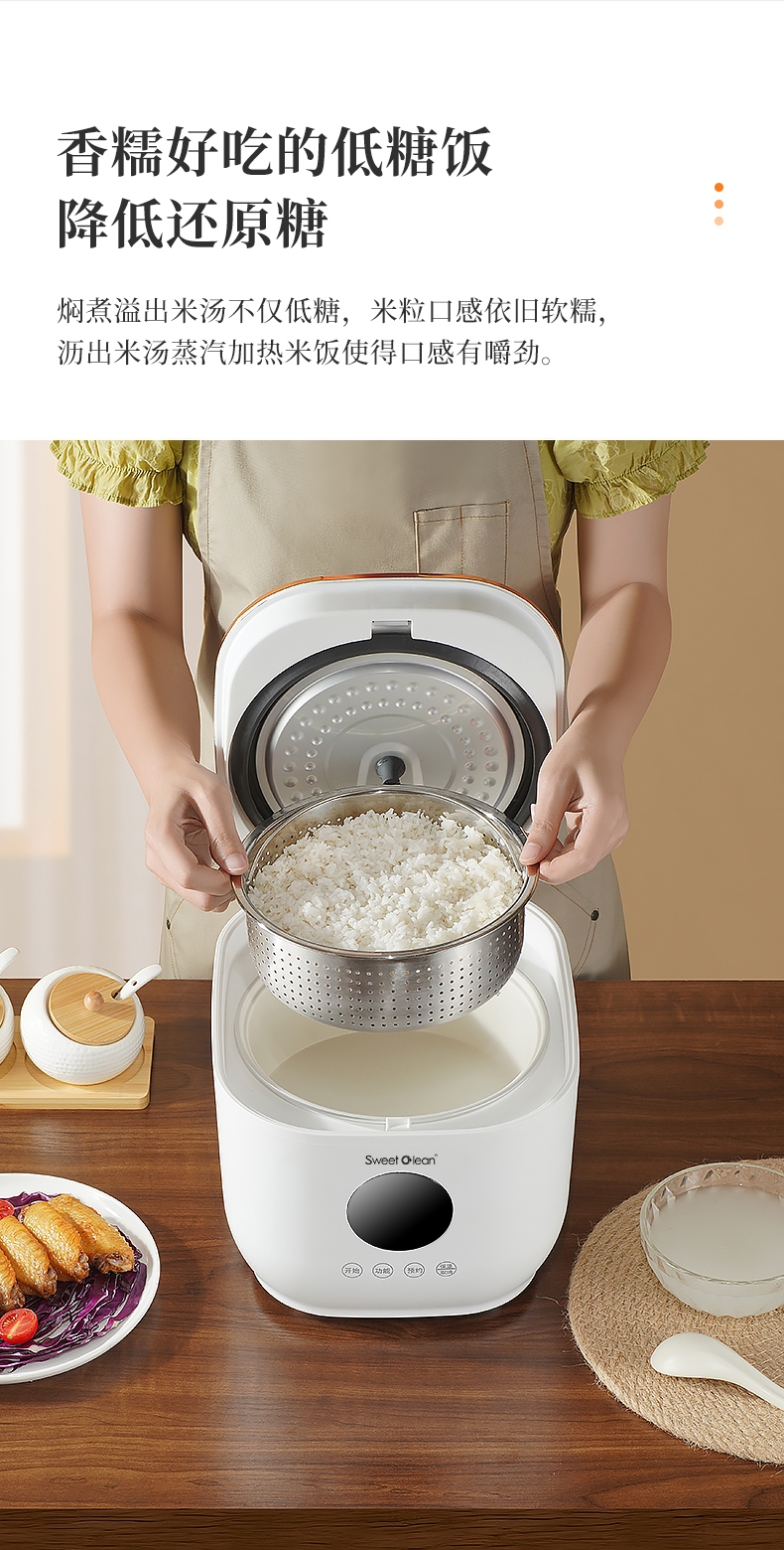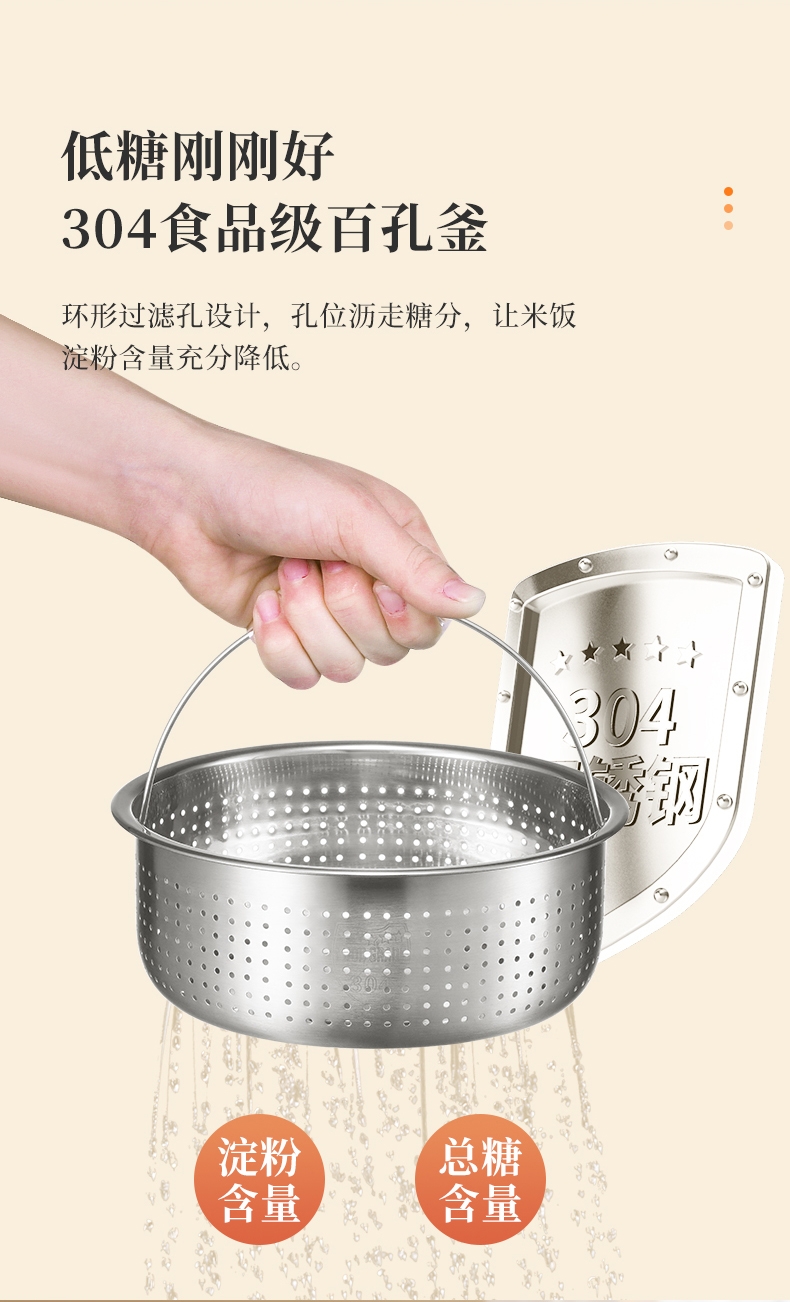 一煮溶出淀粉,二滤米汤分离,三蒸蒸汽蒸熟;智能蒸低糖饭,低糖饮食,减糖不减饭香;双胆设计米汤分离;5项烹饪模式,加厚不粘陶瓷釉内胆 ;,3L黄金容量一人食到六口之家都能满足