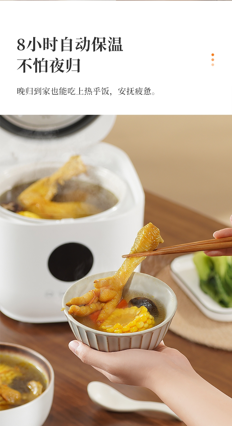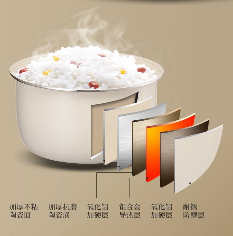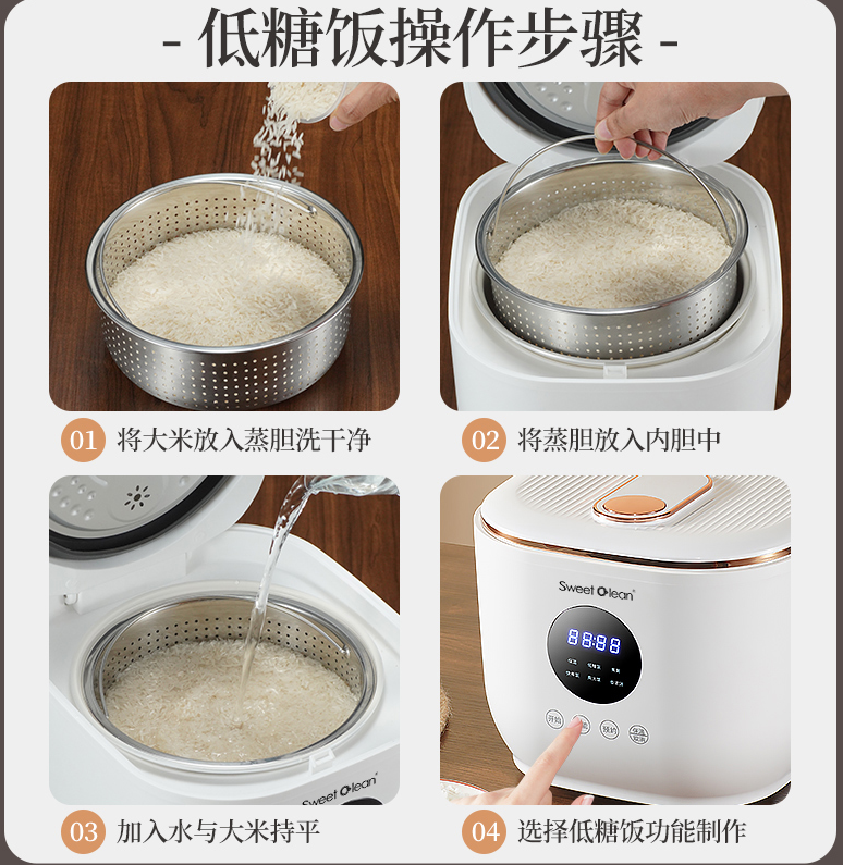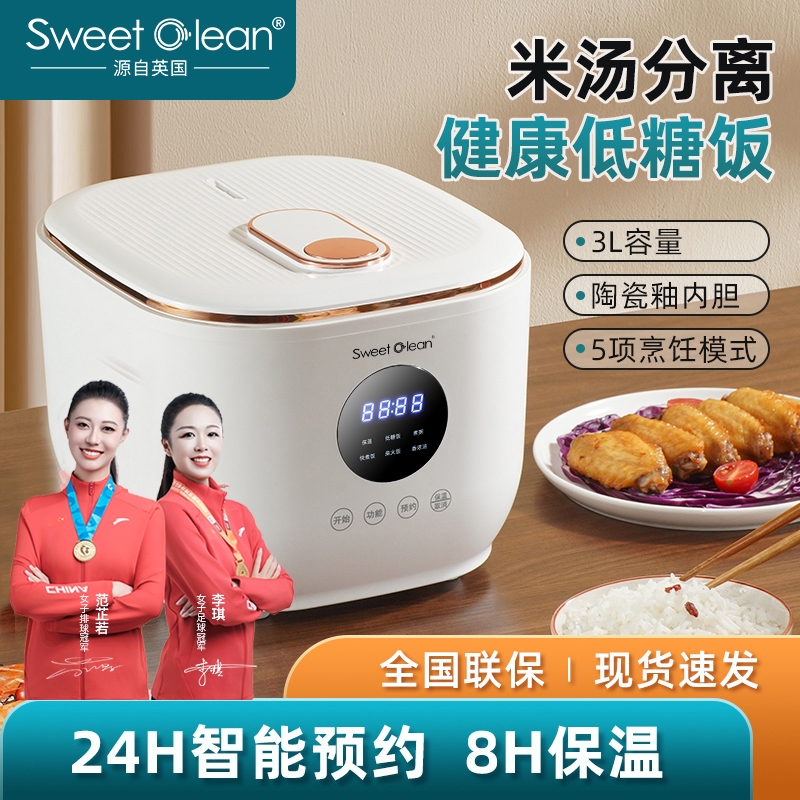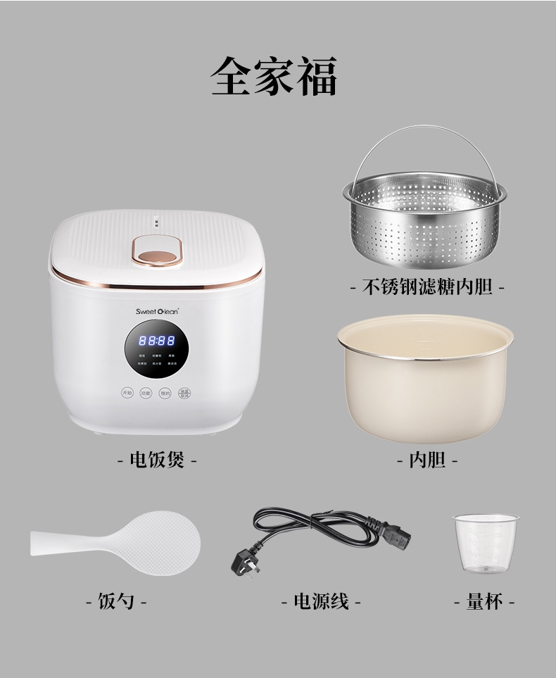 一煮溶出淀粉,二滤米汤分离,三蒸蒸汽蒸熟;智能蒸低糖饭,低糖饮食,减糖不减饭香;双胆设计米汤分离;5项烹饪模式,加厚不粘陶瓷釉内胆 ;,3L黄金容量一人食到六口之家都能满足