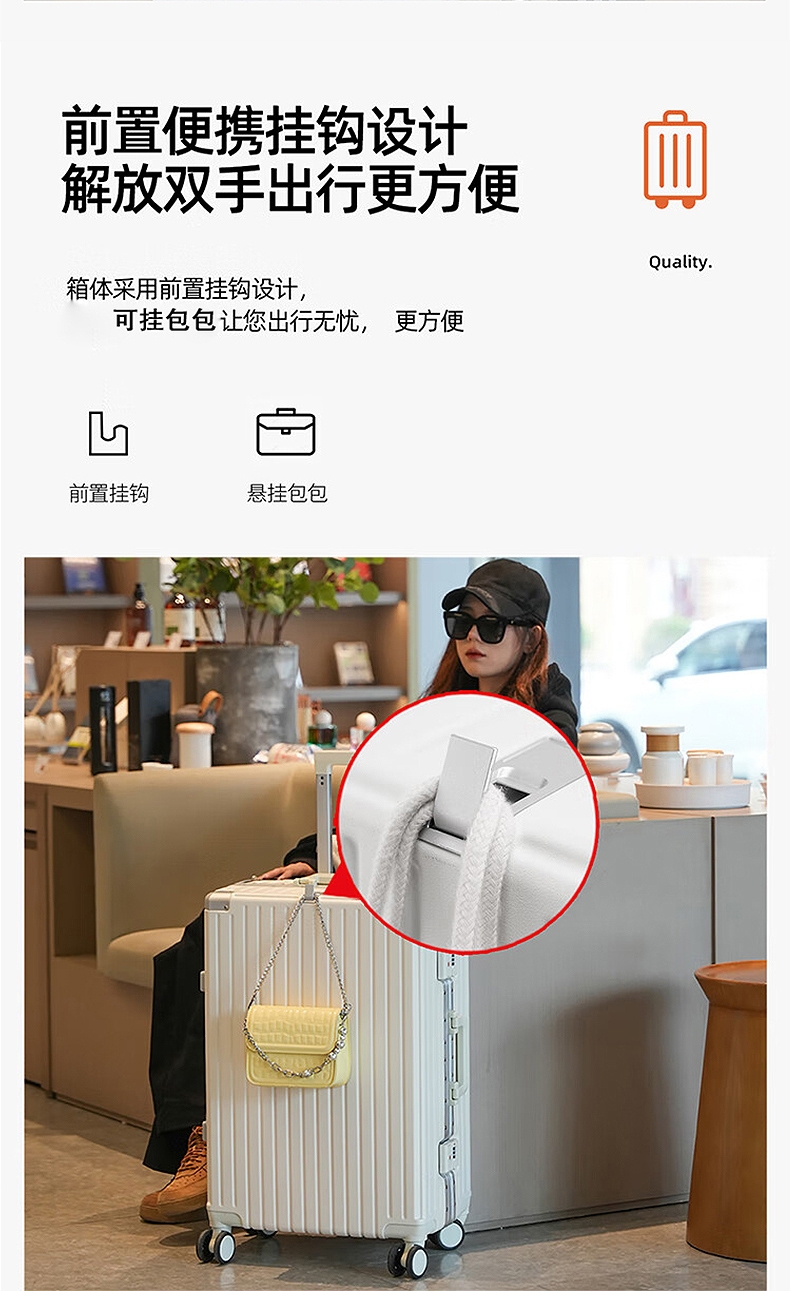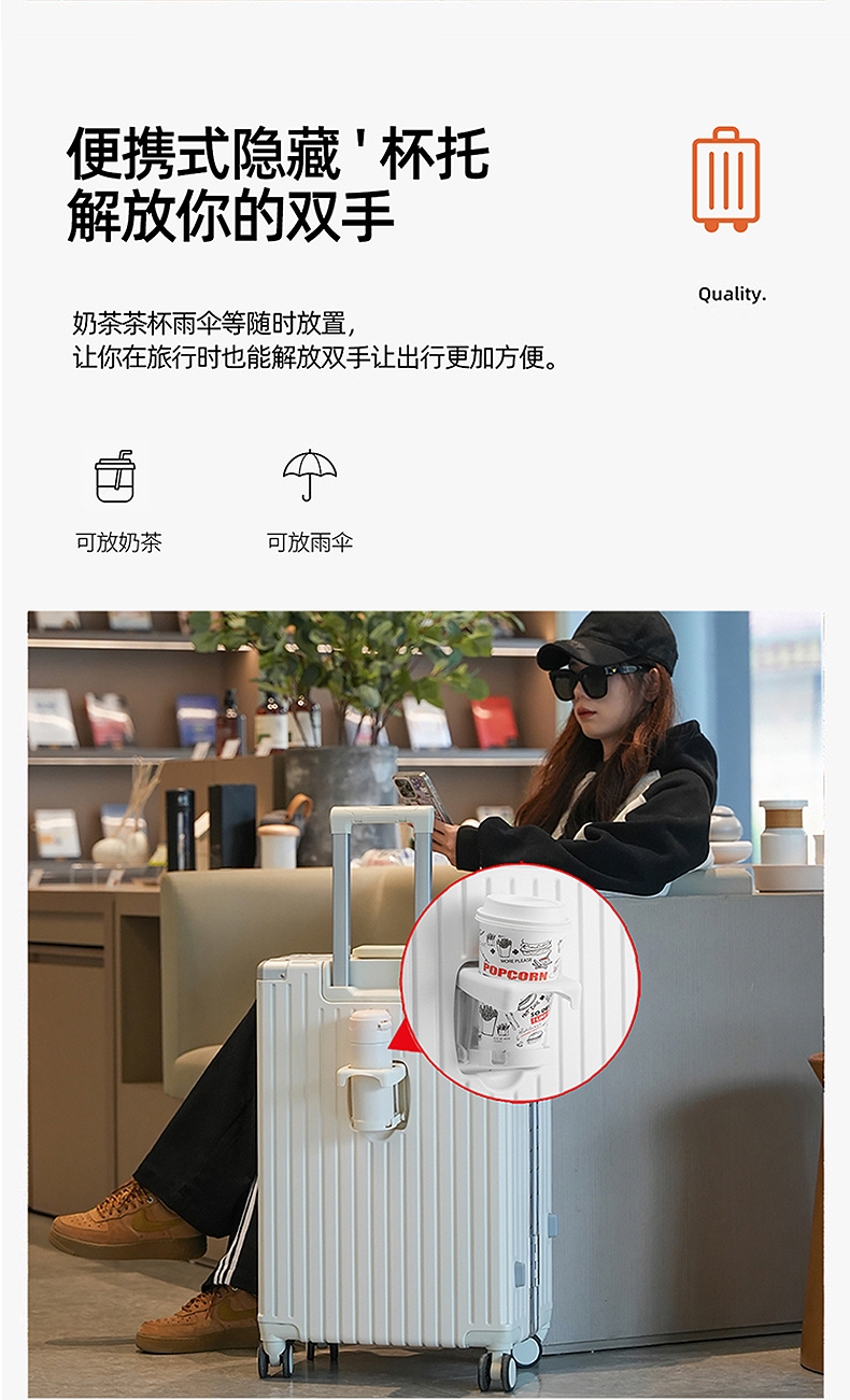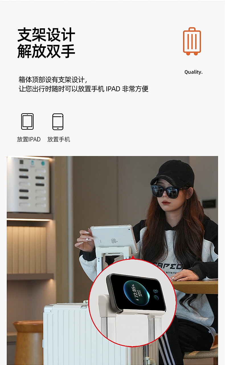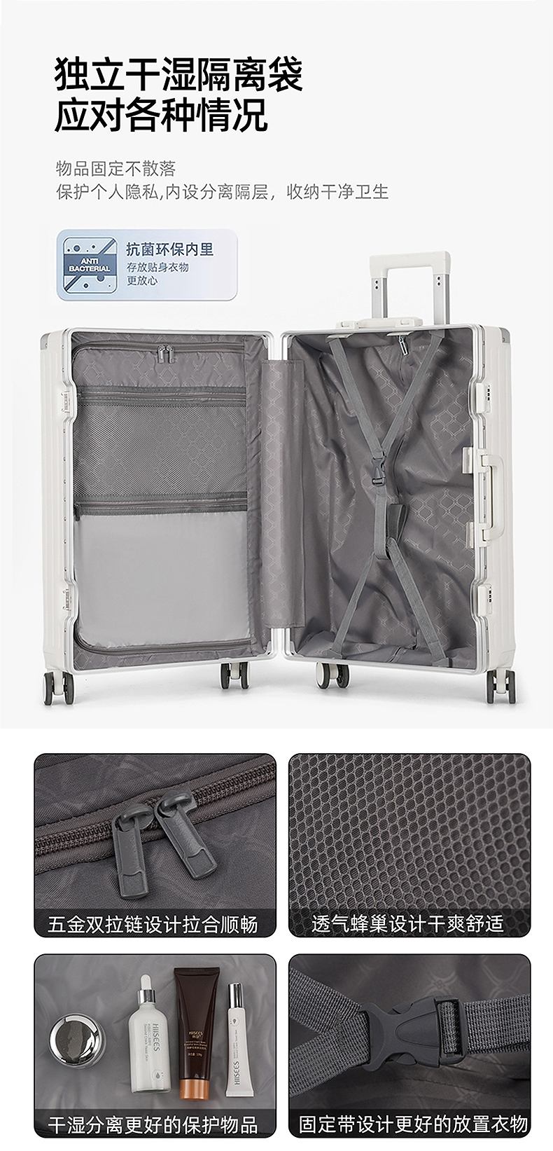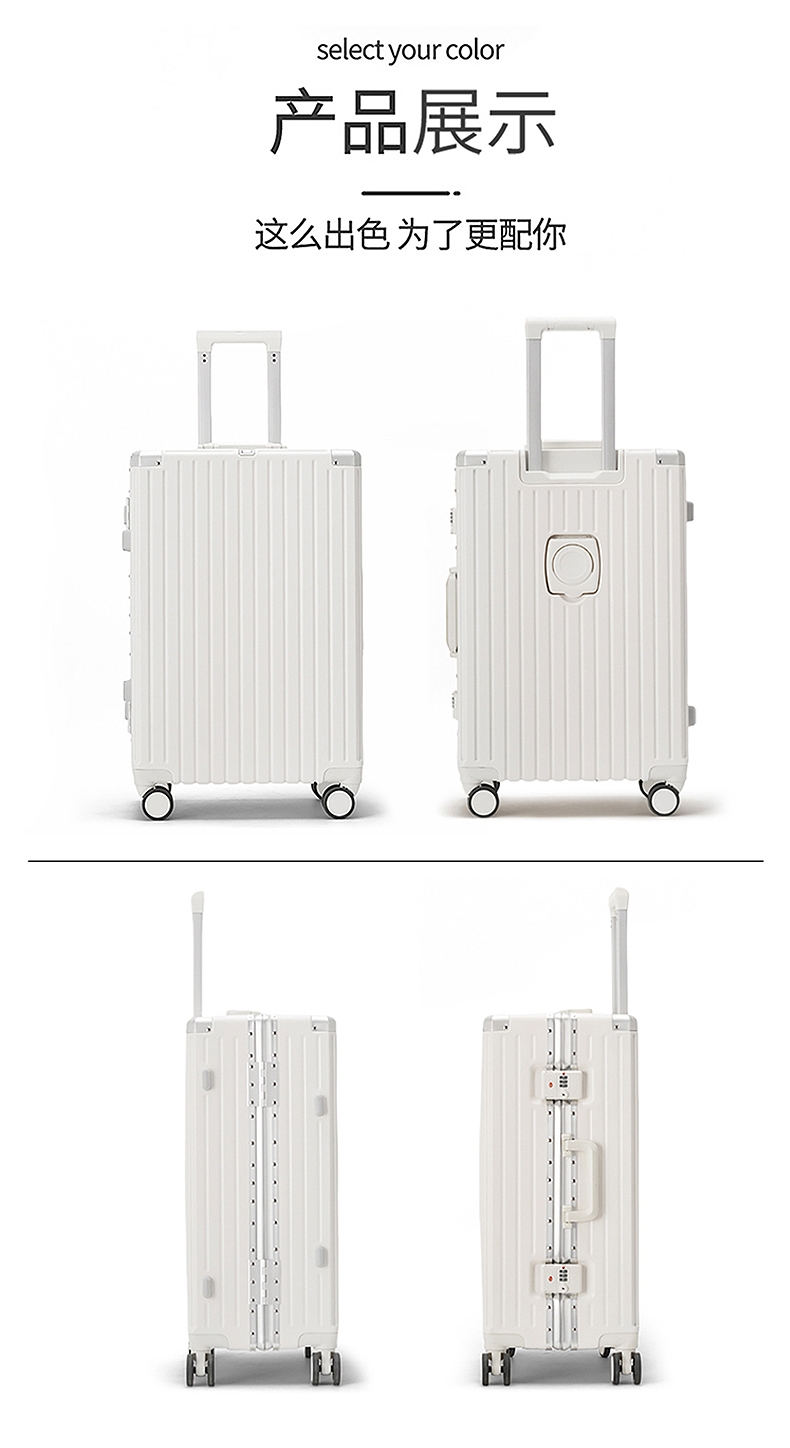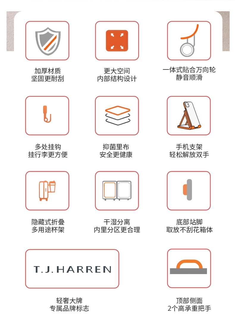 加厚合金伸缩拉杆,稳固顺畅,握手处带手机支架功能;带慢回弹顶部和侧部提手,竖提横提都方便;侧部顶脚及前部带方便行李挂架功能;内里采用抑菌材质,干湿分离,分区合理;双嵌入式三码密码锁,安全性高,放心旅行