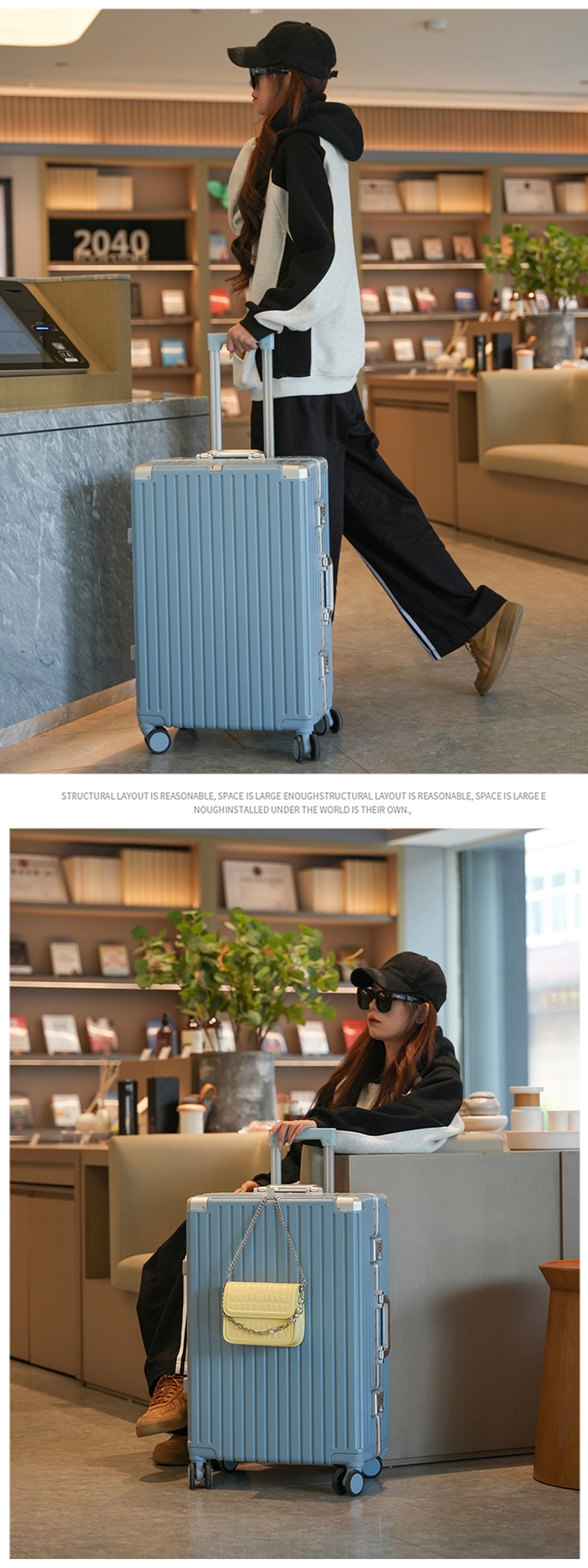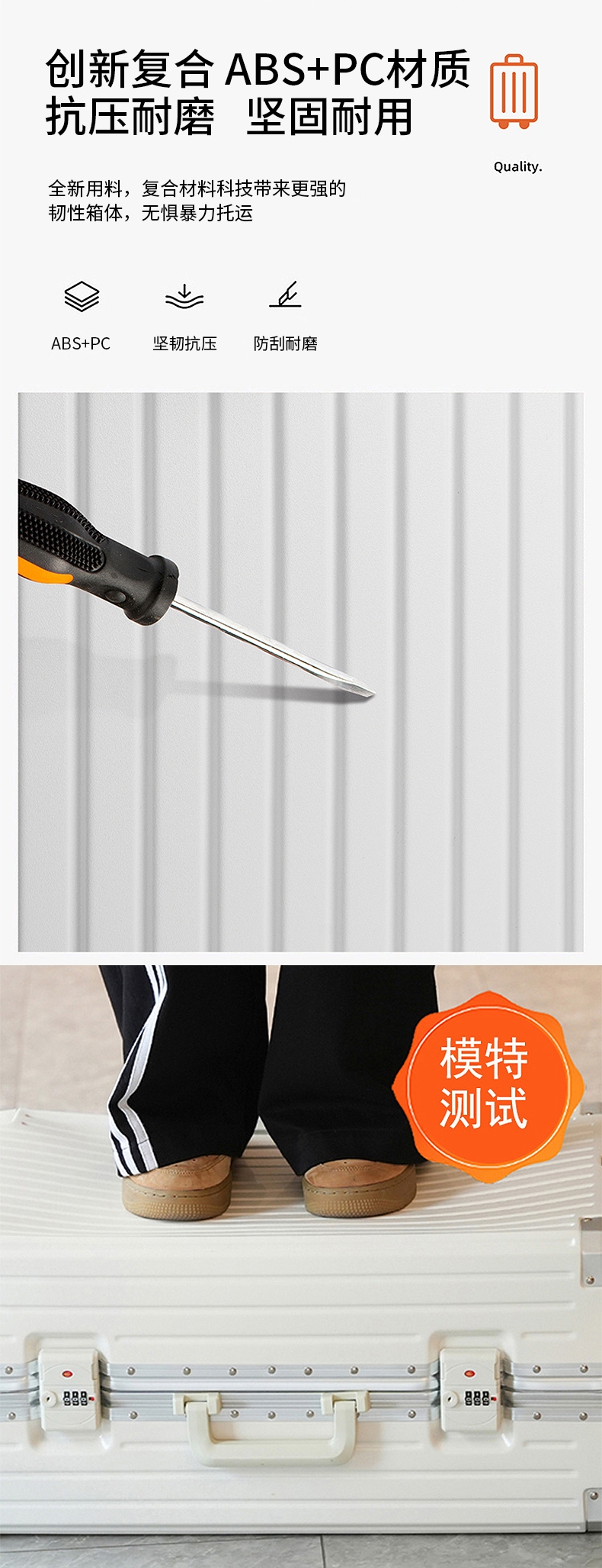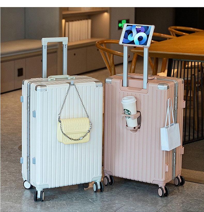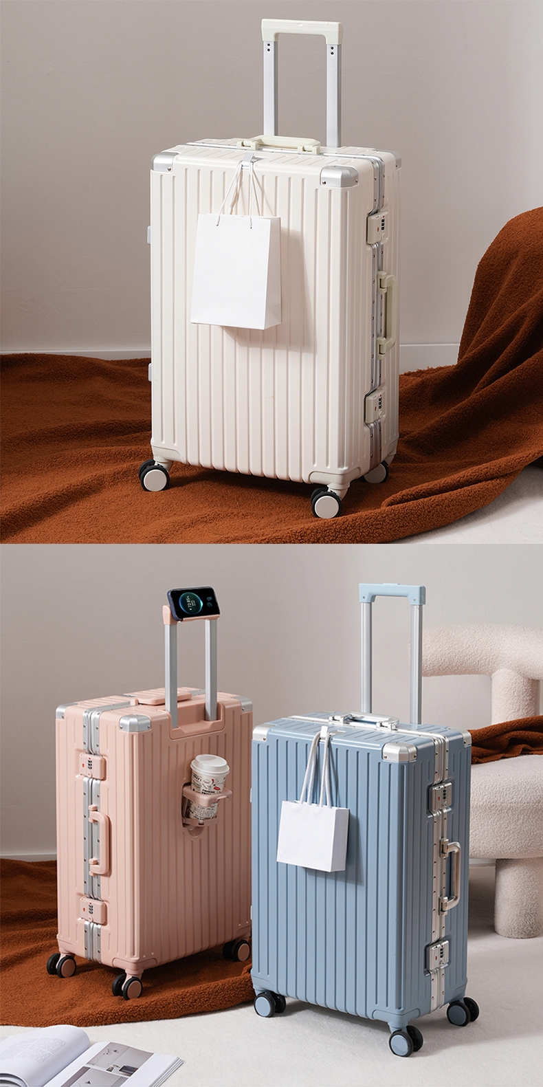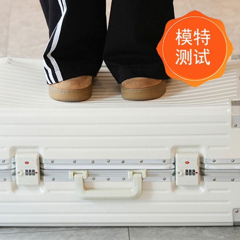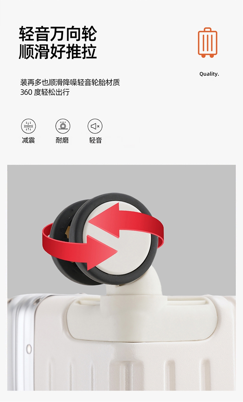 加厚合金伸缩拉杆,稳固顺畅,握手处带手机支架功能;带慢回弹顶部和侧部提手,竖提横提都方便;侧部顶脚及前部带方便行李挂架功能;内里采用抑菌材质,干湿分离,分区合理;双嵌入式三码密码锁,安全性高,放心旅行