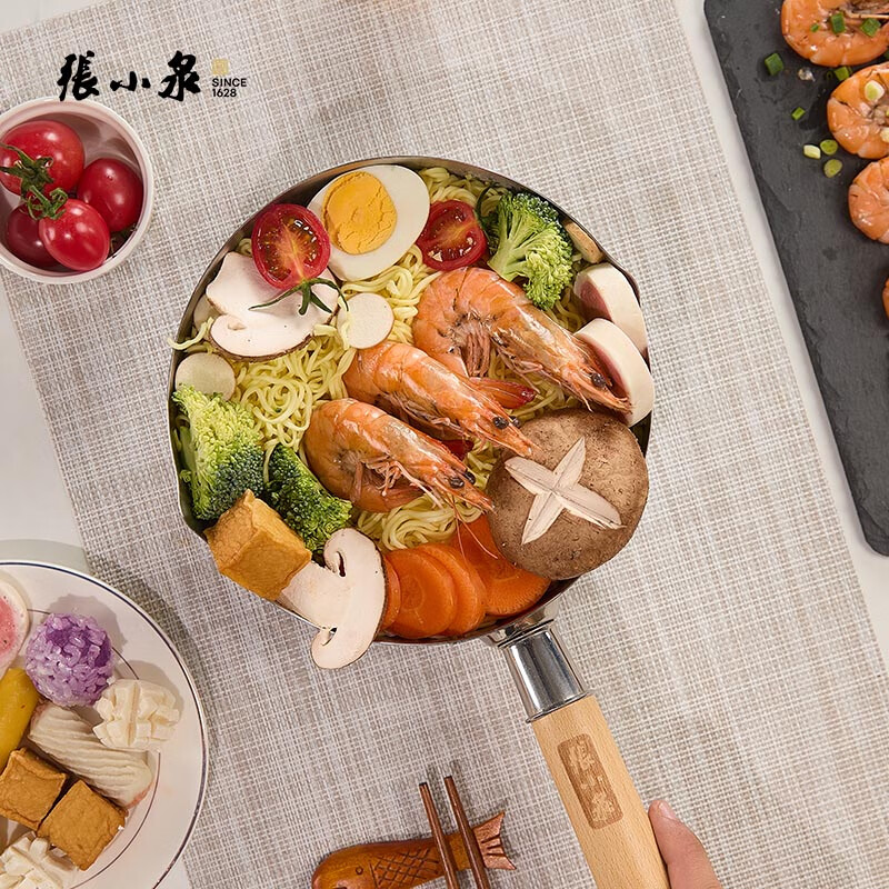 一锅多用,煮面,煮牛奶,煲汤,煎炸小食;锅身蜂窝纹设计,造型美观,防止溢出;平底锅身,两端导流口设计,方便倒汤;锅内标注刻度,有效控制水量;精选实木手柄,有效隔热防烫,末端三角挂钩,方便挂放