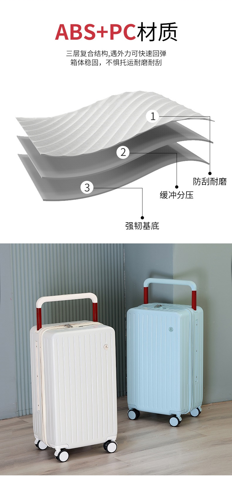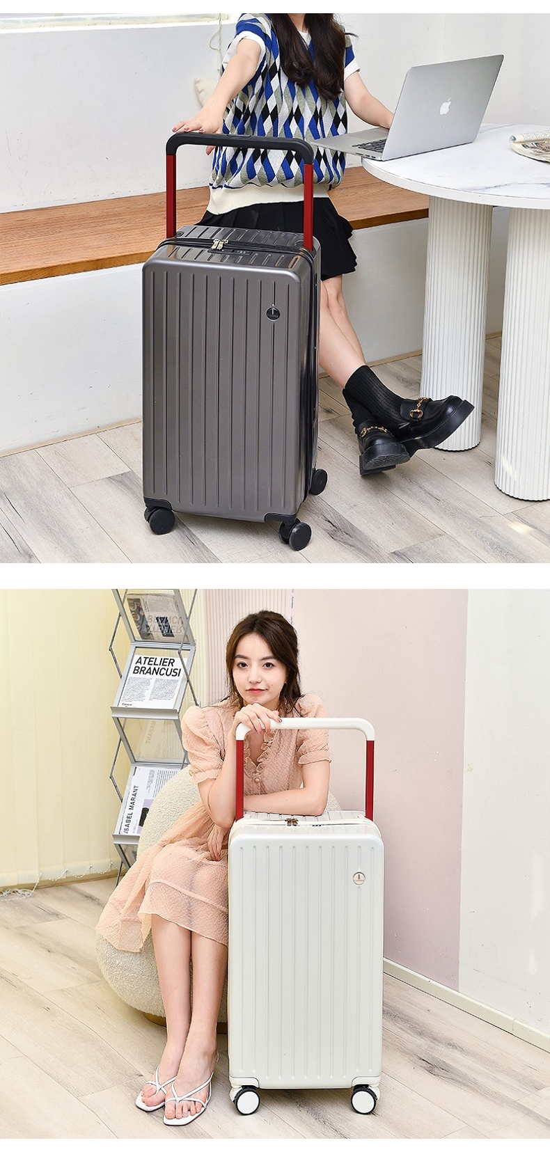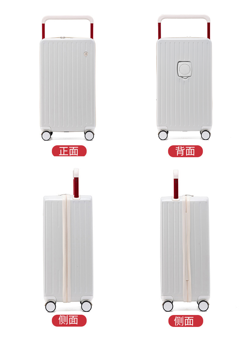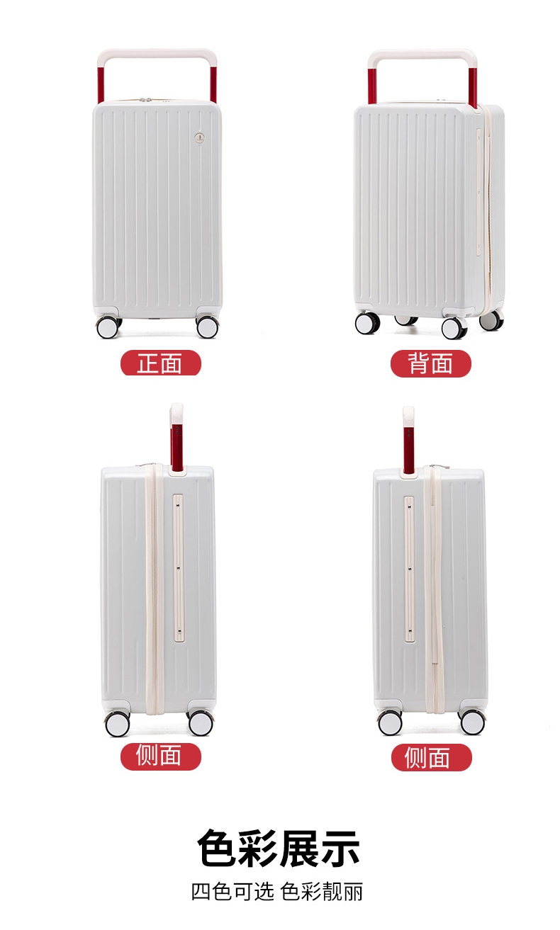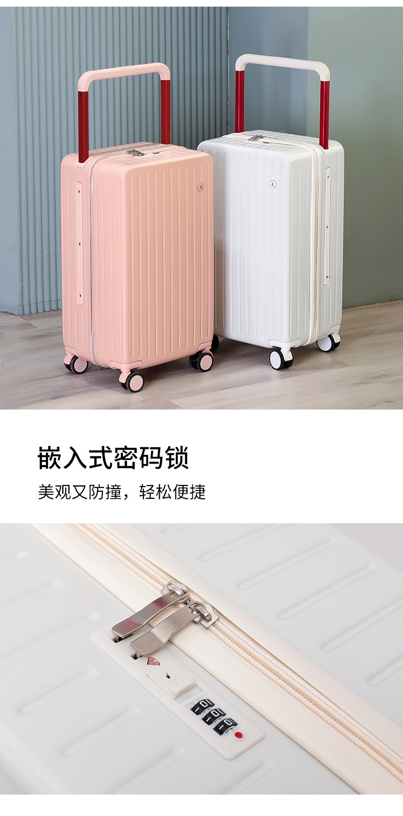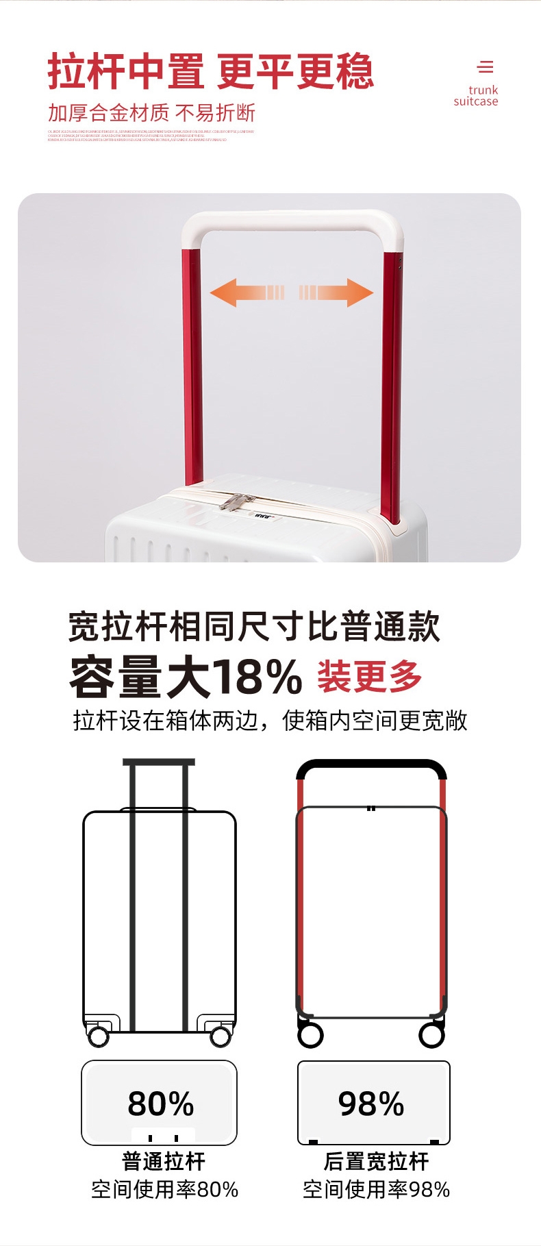 撞色宽体设计,时尚简约,气质典雅;宽体内空间比传统拉杆箱更大更平整;耐用合金拉杆,舒适手提,坚固顺滑;三码安全密码锁,一路旅途安全放心;防刮坚固耐磨花箱体,无惧旅途颠簸