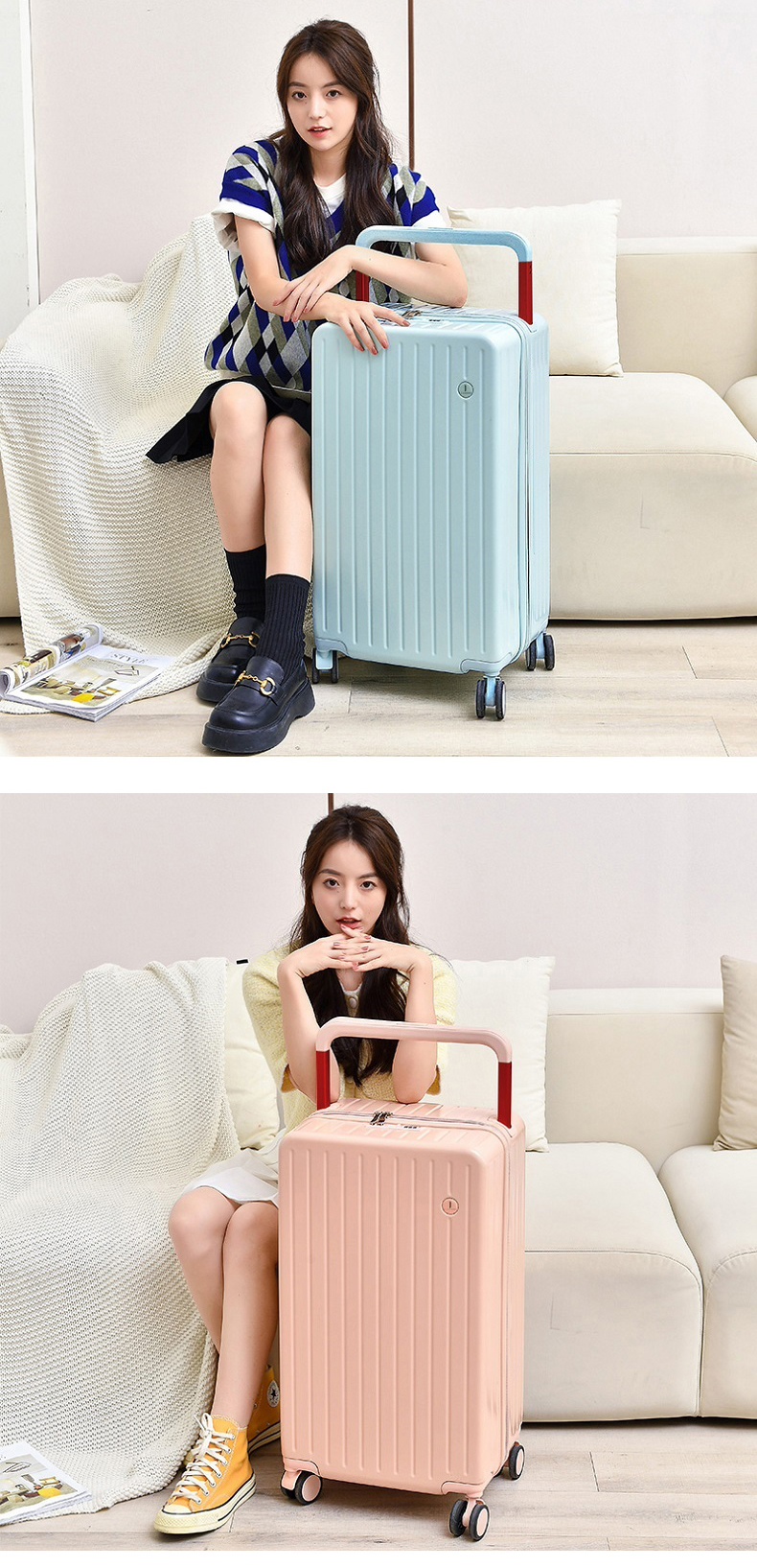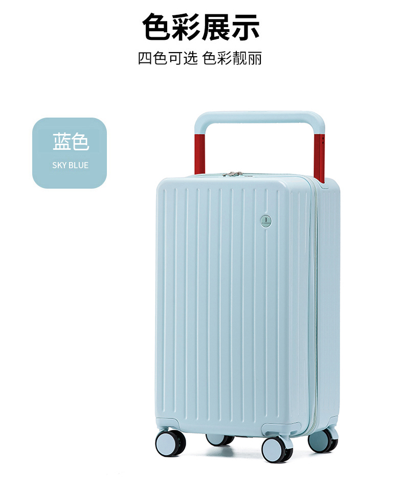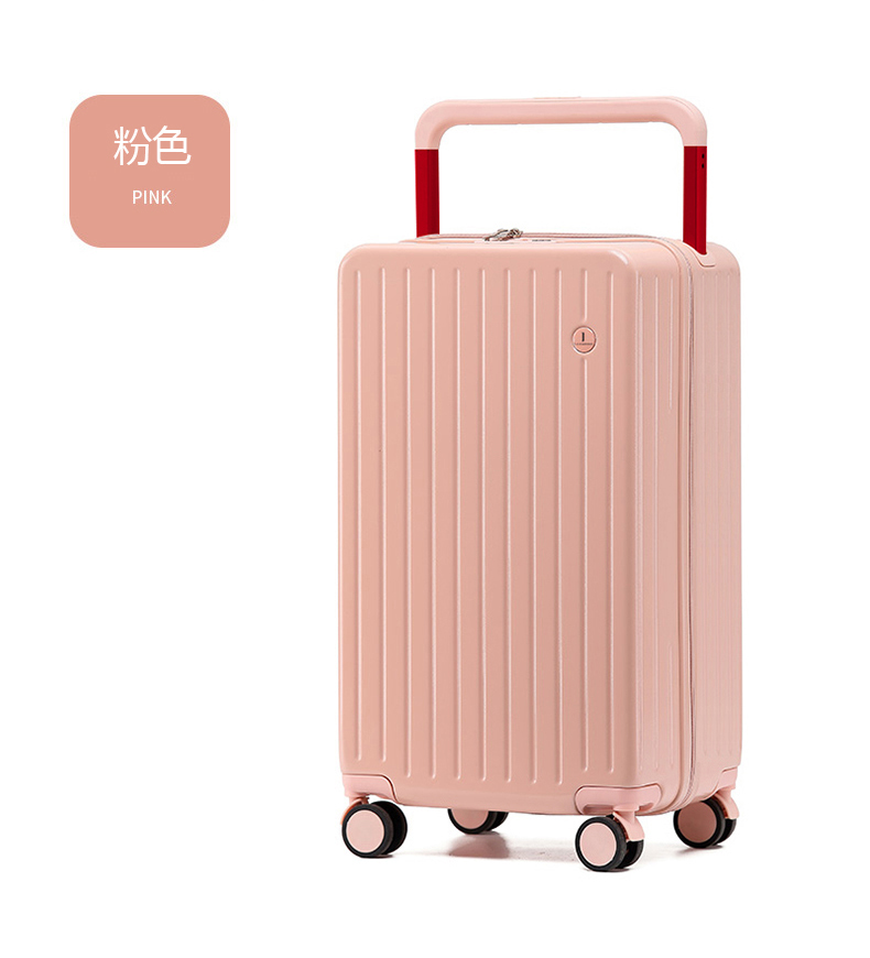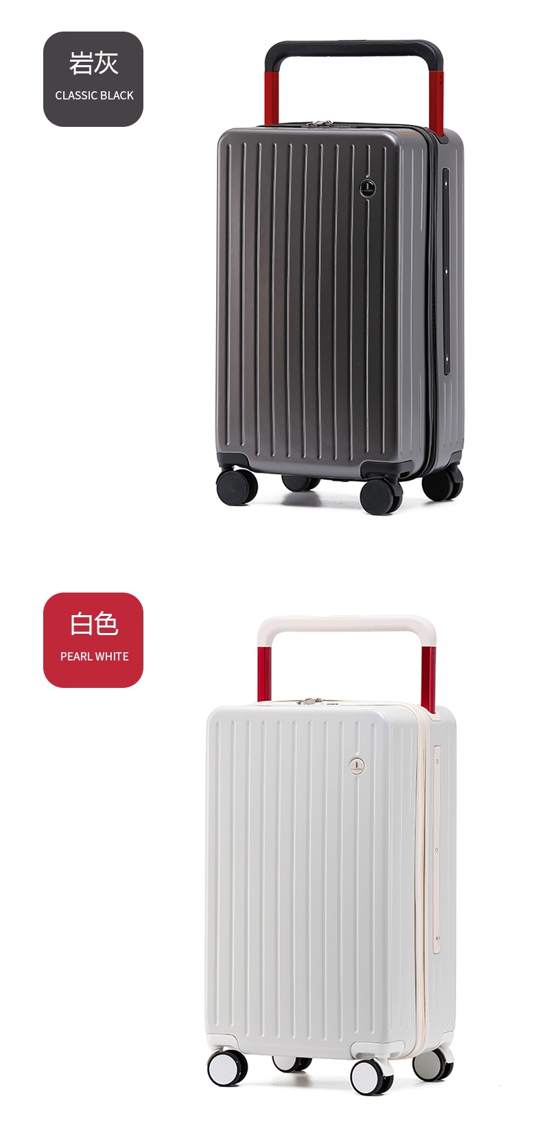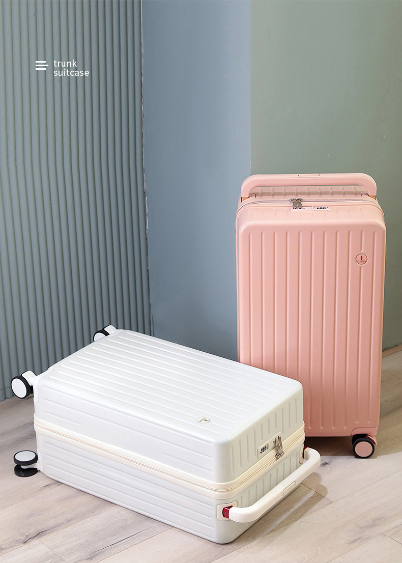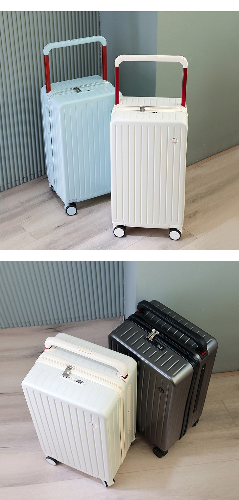 撞色宽体设计,时尚简约,气质典雅;宽体内空间比传统拉杆箱更大更平整;耐用合金拉杆,舒适手提,坚固顺滑;三码安全密码锁,一路旅途安全放心;防刮坚固耐磨花箱体,无惧旅途颠簸