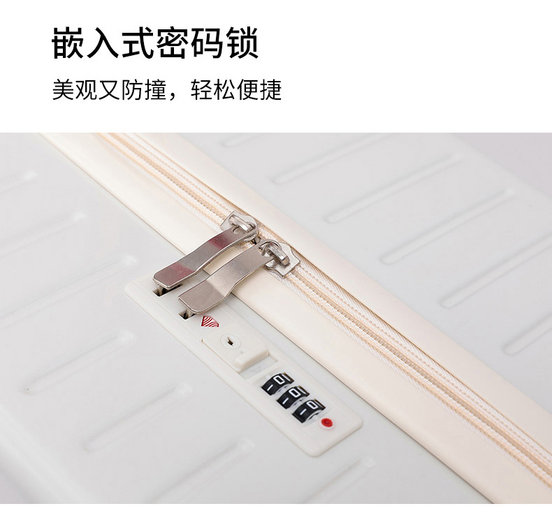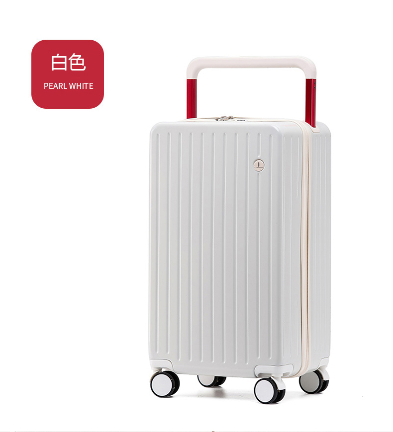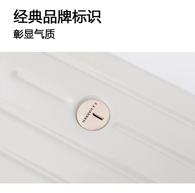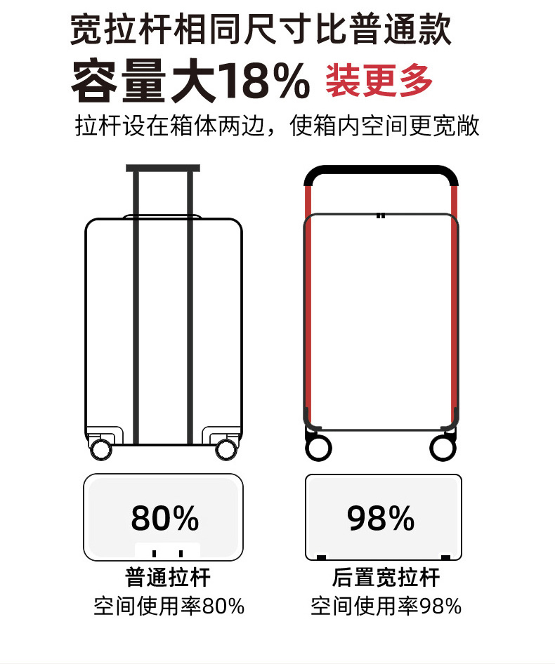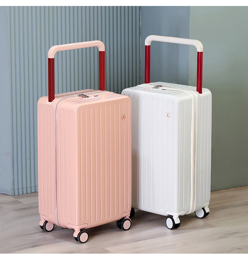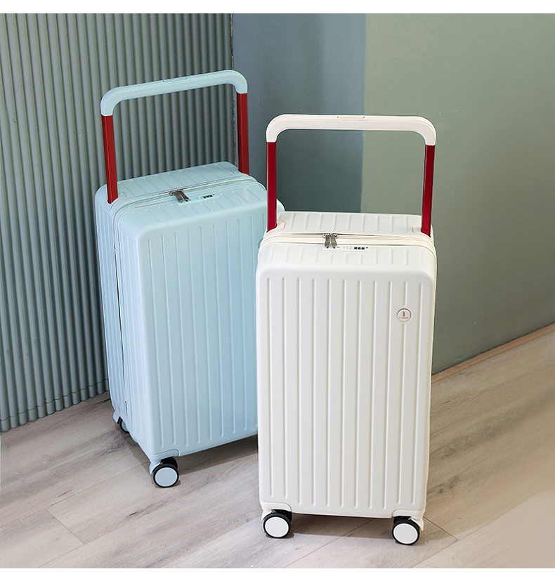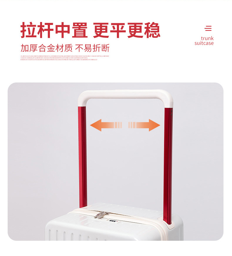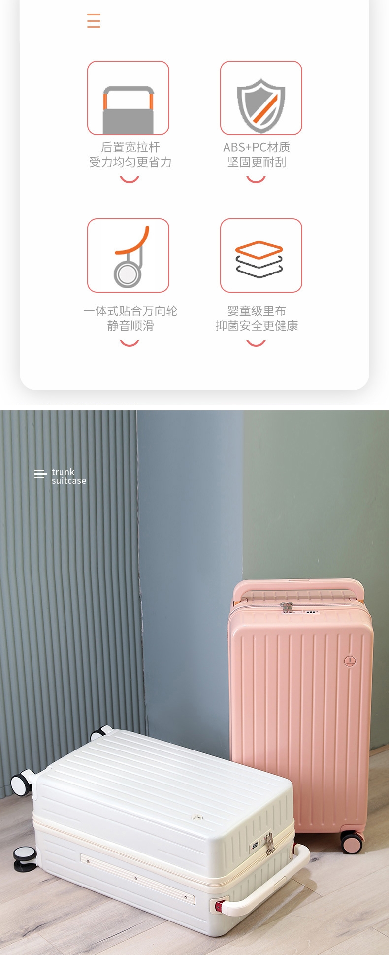 撞色宽体设计,时尚简约,气质典雅;宽体内空间比传统拉杆箱更大更平整;耐用合金拉杆,舒适手提,坚固顺滑;三码安全密码锁,一路旅途安全放心;防刮坚固耐磨花箱体,无惧旅途颠簸