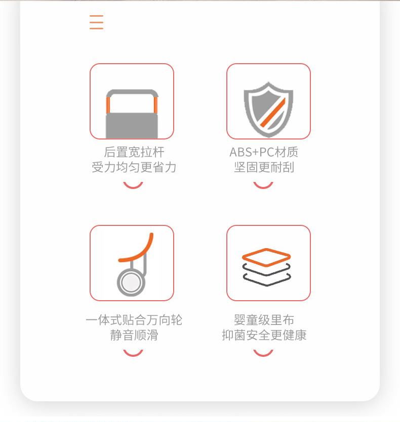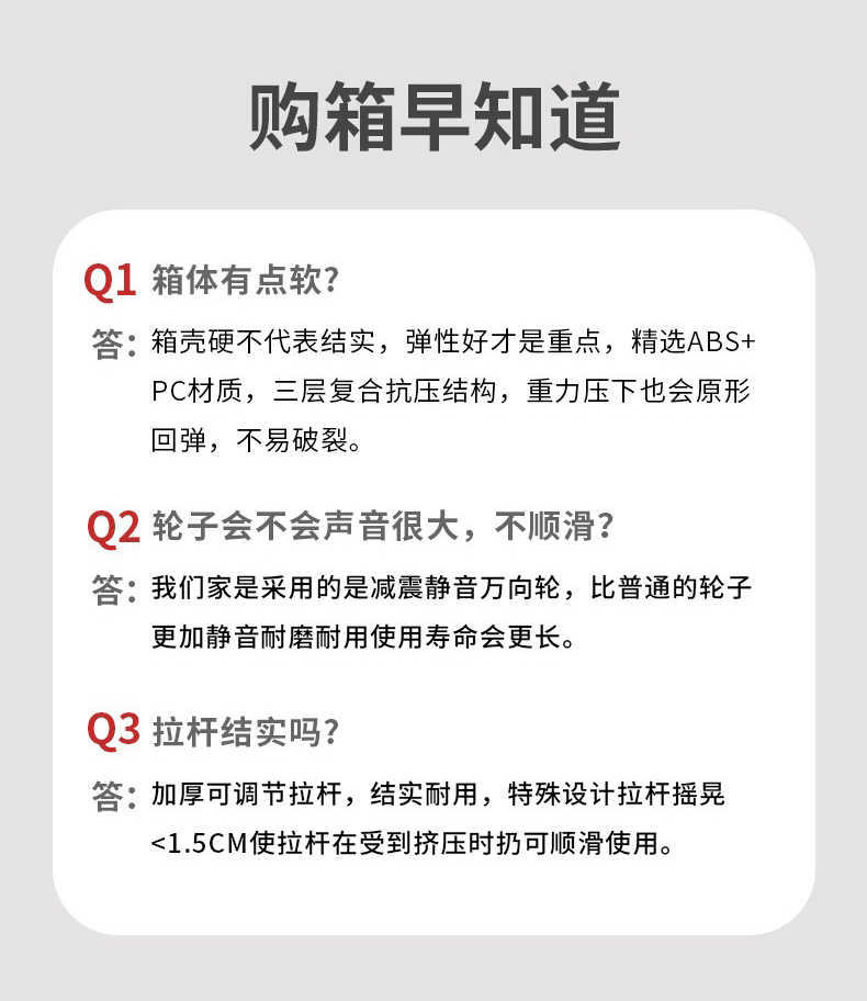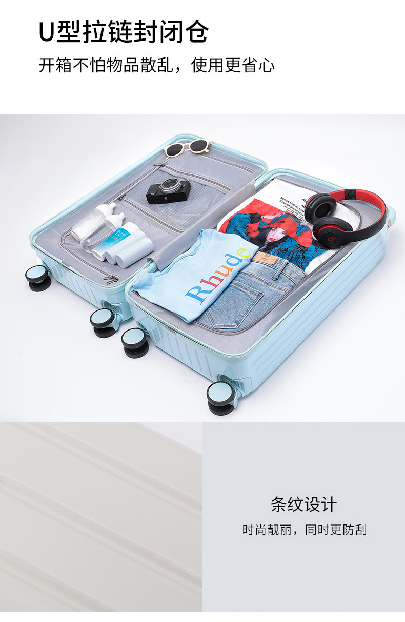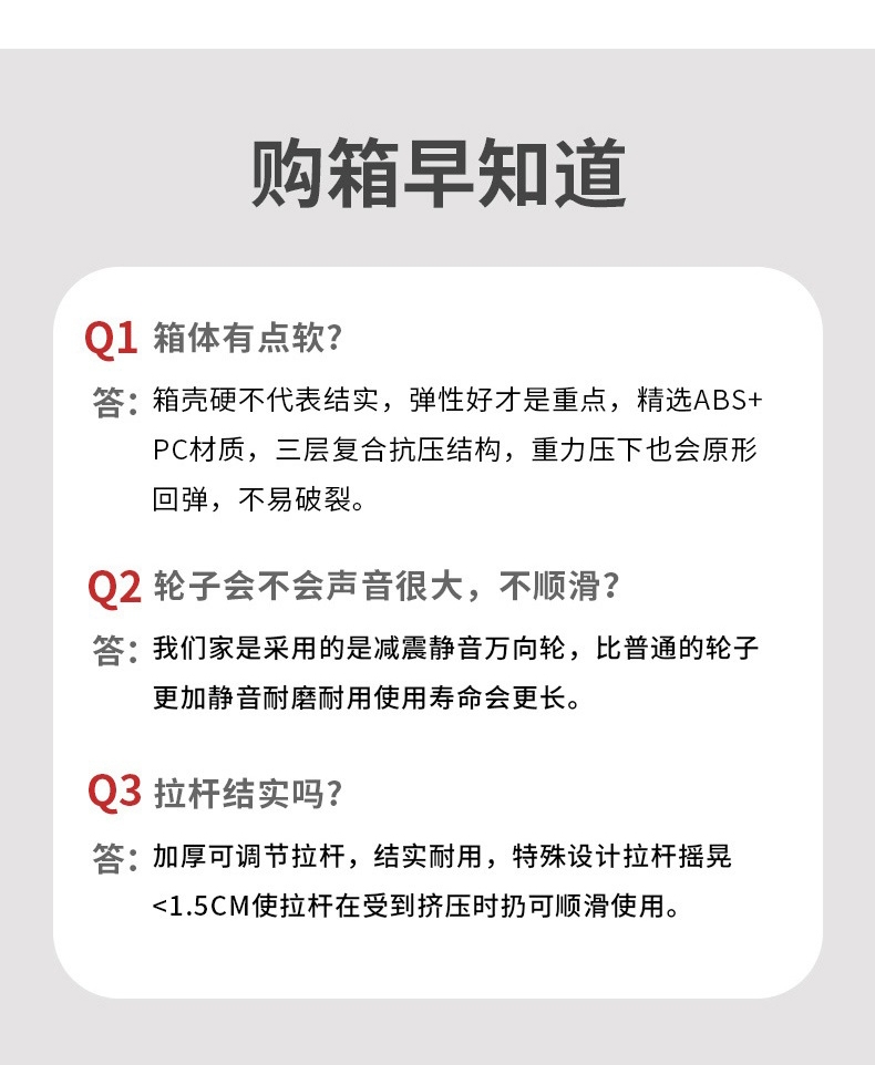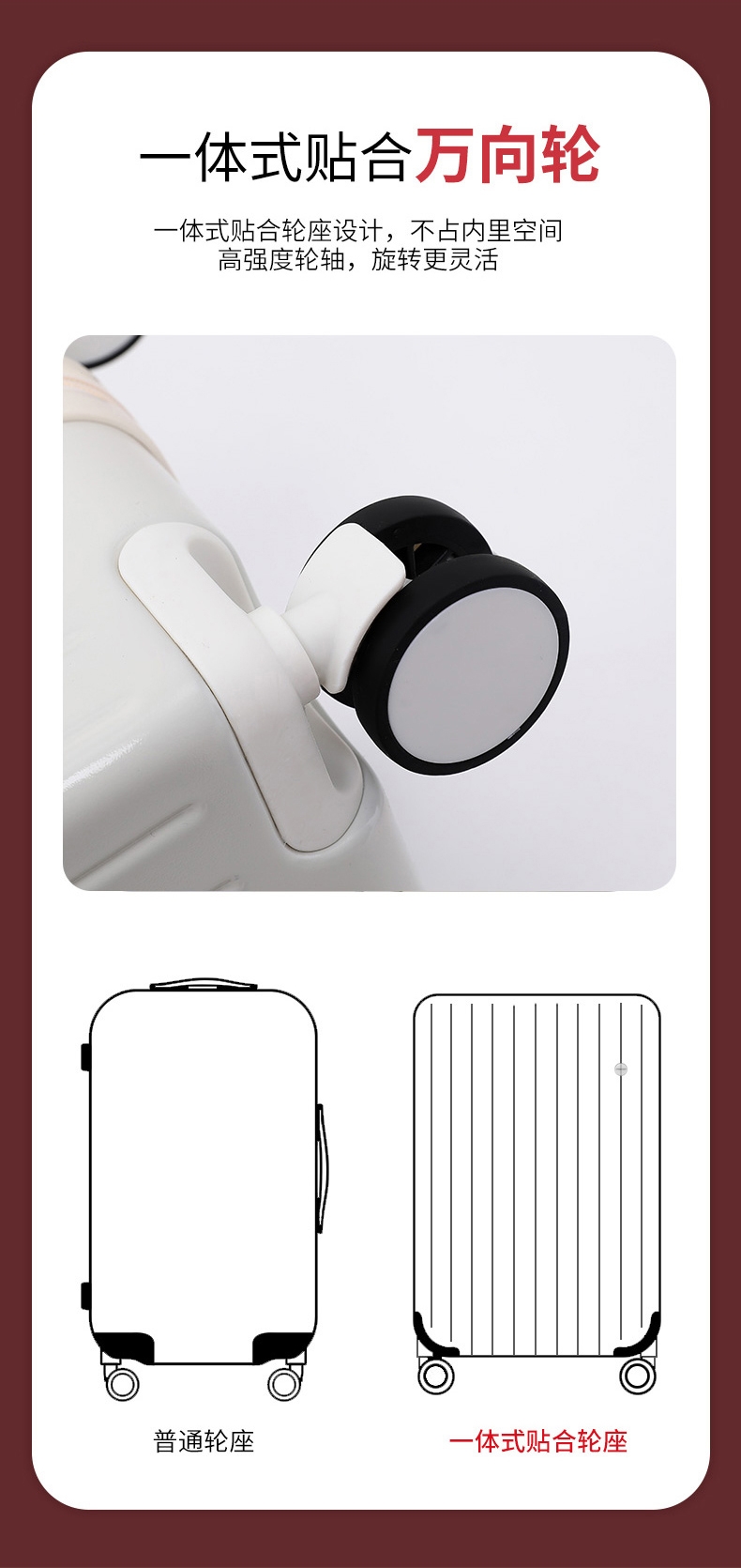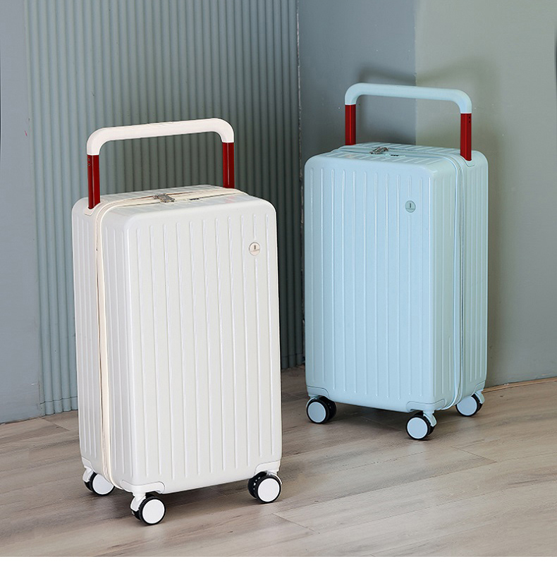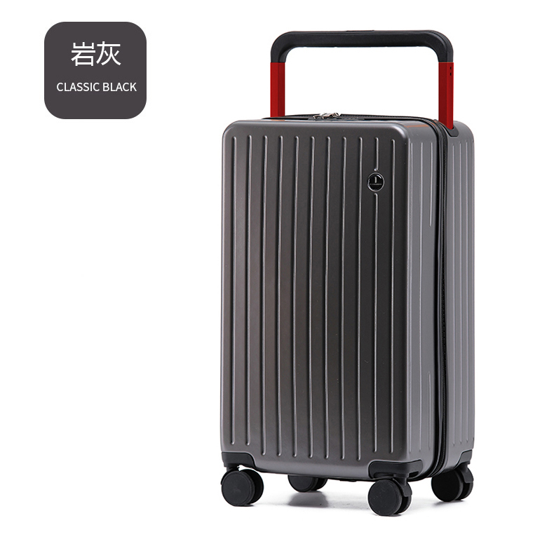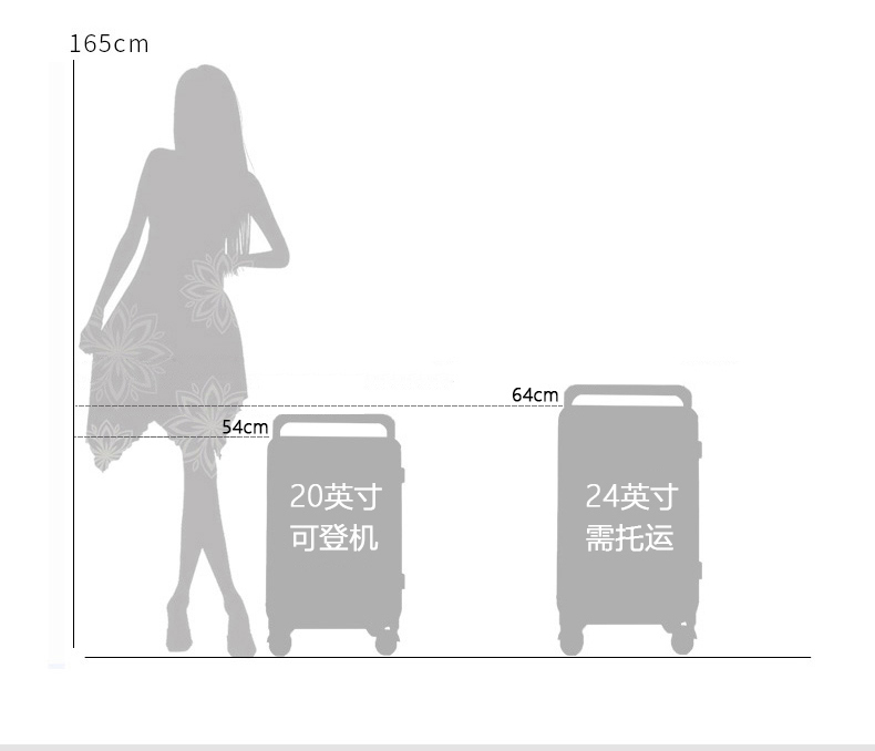 撞色宽体设计,时尚简约,气质典雅;宽体内空间比传统拉杆箱更大更平整;耐用合金拉杆,舒适手提,坚固顺滑;三码安全密码锁,一路旅途安全放心;防刮坚固耐磨花箱体,无惧旅途颠簸