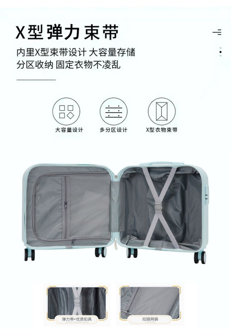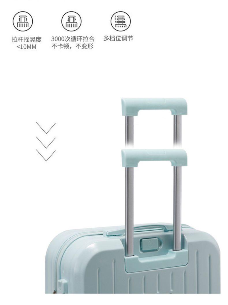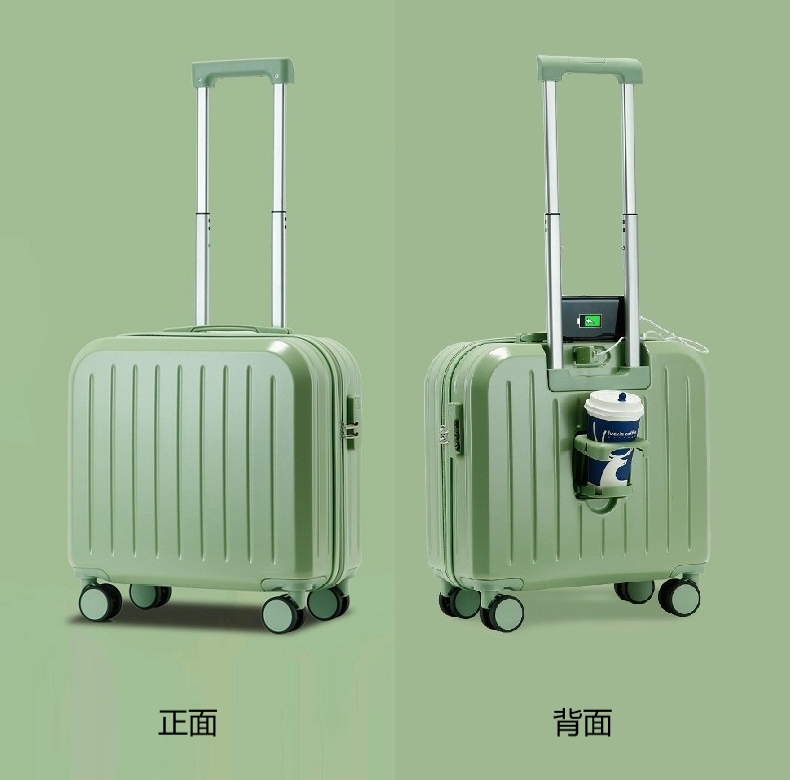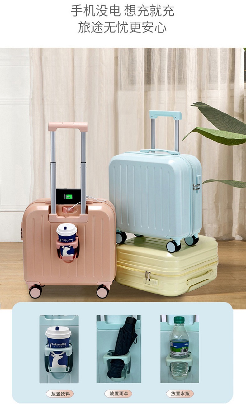 带杯架和USB充电接口,出行更便捷;耐用合金拉杆,舒适手提,坚固顺滑;三码安全密码锁,一路旅途安全放心;防刮花坚固耐磨箱体,无惧旅途颠簸;