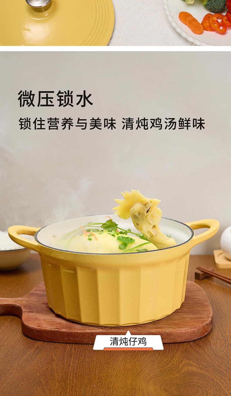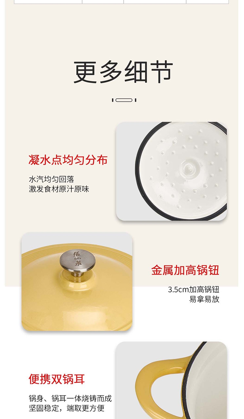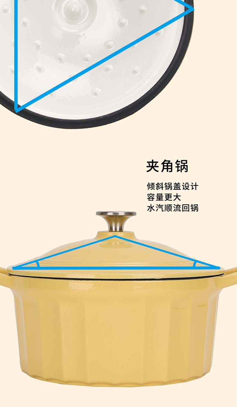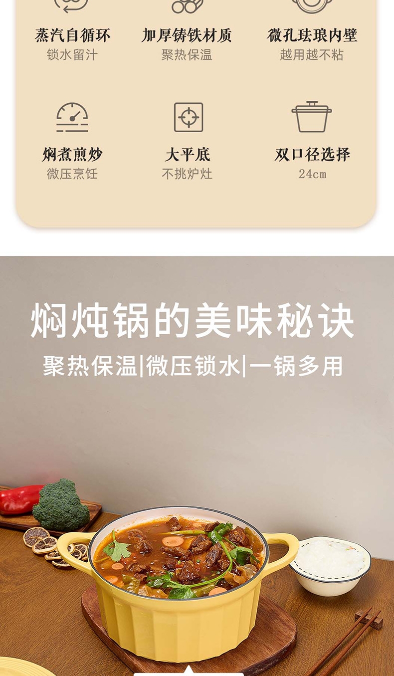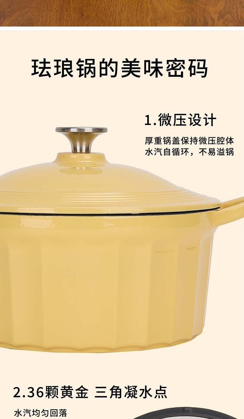 焖炖烤煎煮,一锅搞定;加厚铸铁基材,聚热保温;蒸汽自循环,锁水留汁;微孔珐琅内壁,越用越不粘;大平底不挑灶具;36颗黄金三角凝水点