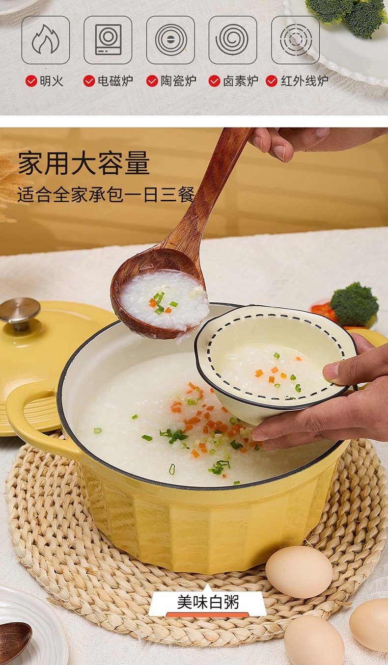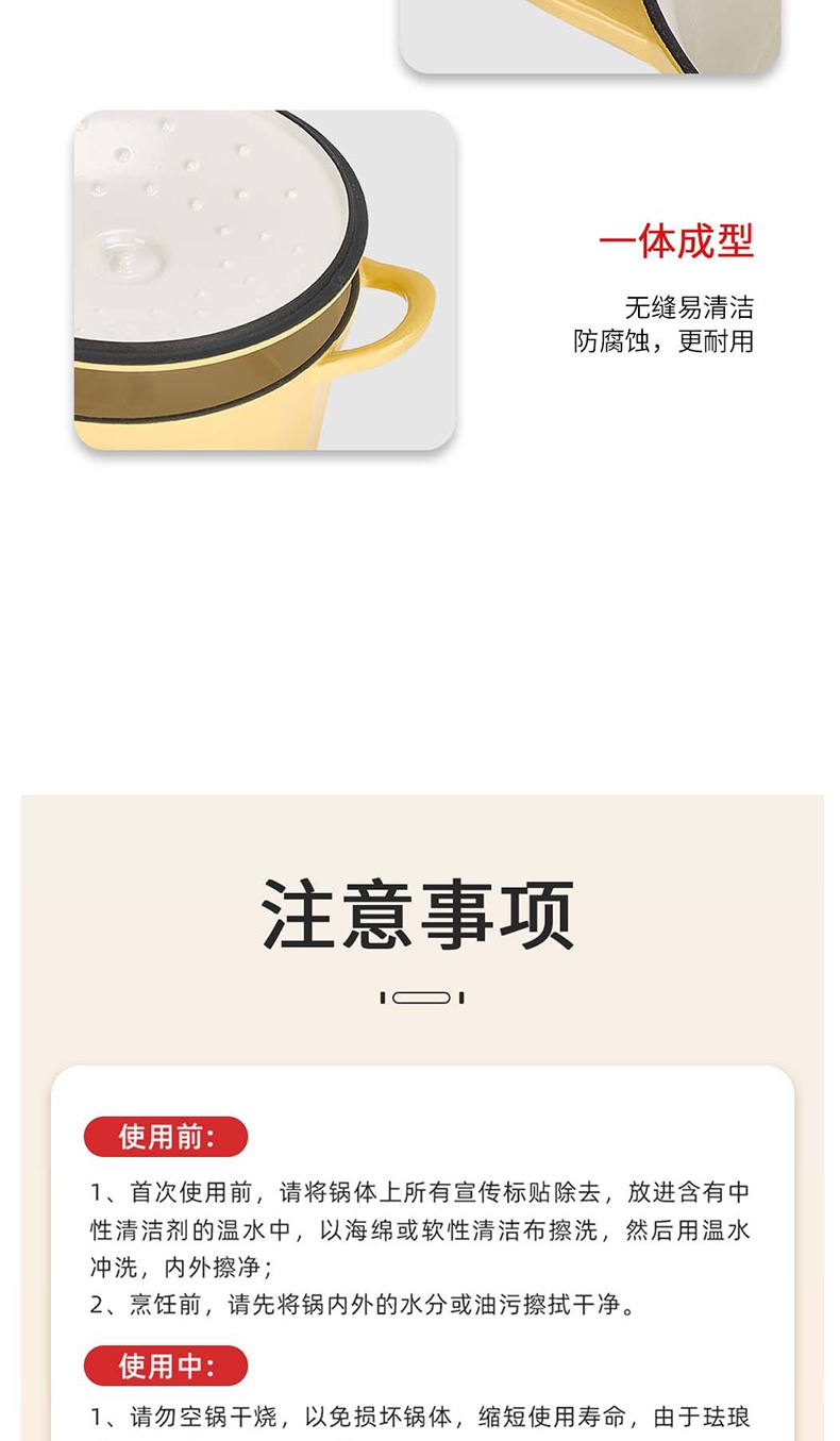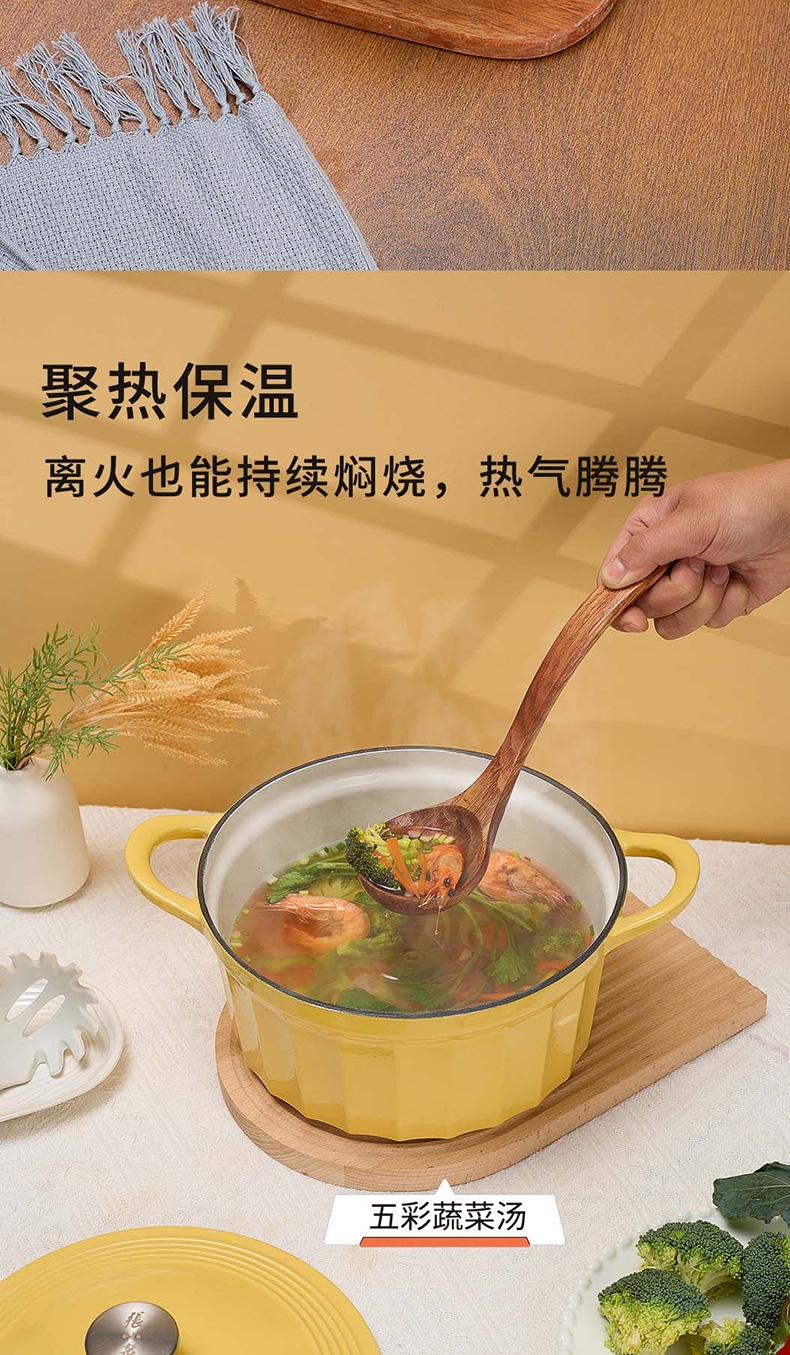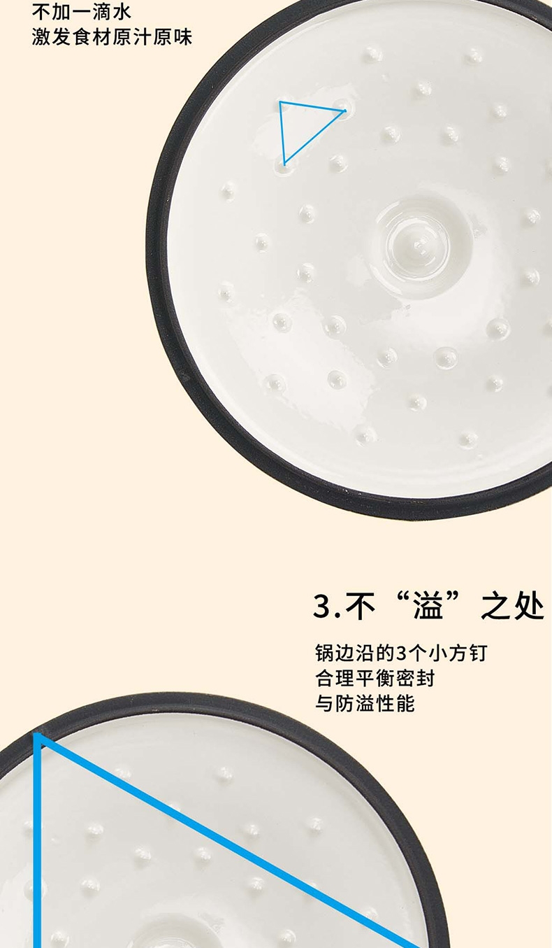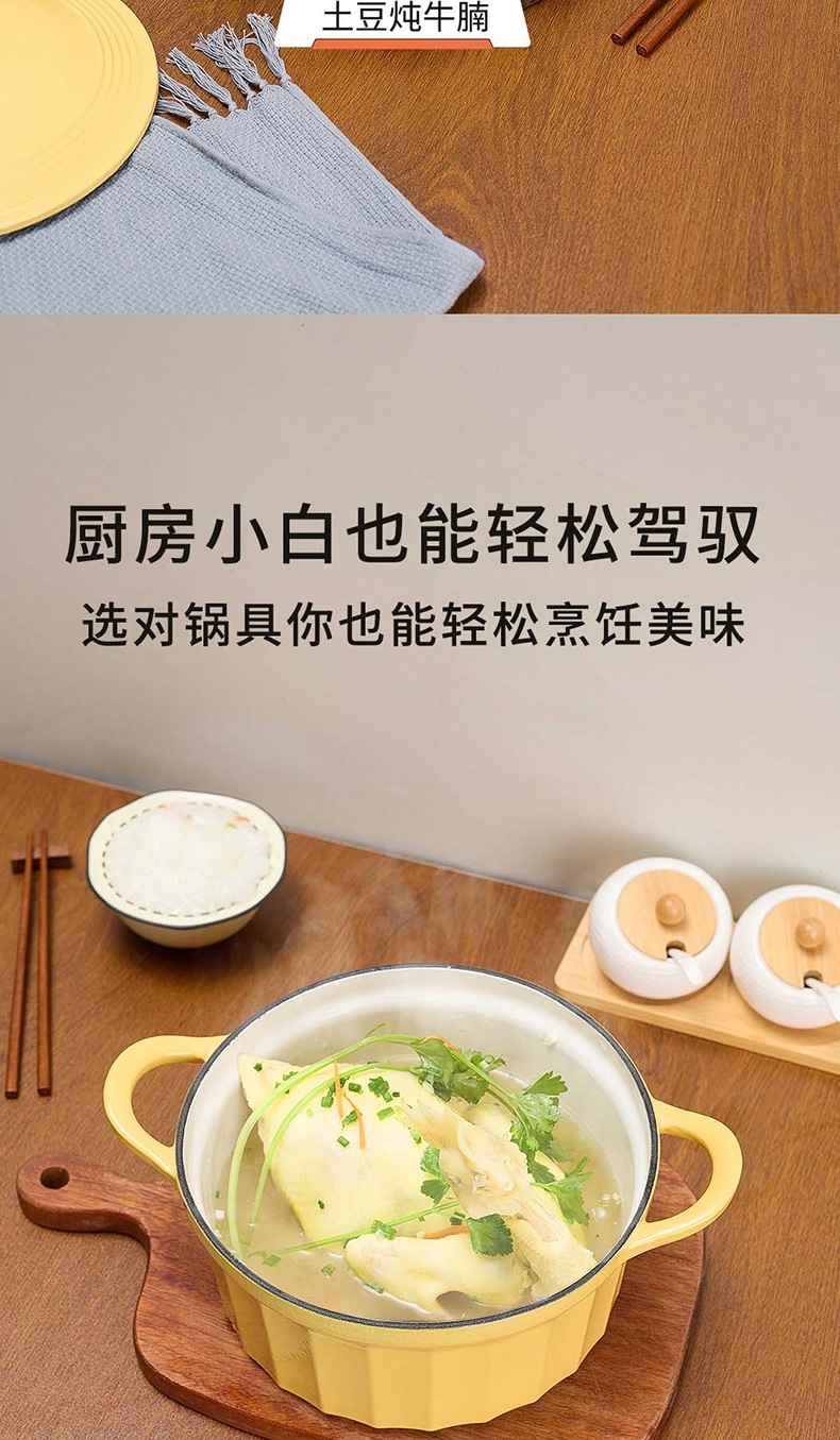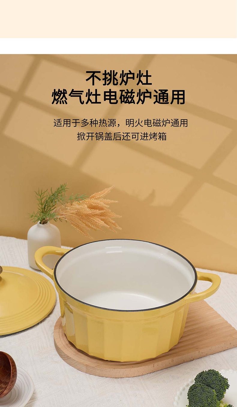 焖炖烤煎煮,一锅搞定;加厚铸铁基材,聚热保温;蒸汽自循环,锁水留汁;微孔珐琅内壁,越用越不粘;大平底不挑灶具;36颗黄金三角凝水点