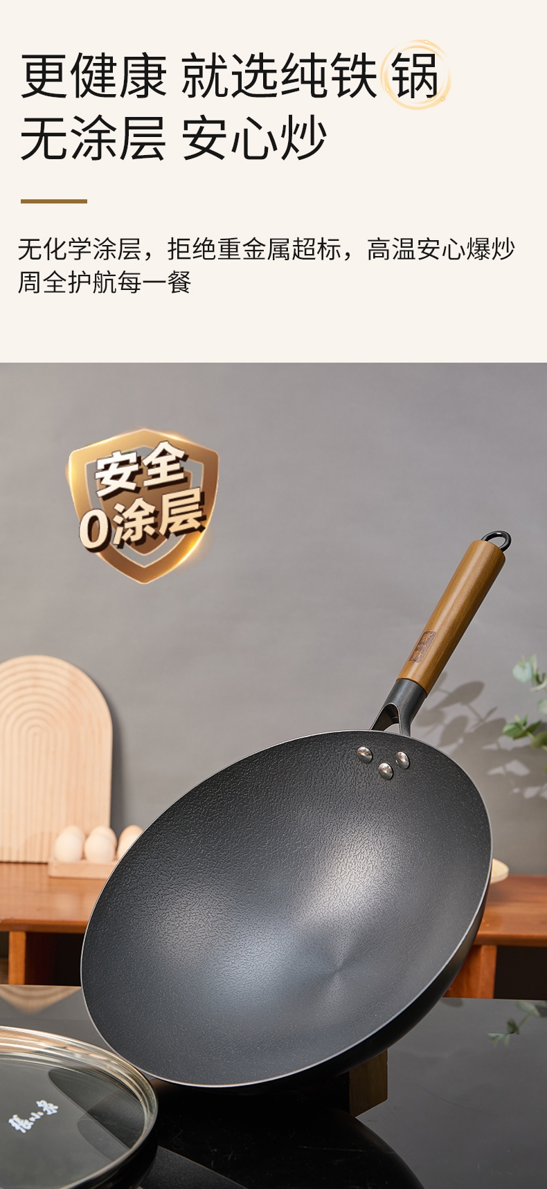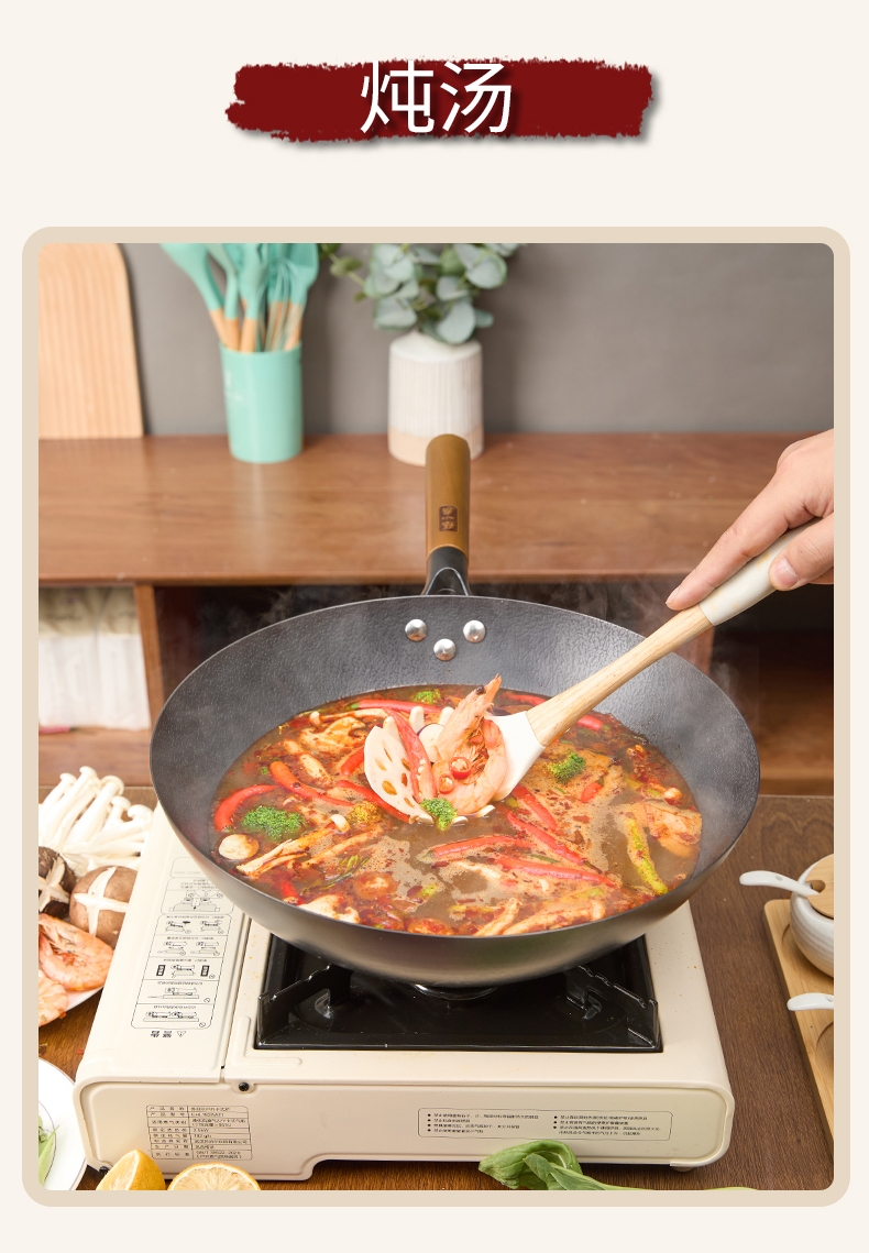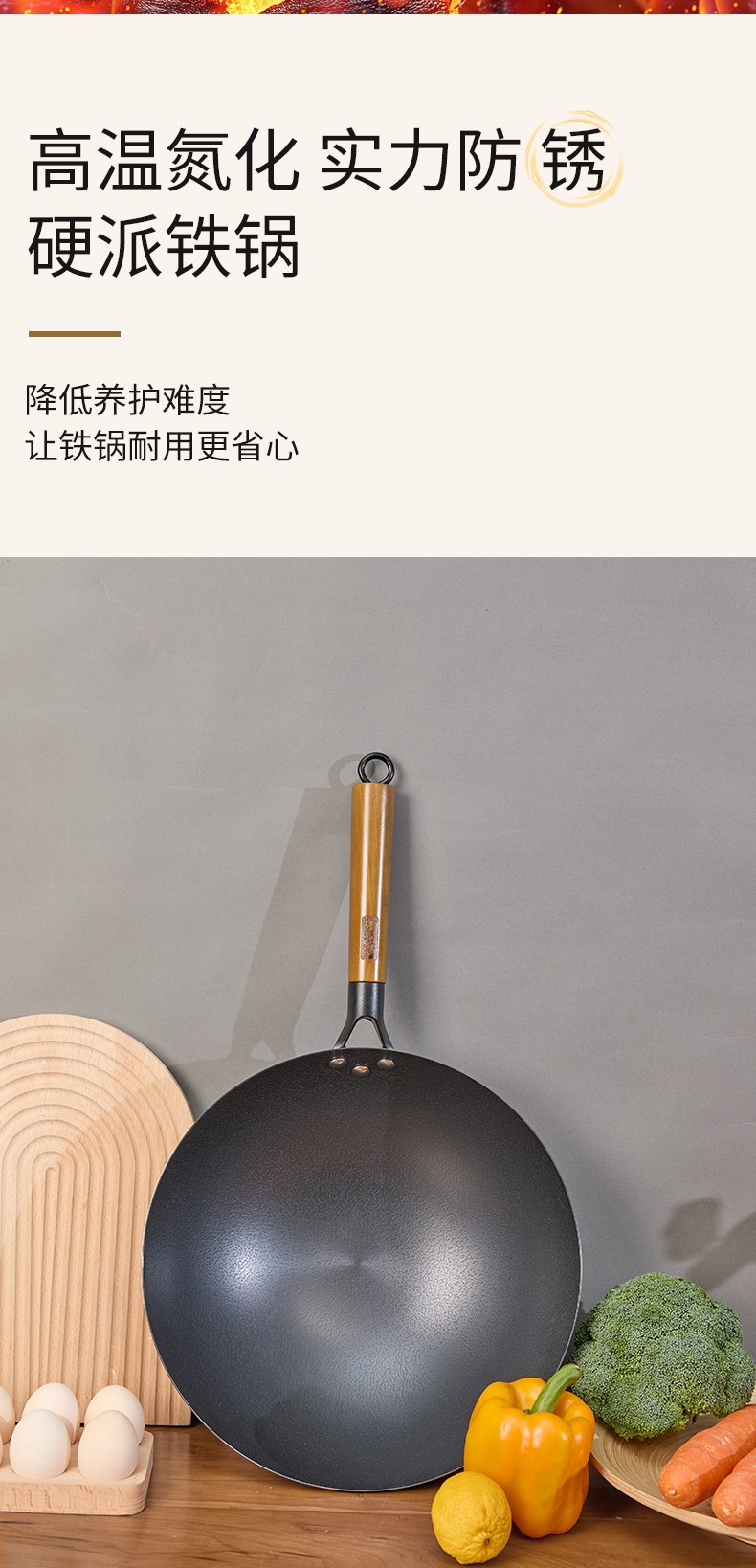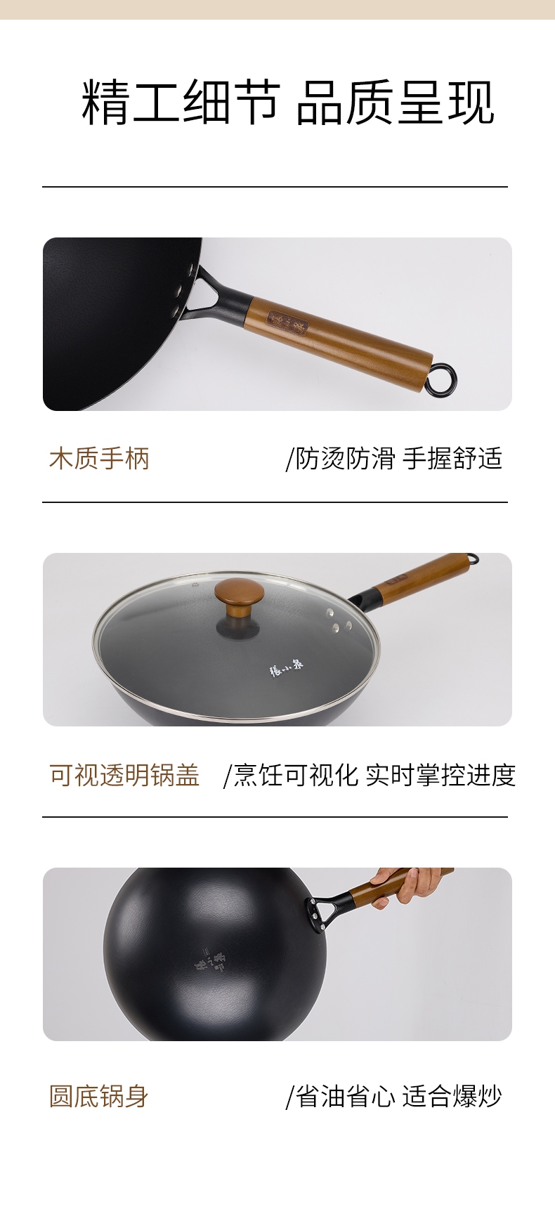 锅身圆润光滑,上口边沿打磨光滑不伤手;手柄实木材质,握感圆润舒适;可拆卸,带挂钩,方便收便;防锈性能卓越,工艺上做了高温气氮加工
