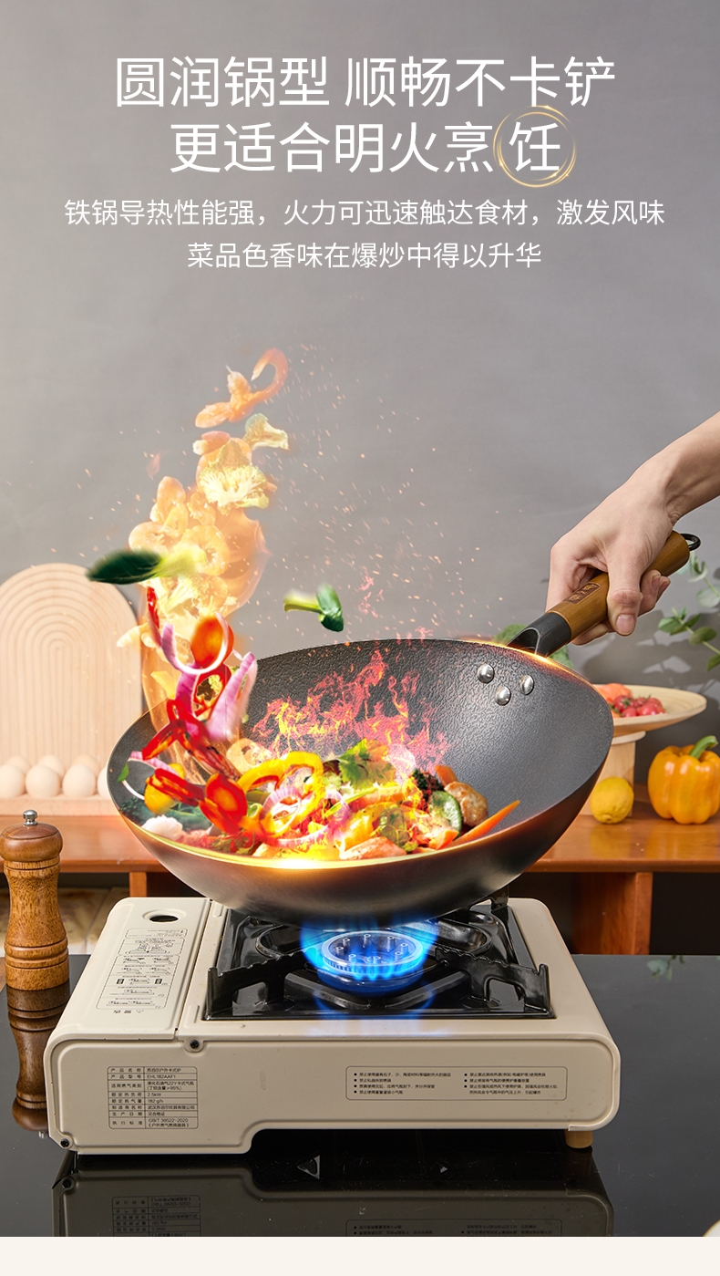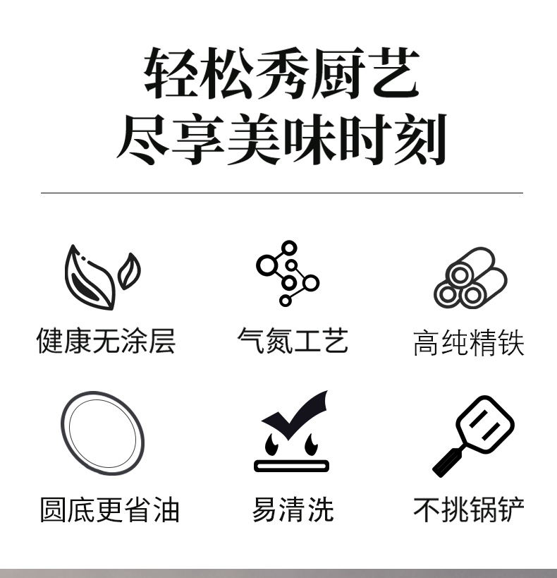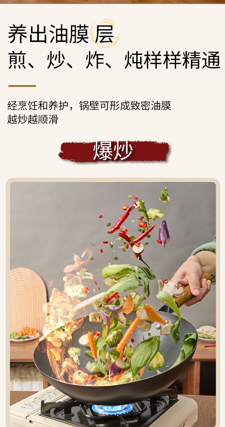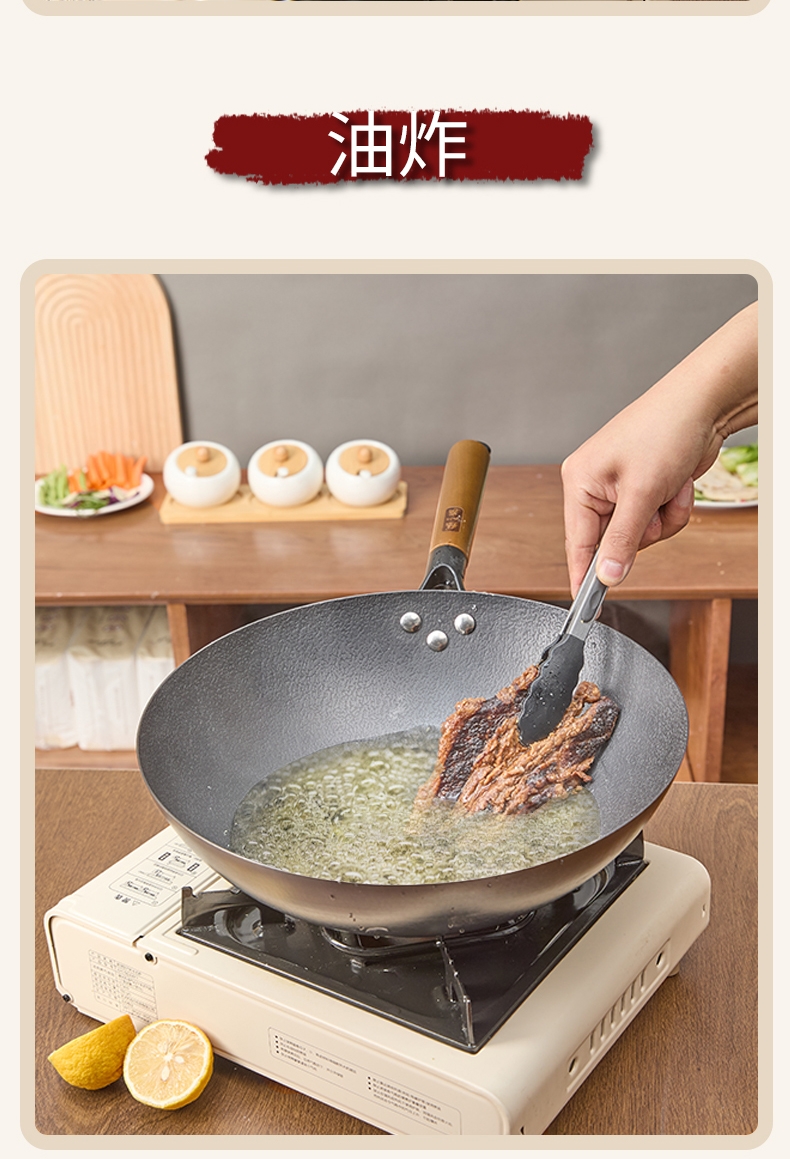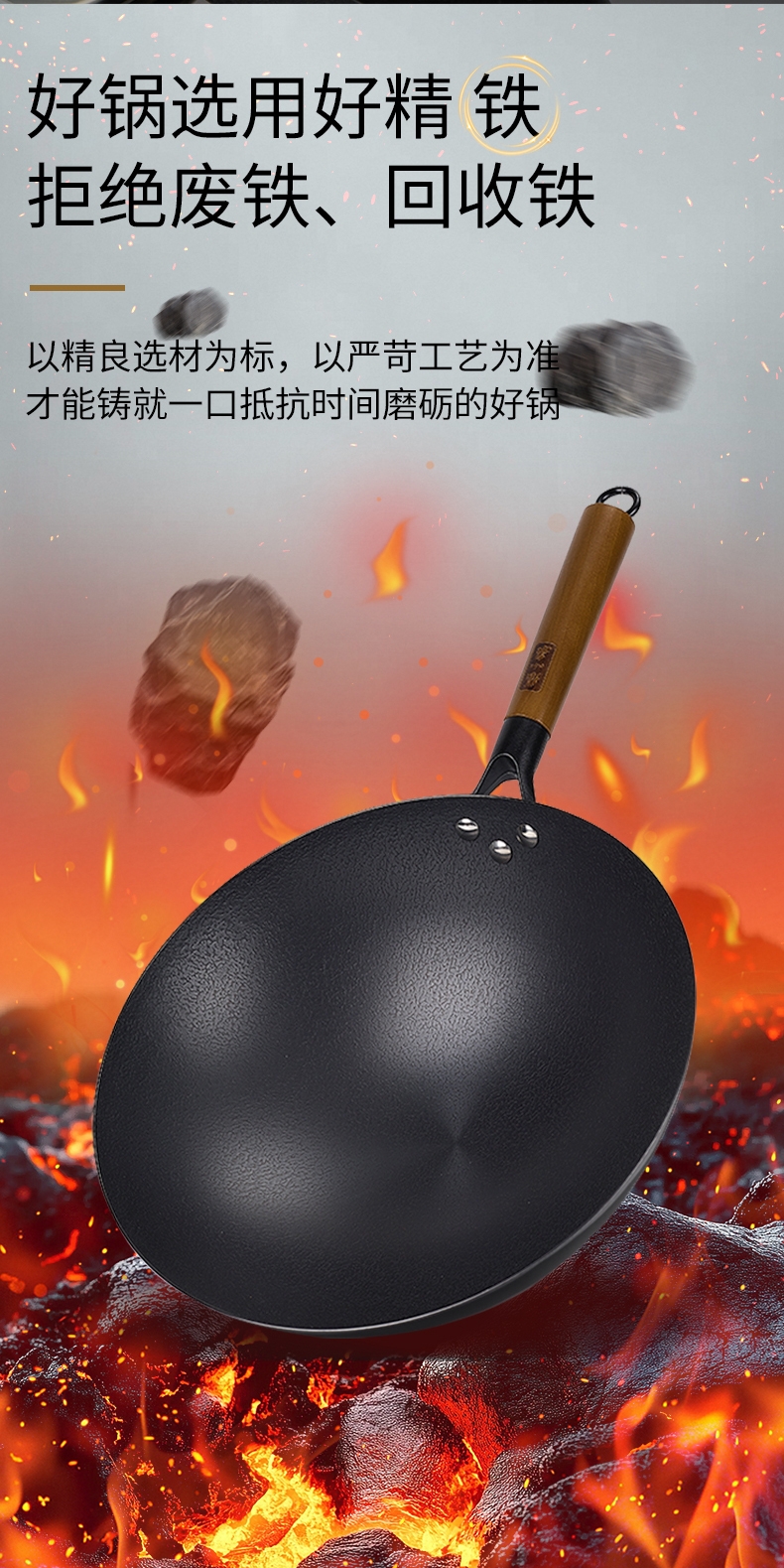 锅身圆润光滑,上口边沿打磨光滑不伤手;手柄实木材质,握感圆润舒适;可拆卸,带挂钩,方便收便;防锈性能卓越,工艺上做了高温气氮加工