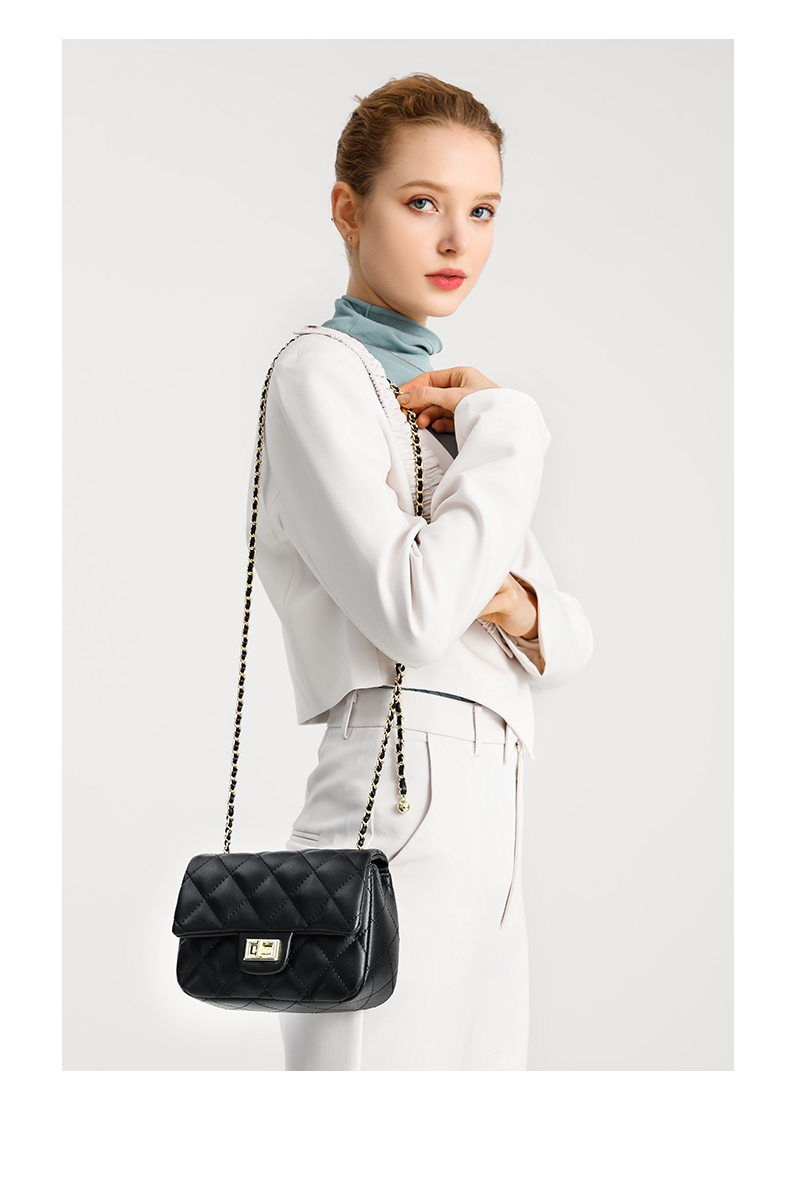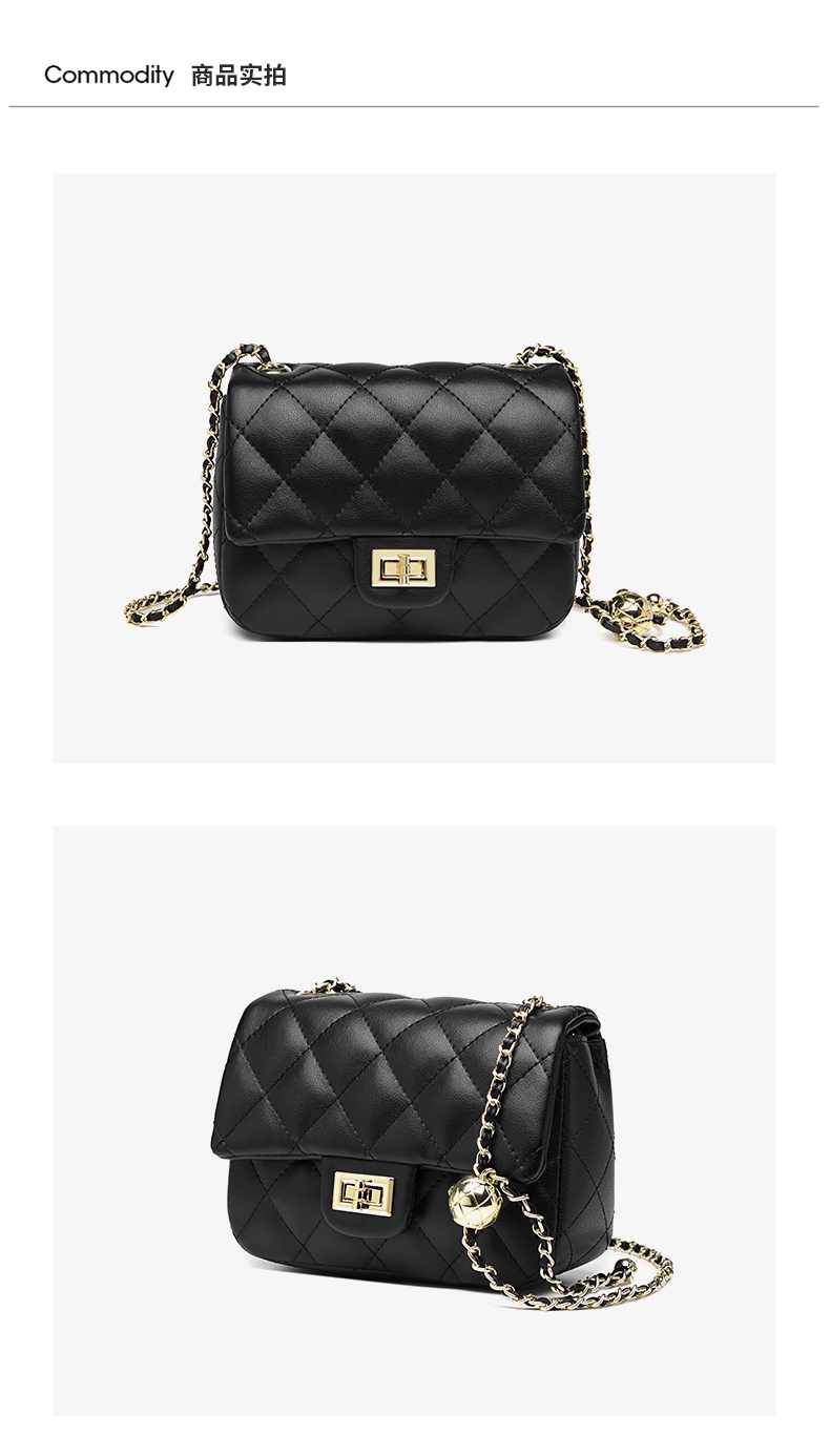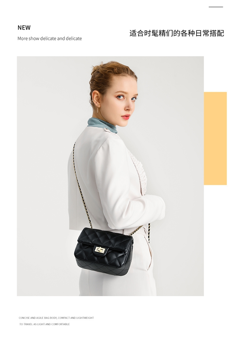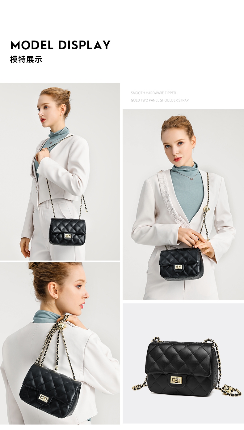 二层牛皮面料,线条利落,立体有型;金属链条可调节手提,能够背提两用;多重电镀质感五金锁扣,耐磨且耐刮;多格主袋内袋,实用收纳,有容乃大