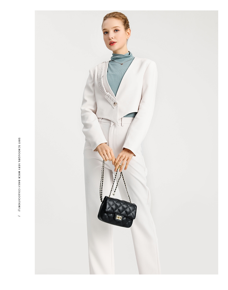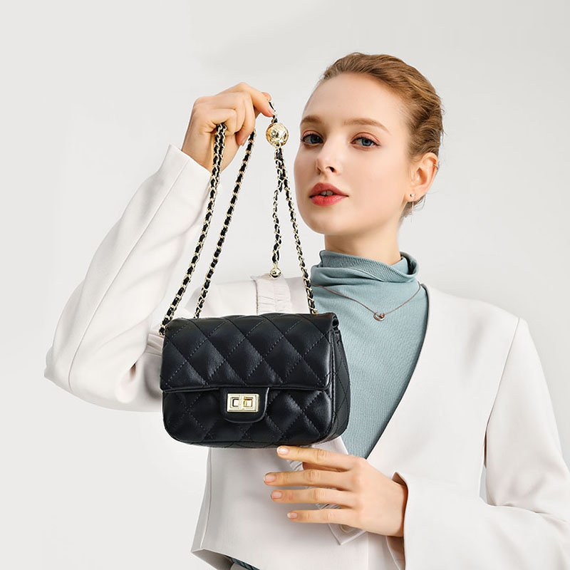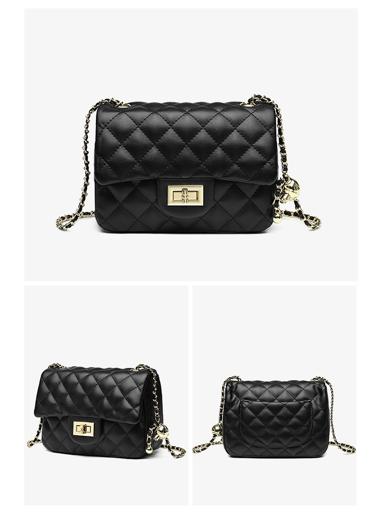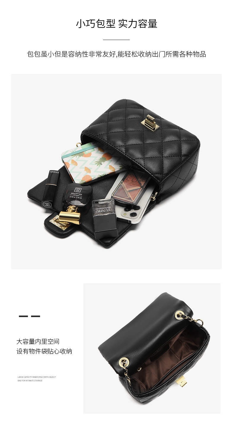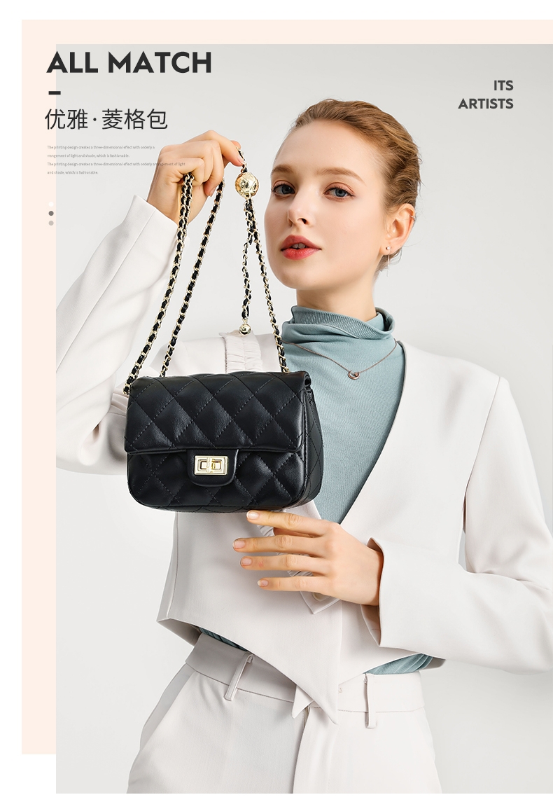 二层牛皮面料,线条利落,立体有型;金属链条可调节手提,能够背提两用;多重电镀质感五金锁扣,耐磨且耐刮;多格主袋内袋,实用收纳,有容乃大