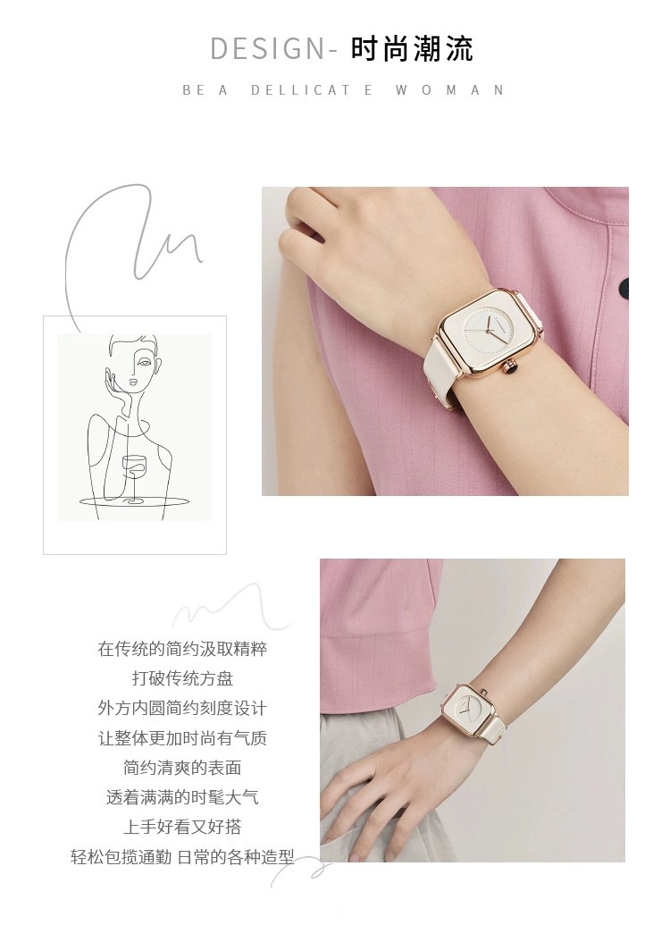 精致简约时尚女表,潮流装扮必备品;细致做工,严格品控,品质卓尔不凡;条形刻度,经典三针,简约而不简单;多重电镀质感合金表格,耐磨且耐刮;进口电子石英机芯,低功耗走时精准