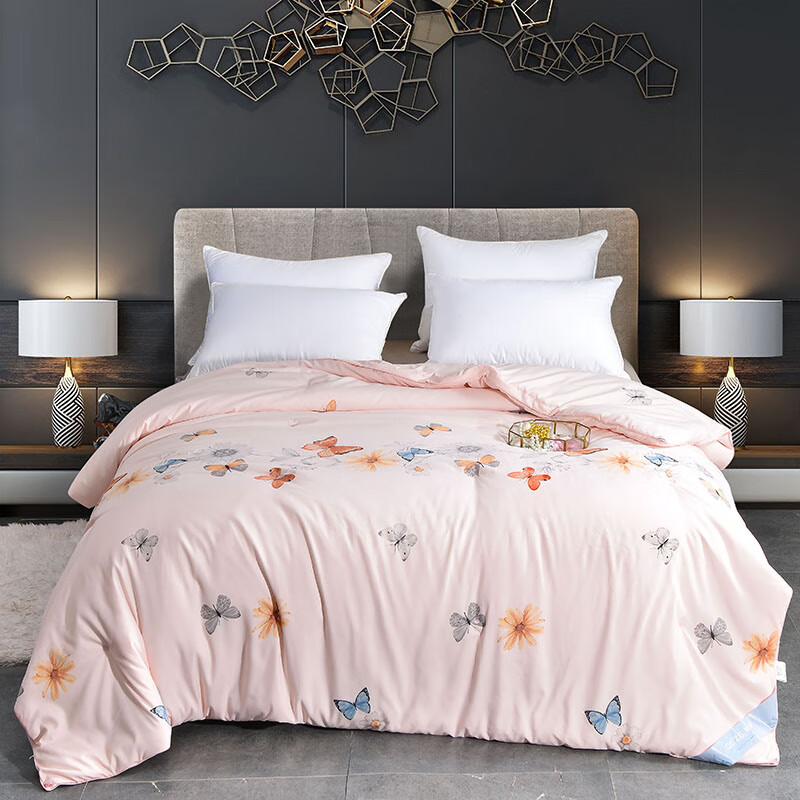面料选用优质长绒棉,面料厚实柔软,舒适,亲肤;有很好的延伸性和较好的耐热性;花型简约高雅,活性印染,环保健康;填充蚕丝和木棉的结合,透气,吸湿,排汗;轻盈不压身,金属拉链开口,设计大方,持久耐用