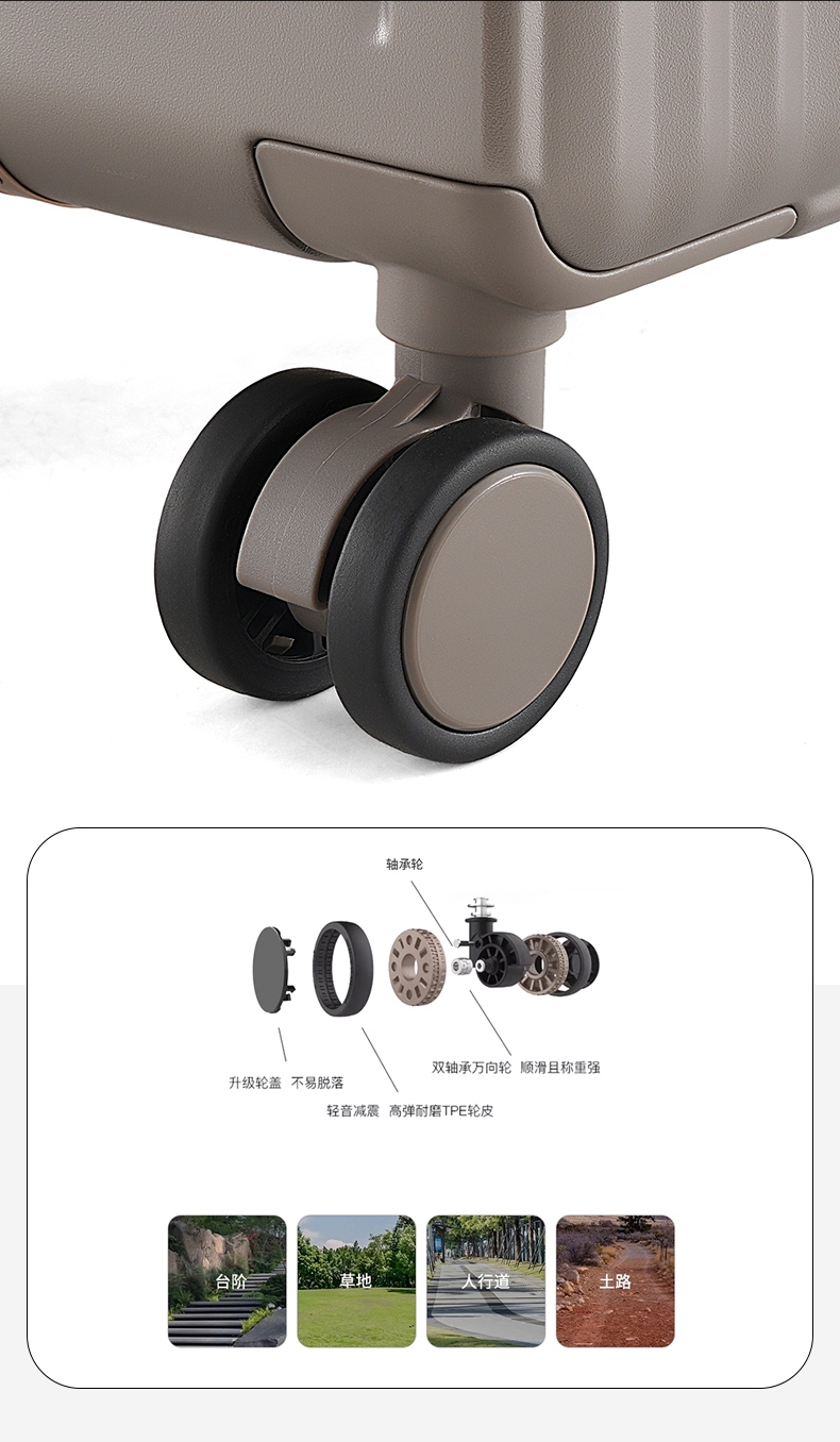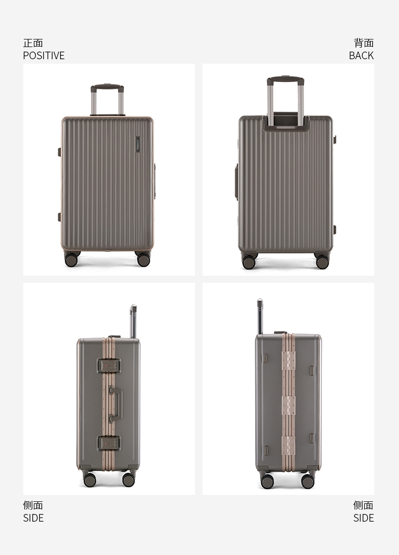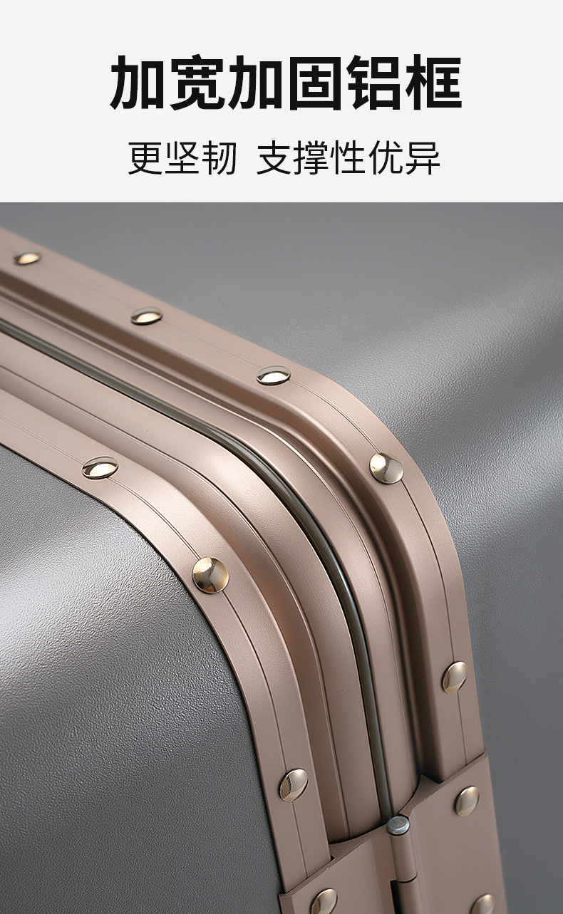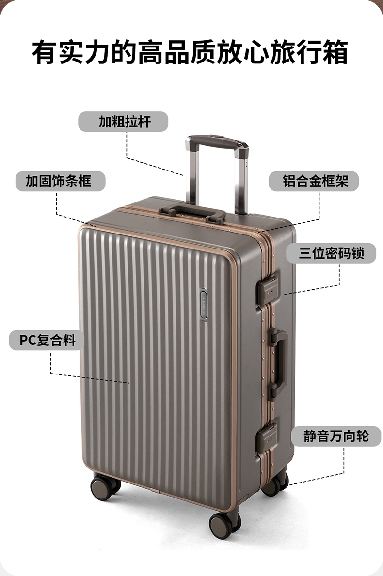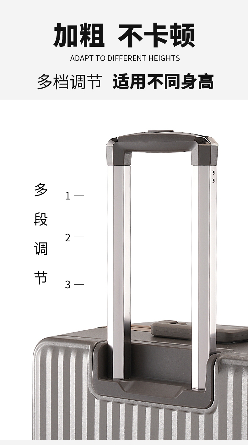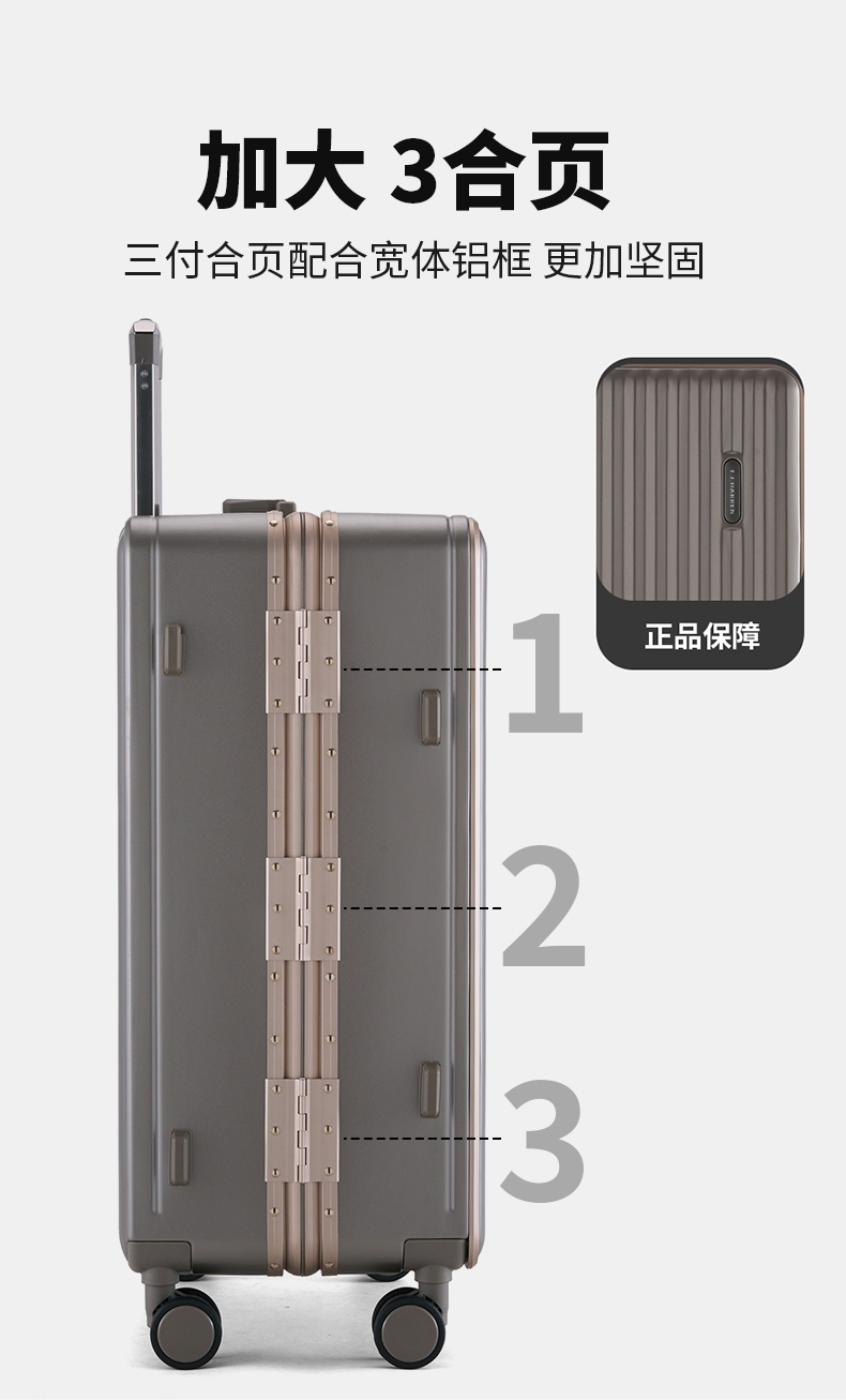 加厚PC合金外壳及铝框和合页,防刮坚固,耐磨防爆;加厚合金伸缩拉杆,拉合顺畅,握感舒适,结实稳固;带慢回弹顶部和侧部提手,竖提横提都方便