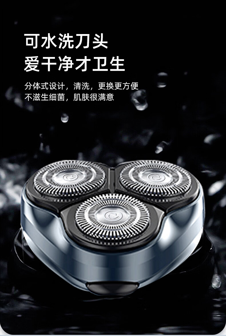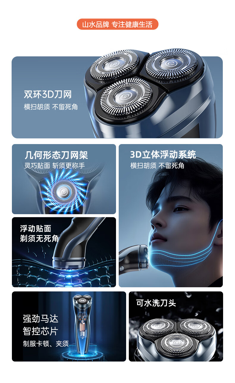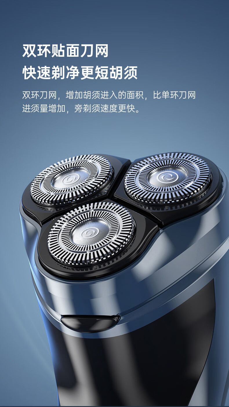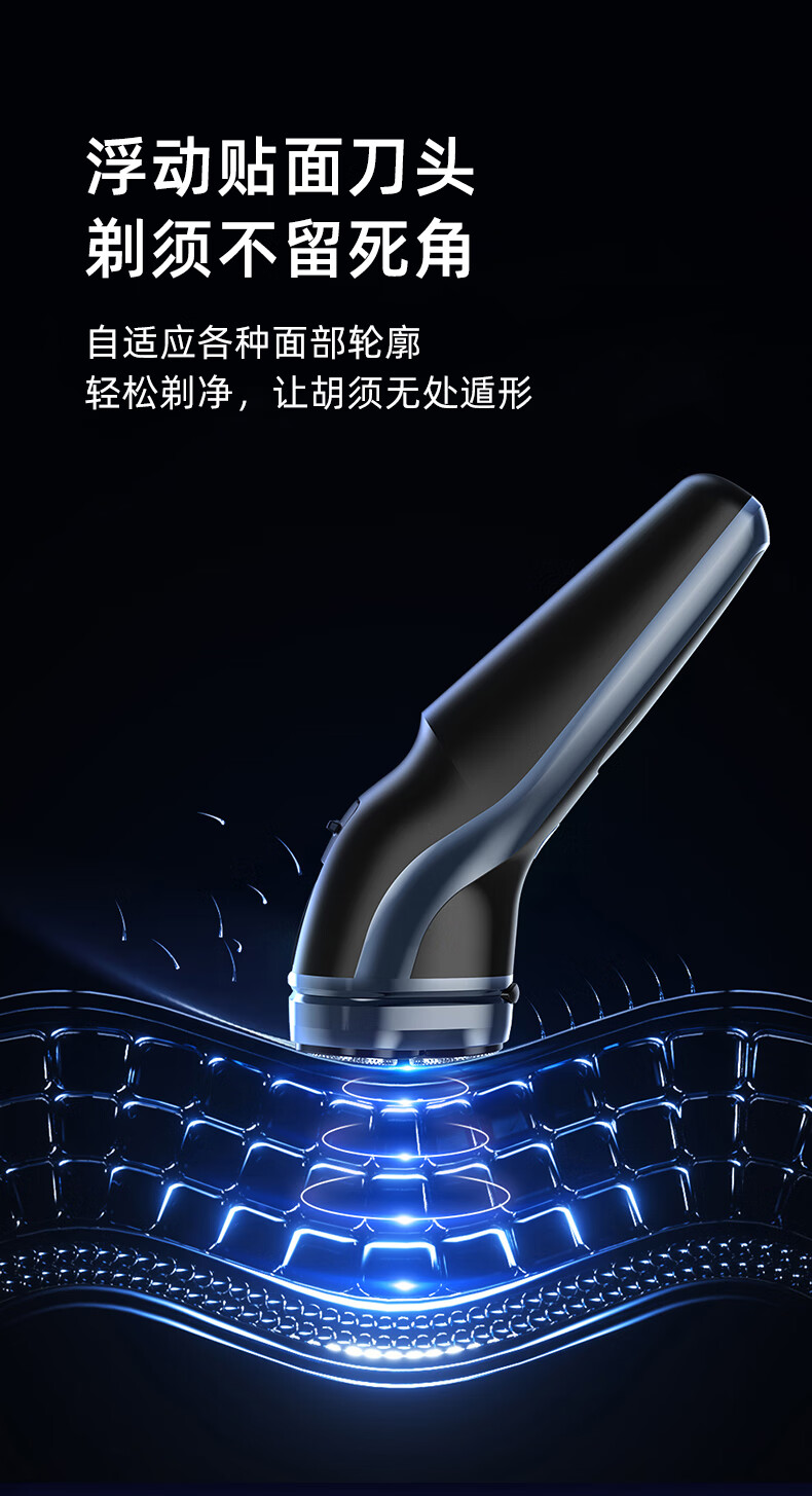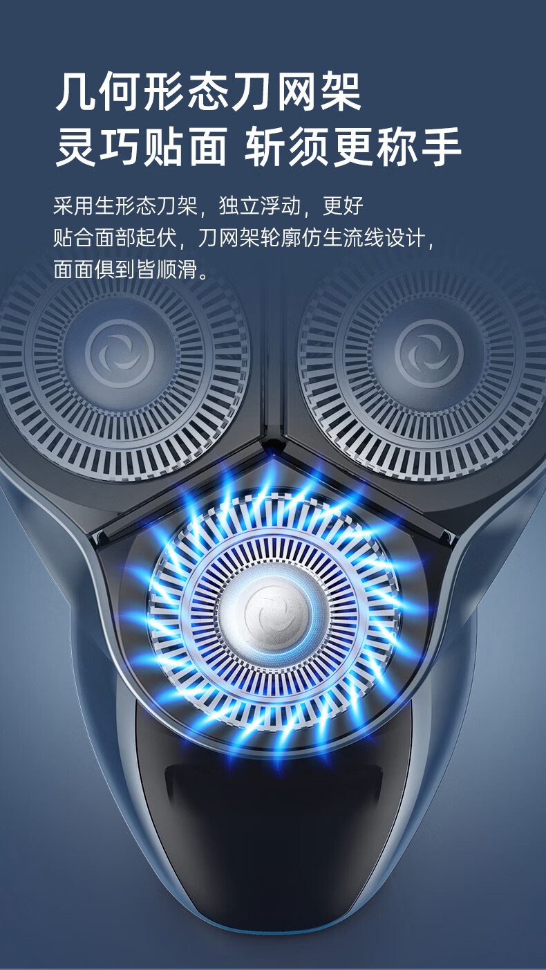 双环3D贴面刀网、仿生形态刀网架、刀头自动研磨技术;1小时充电、续航40分钟、智能防夹须系统;浮动贴面剃须系统、强劲马达智控芯片;LED智能电量显示、全身水洗IPX4、支持干湿双剃;弹出式鬓角刀,包装方式:彩盒+网购包装