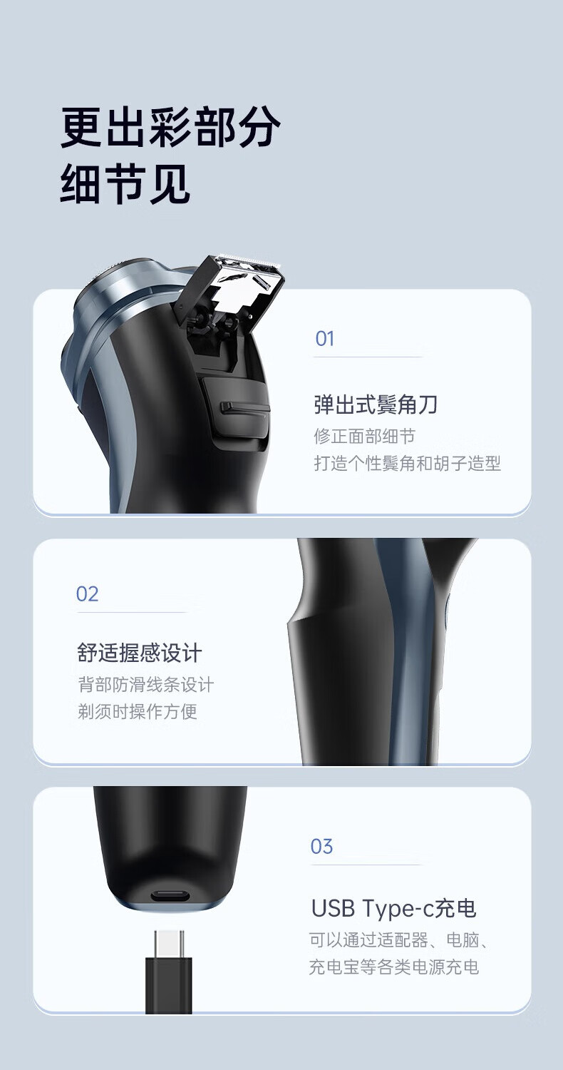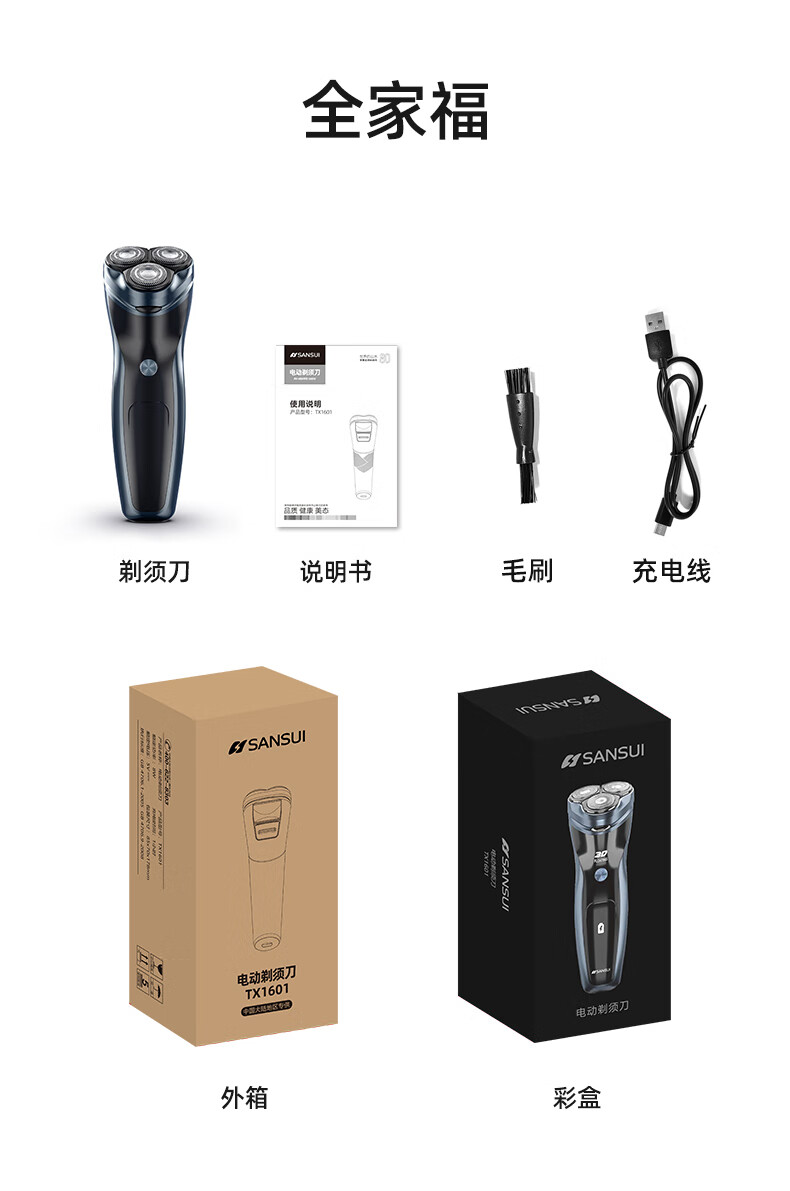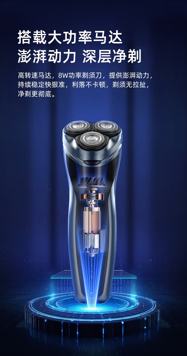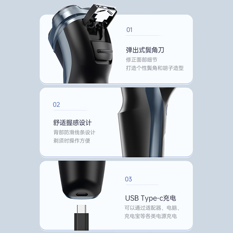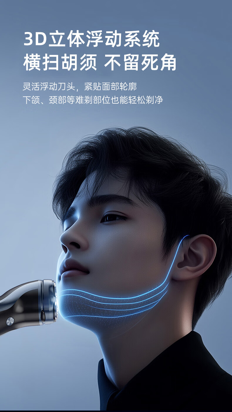 双环3D贴面刀网、仿生形态刀网架、刀头自动研磨技术;1小时充电、续航40分钟、智能防夹须系统;浮动贴面剃须系统、强劲马达智控芯片;LED智能电量显示、全身水洗IPX4、支持干湿双剃;弹出式鬓角刀,包装方式:彩盒+网购包装