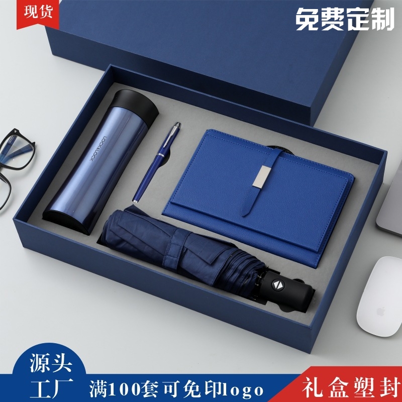 乐扣杯+雨伞+金属签字笔+笔记本+礼盒手提袋;乐扣杯+笔激光logo,笔记本压印,雨伞丝印log; 礼盒+手提袋烫金/烫银
