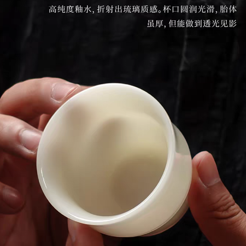 原矿稀有瓷土,高温烧制。瓷面强度高,无杂质更健康。;淡淡琉璃光泽,犹如暖玉;润白色泽,更显茶汤。;器型端庄,人体工学设计,让品茶时光充满诗意。;细节打磨,专注精品。高档皮盒包装,送礼佳品。;