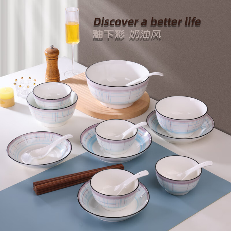 配置清单:产品规格: 8英寸饭盘2个、7英寸饭盘2个、6英寸面碗2个,4.5英寸饭碗4个、小汤勺4个、免漆木筷4双,8英寸汤碗1个,大汤勺1个。