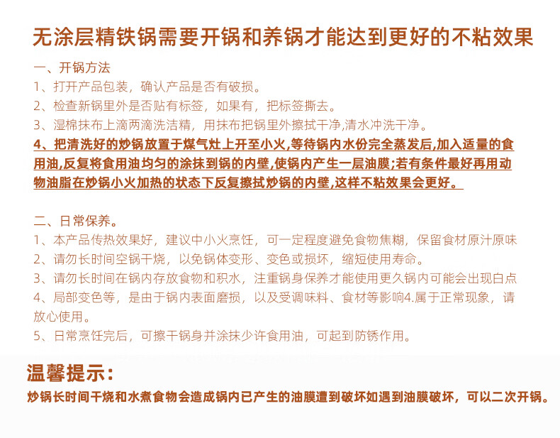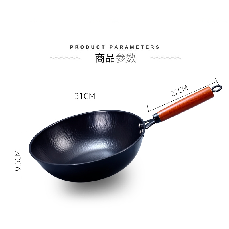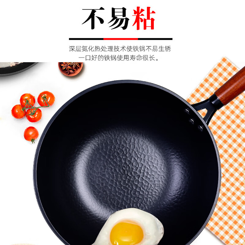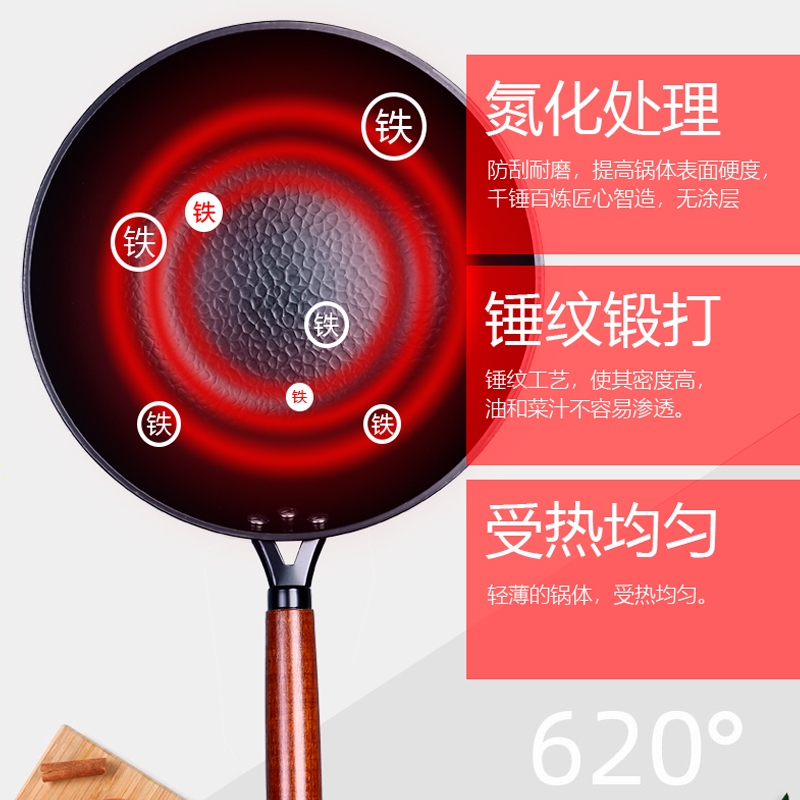 精铁制造,物理不沾,氮化处理;传热更快,受热均匀,节能又环保;隔热防烫木质手柄,符合人体工程学