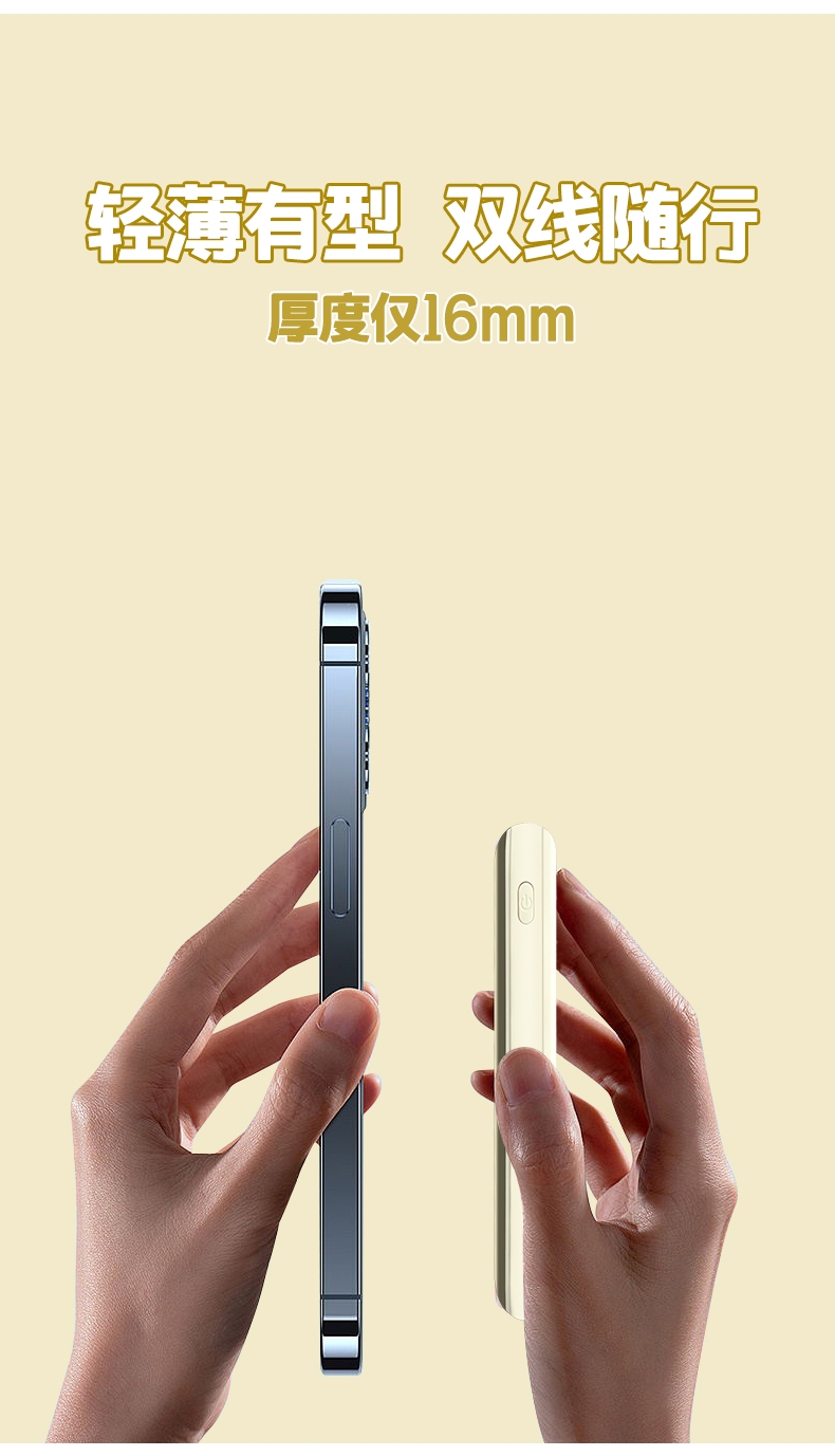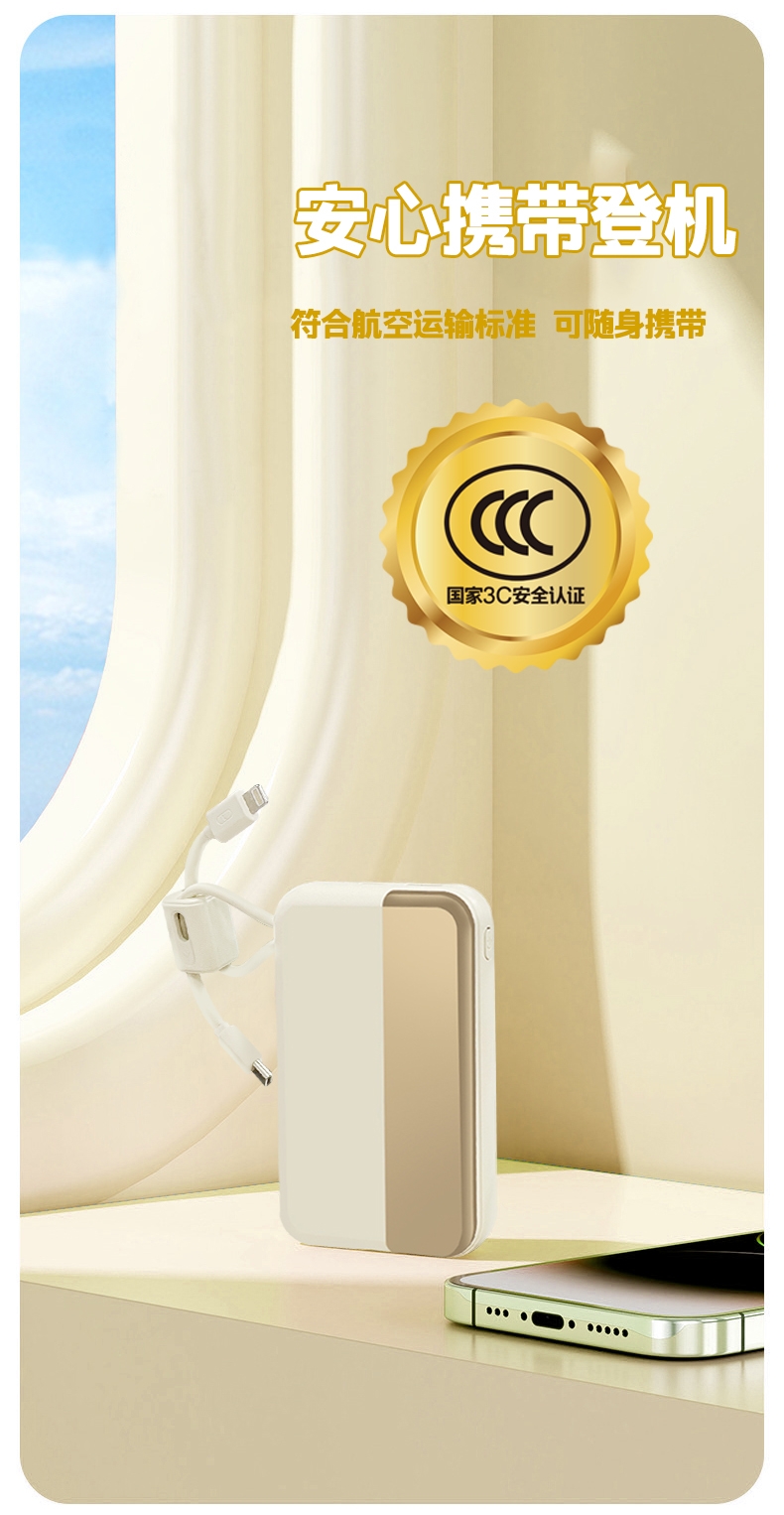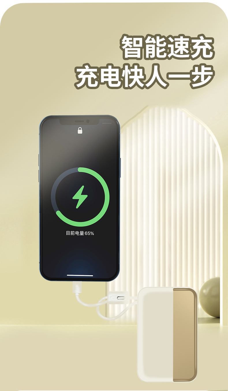 10000毫安实标容量,超薄设计;22.5W超级快充,兼容PD20W;内置苹果/Type-C接口满足各种手机充电;符合民航局标准,可随身携带