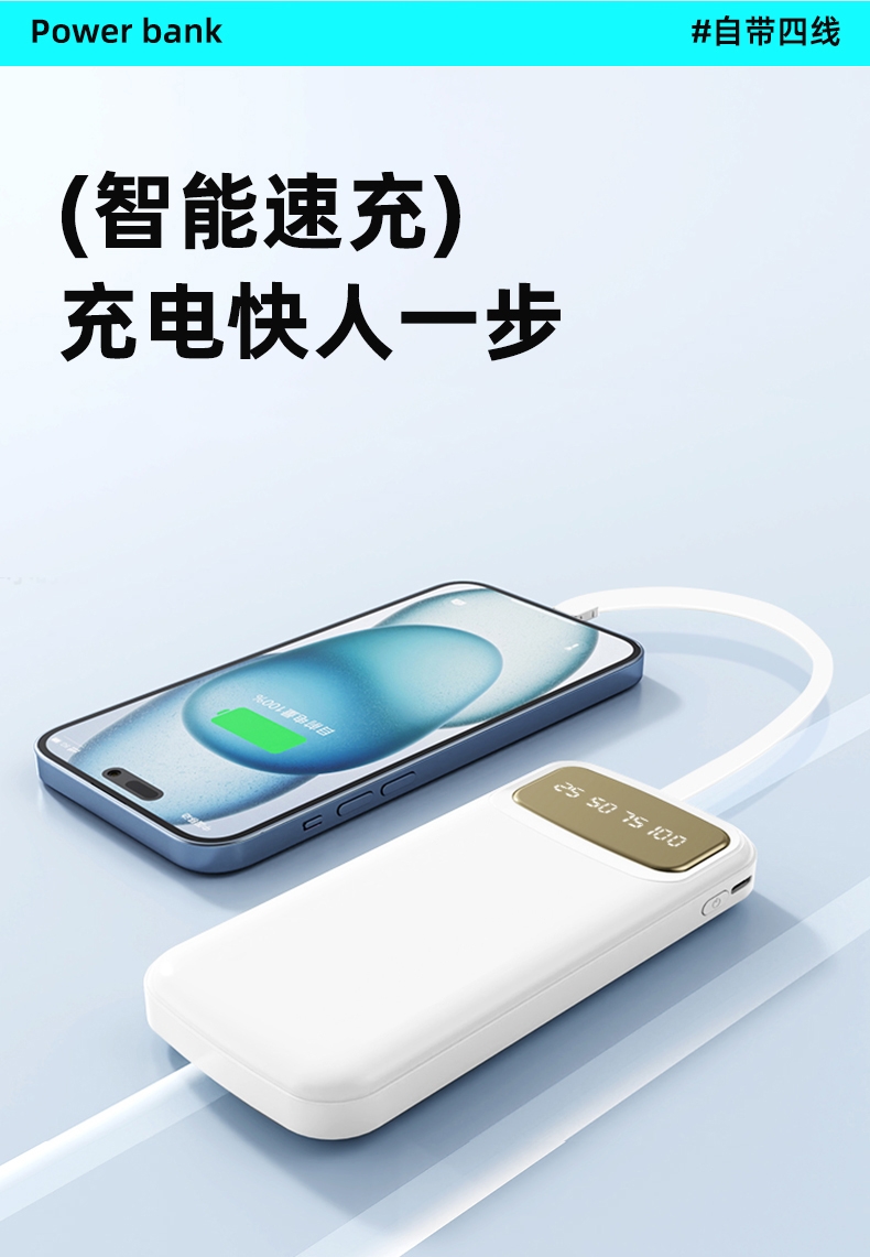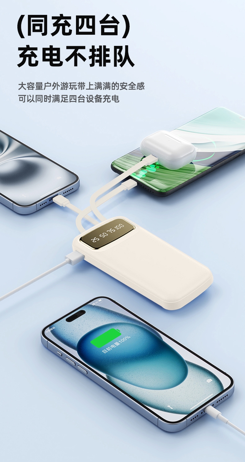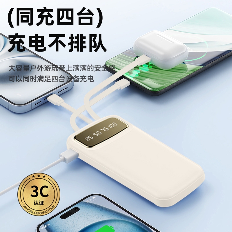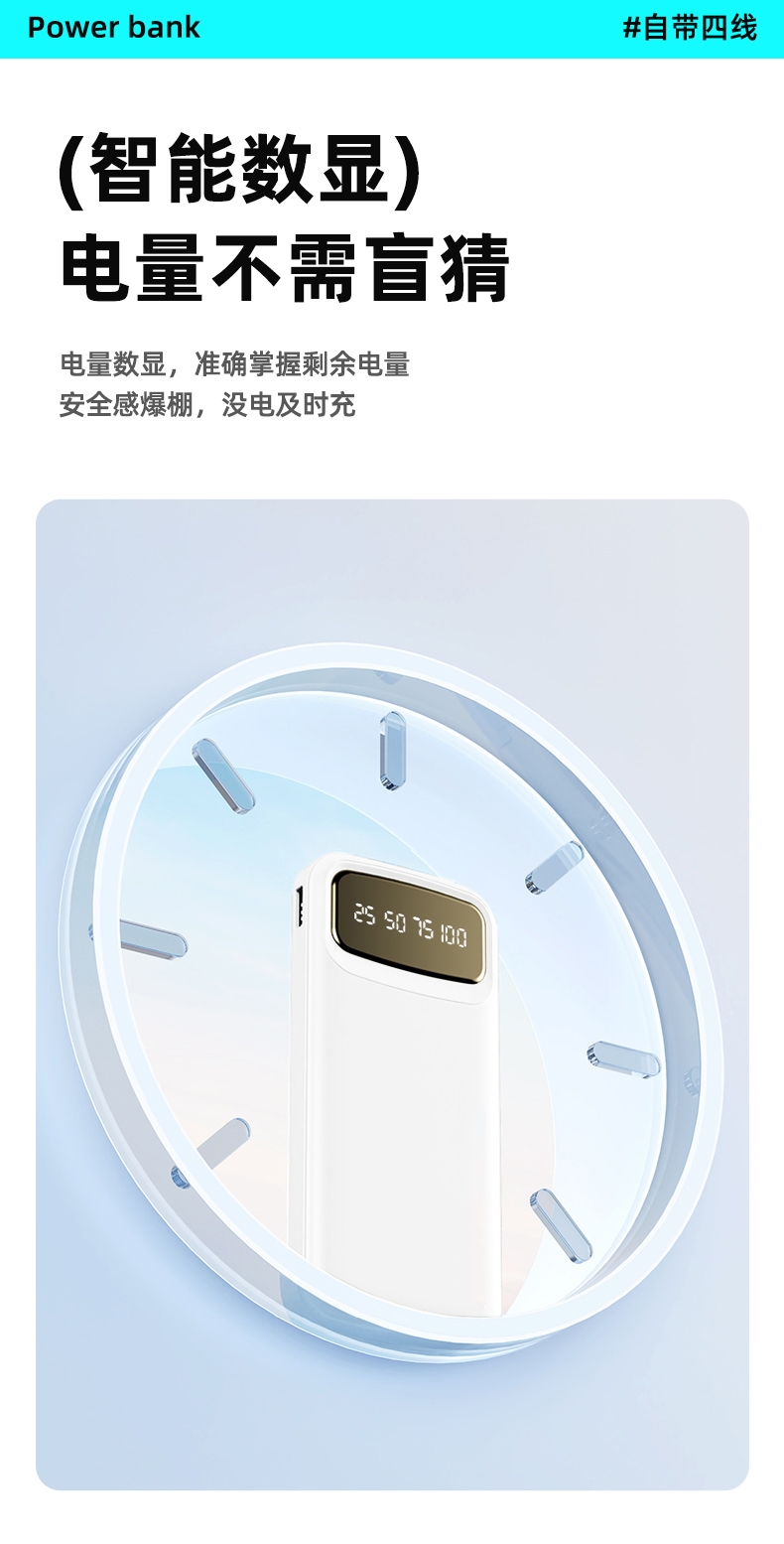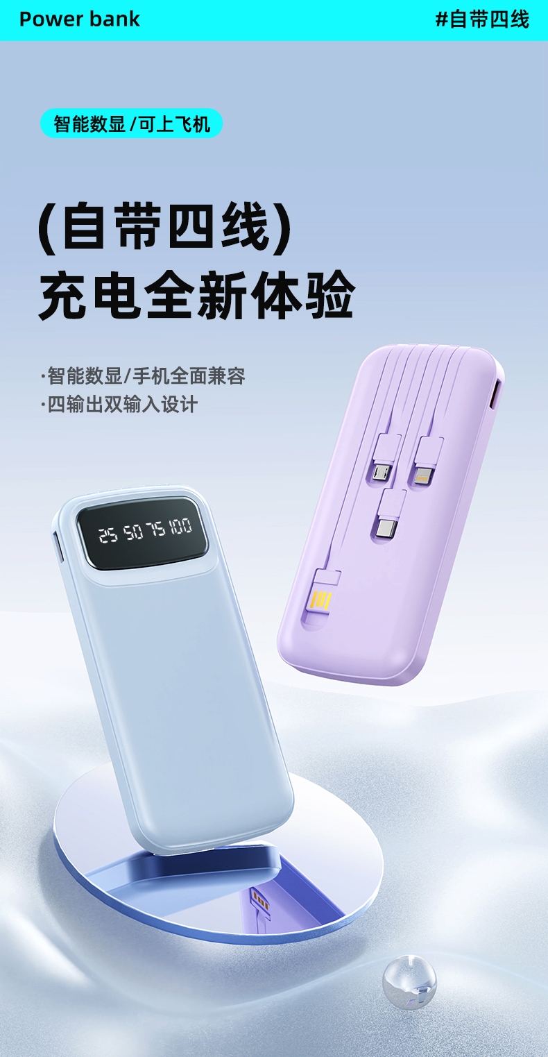 数字电量精准显示,3C认证;内置四线满足各种手机充电;10000/20000毫安双版本;符合民航局标准,可随身携带