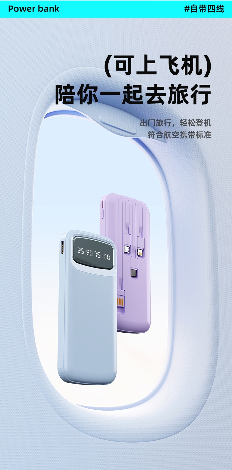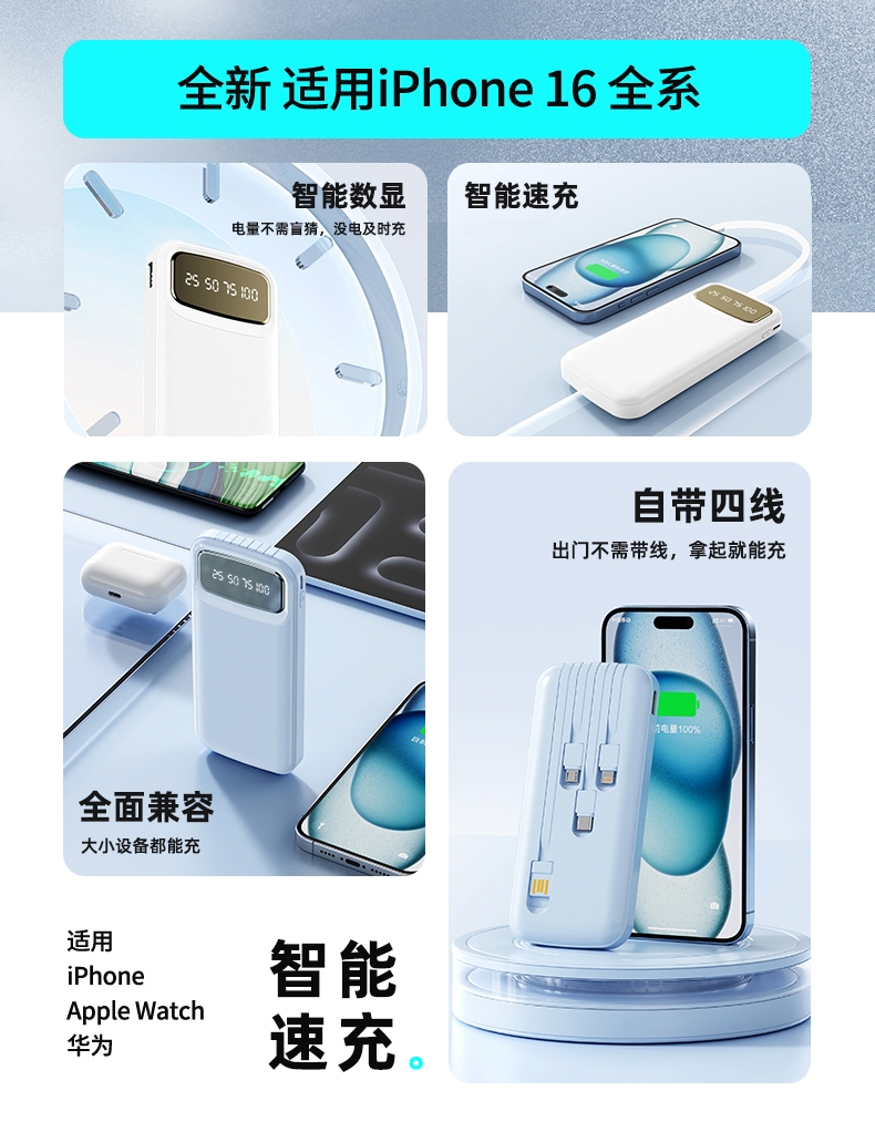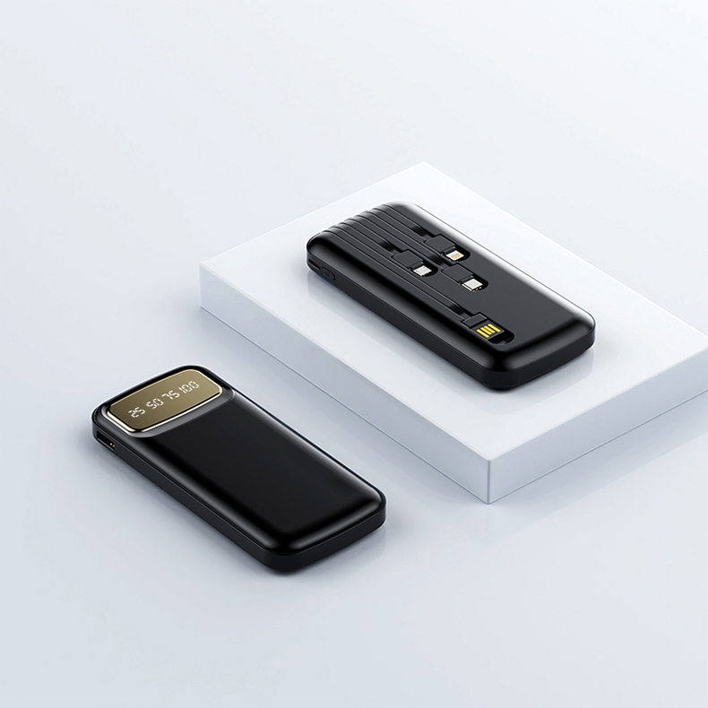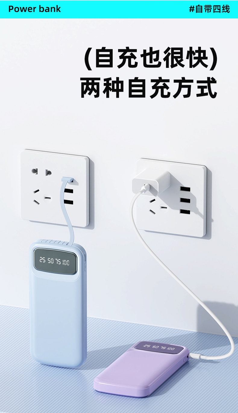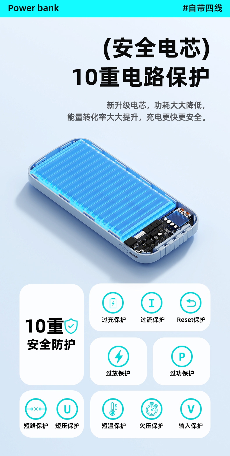 数字电量精准显示,3C认证;内置四线满足各种手机充电;10000/20000毫安双版本;符合民航局标准,可随身携带