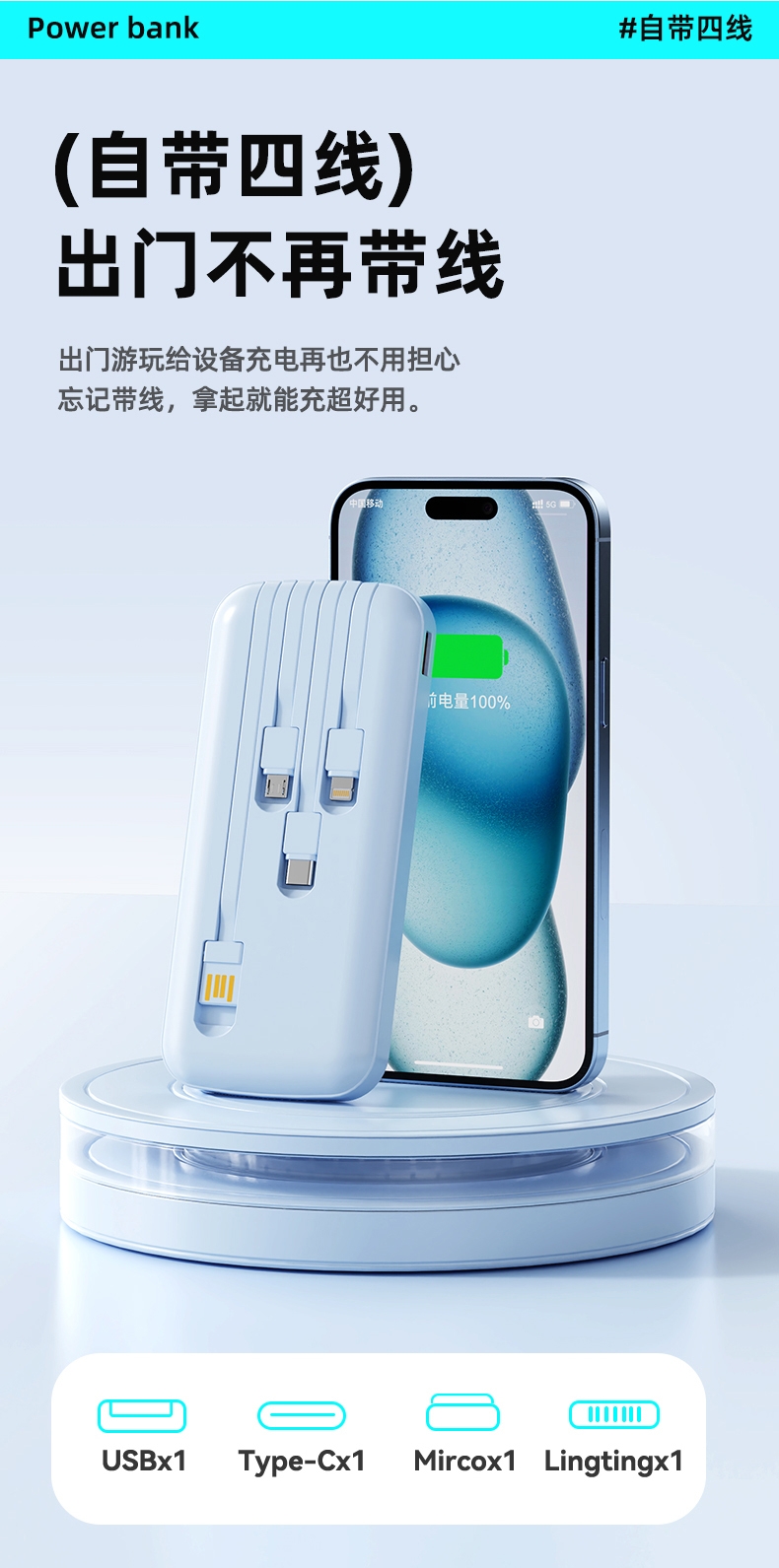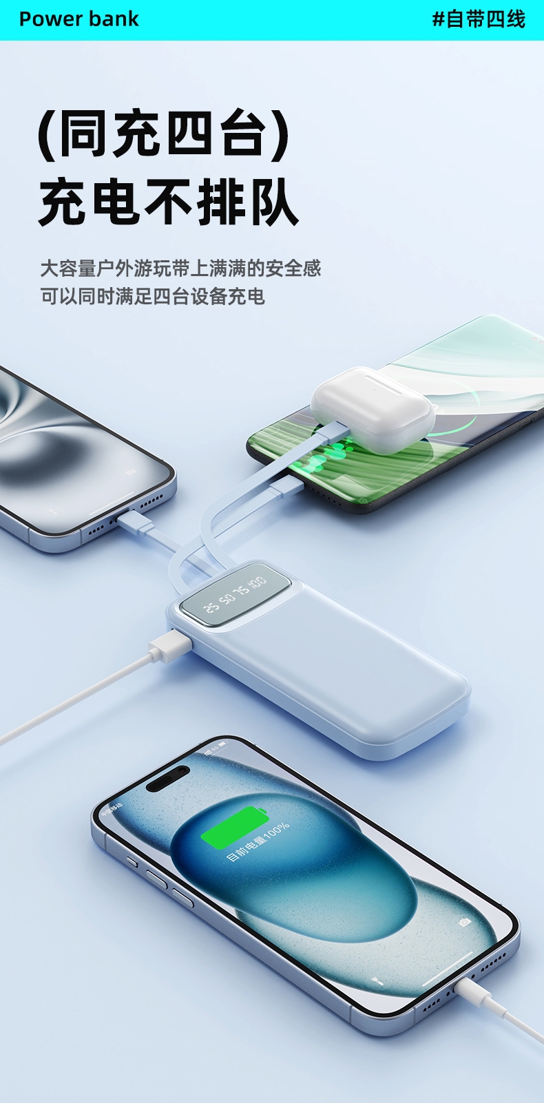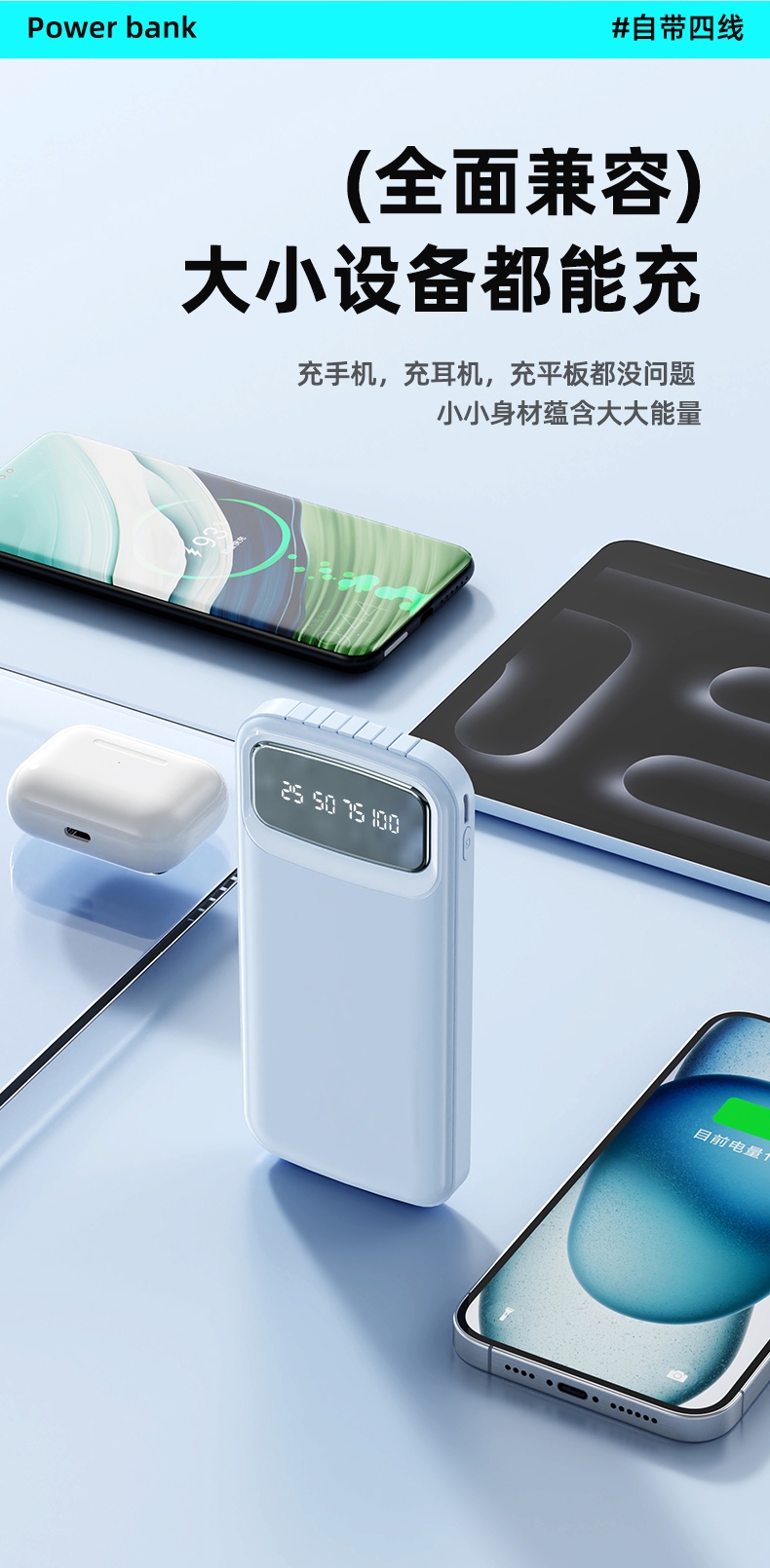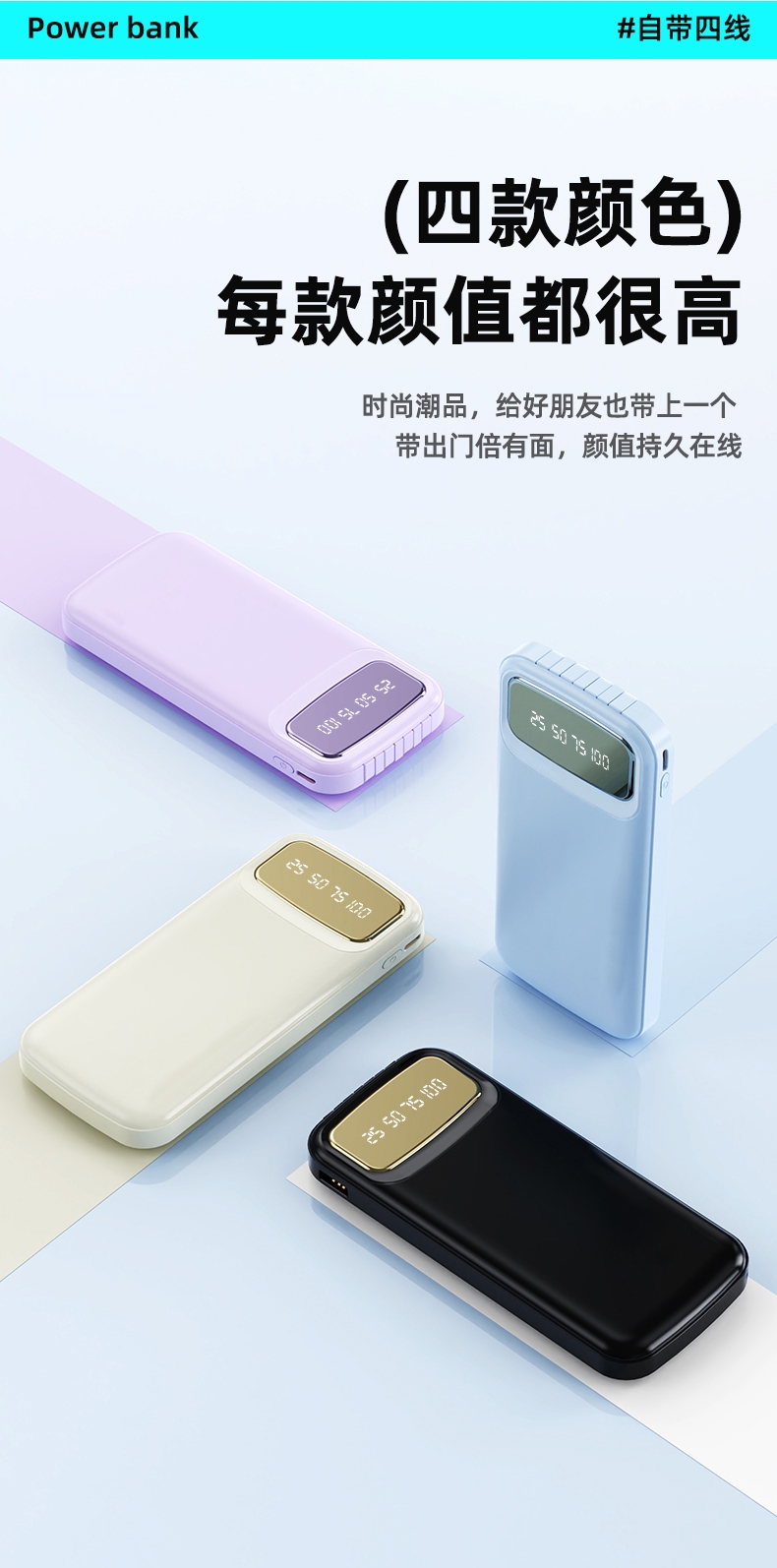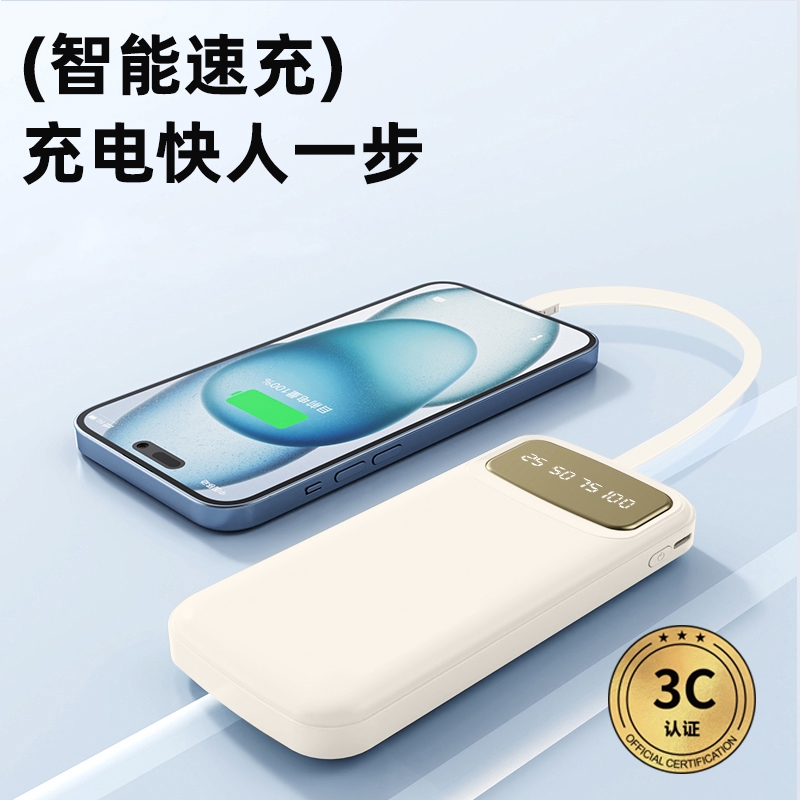 数字电量精准显示,3C认证;内置四线满足各种手机充电;10000/20000毫安双版本;符合民航局标准,可随身携带