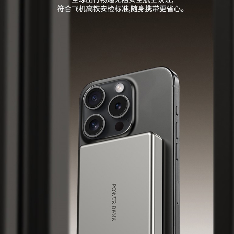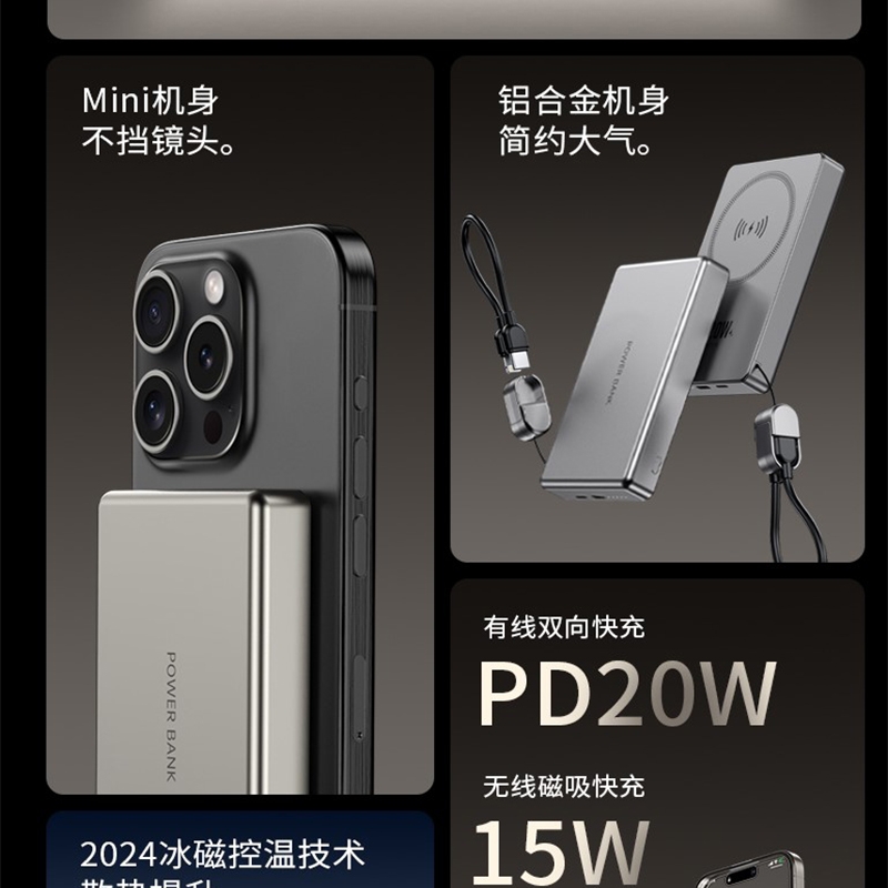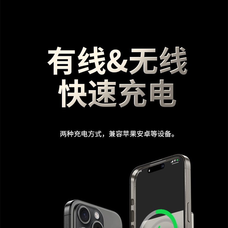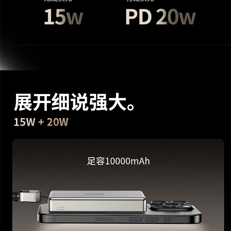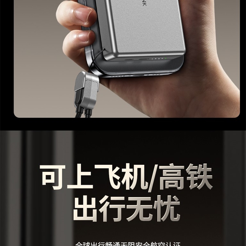 10000毫安22.5W双向超级快充;15W超强磁吸无线充电;铝合金超薄机身,自带双向快充数据线;3C认证,符合民航局标准,可随身携带