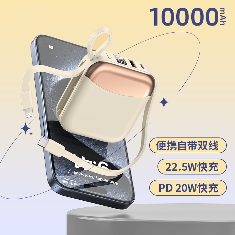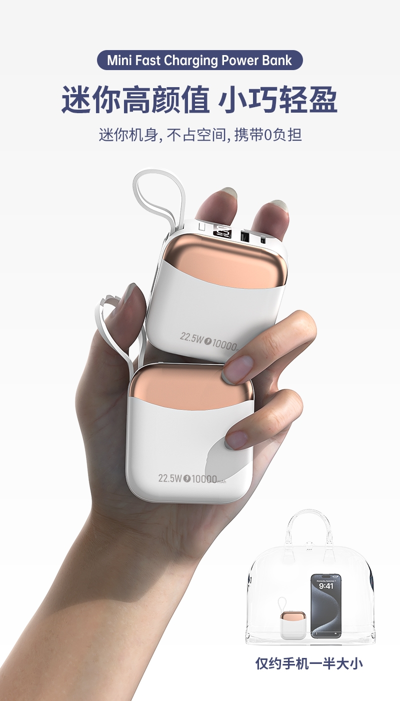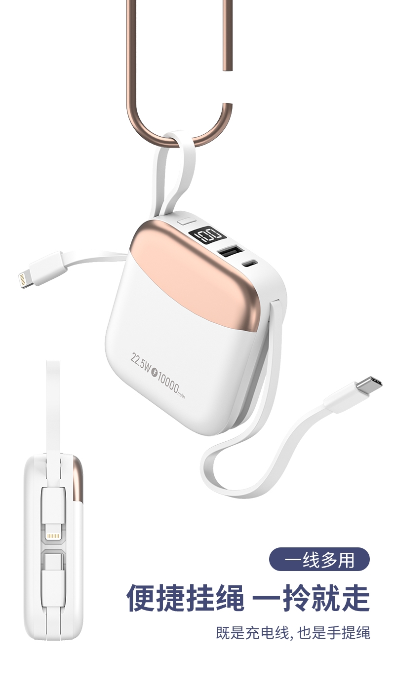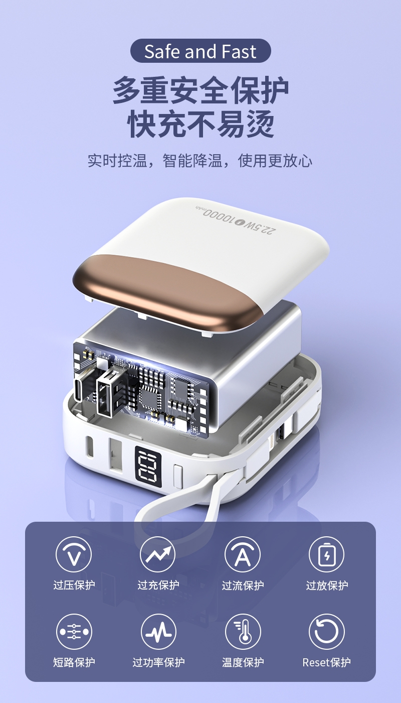 10000毫安实标容量,3C认证;数字电量精准显示;22.5W超级快充,兼容PD20W;内置苹果/Type-C接口满足各种手机充电;符合民航局标准,可随身携带