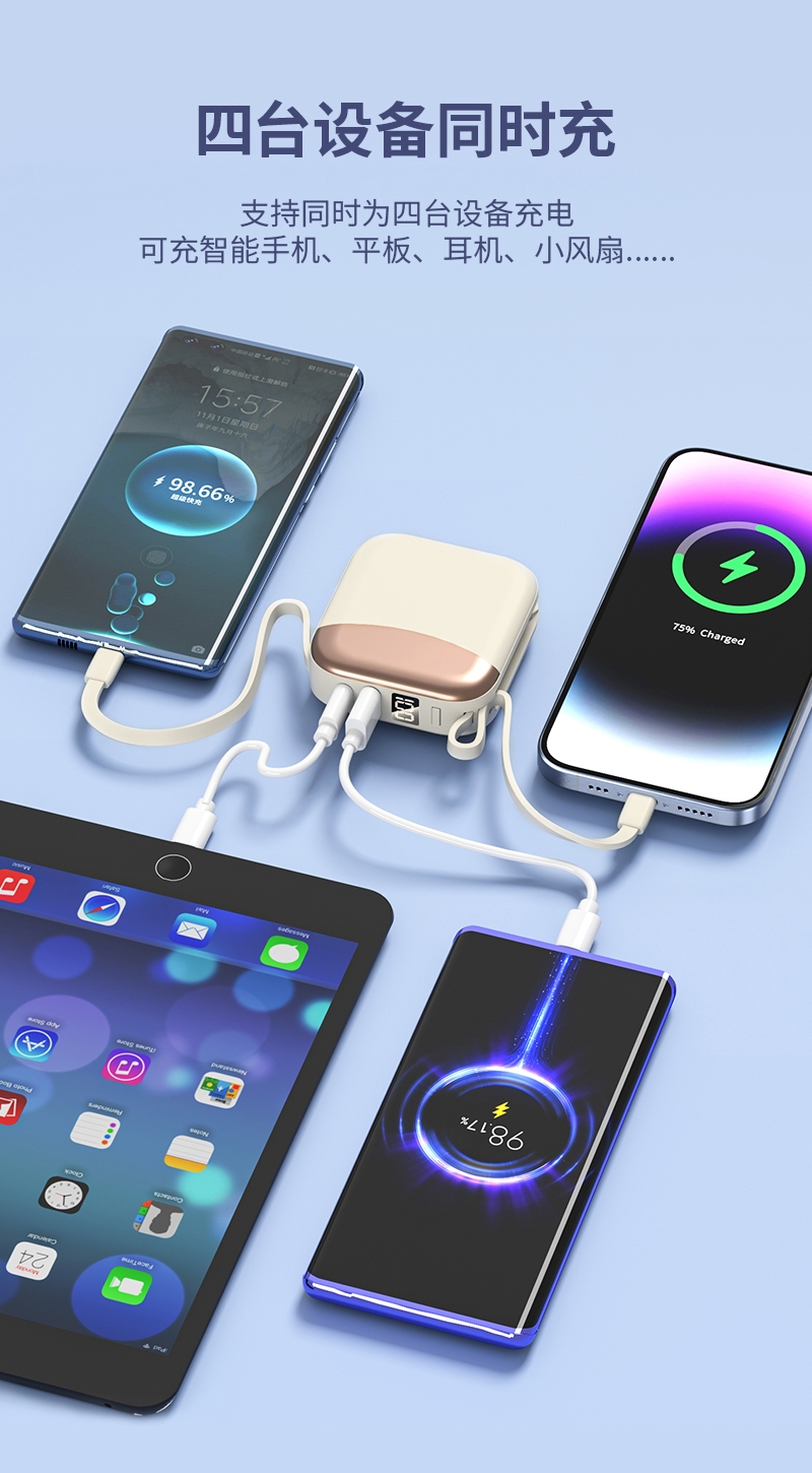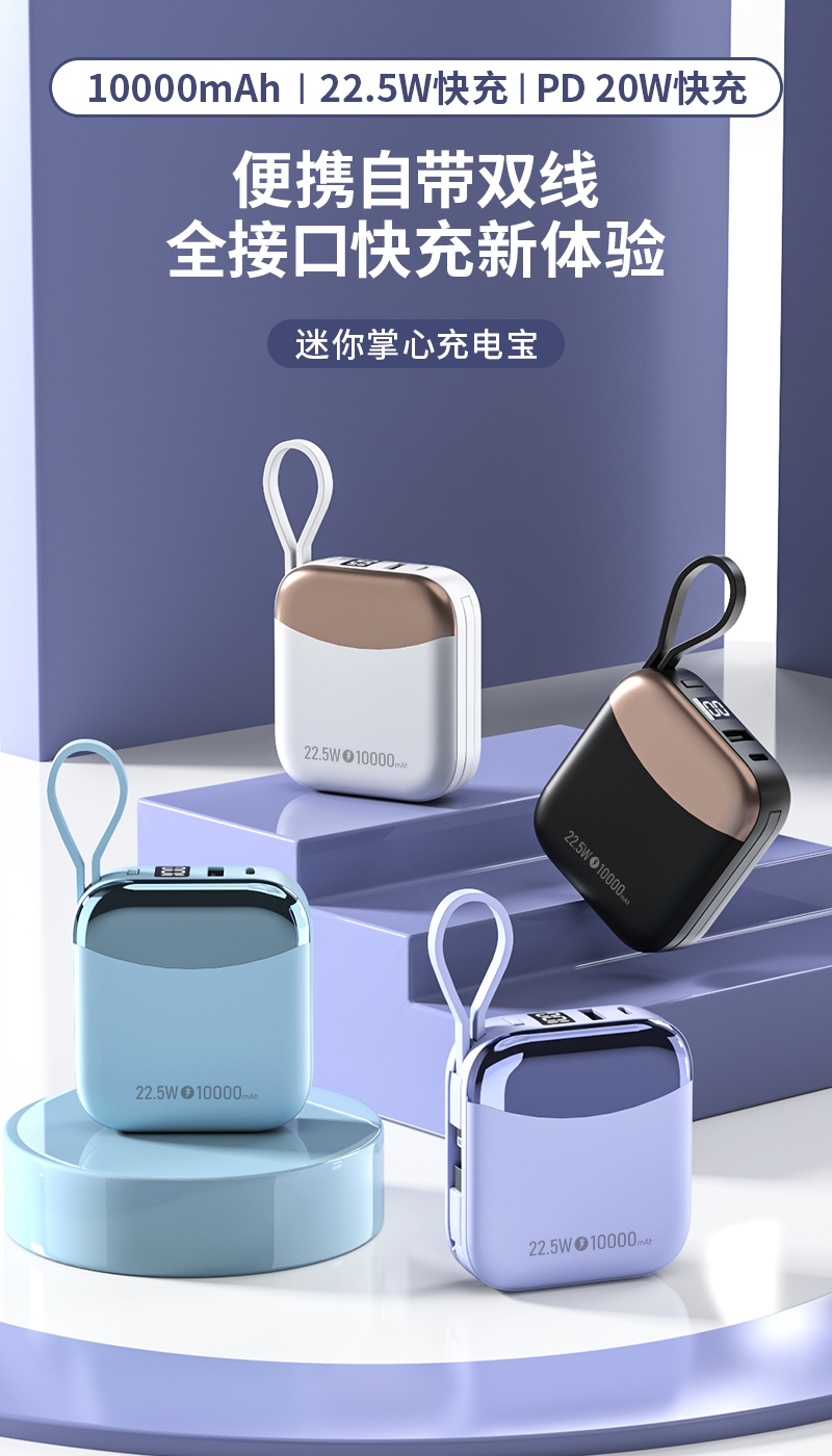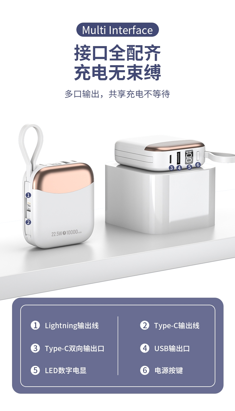 10000毫安实标容量,3C认证;数字电量精准显示;22.5W超级快充,兼容PD20W;内置苹果/Type-C接口满足各种手机充电;符合民航局标准,可随身携带