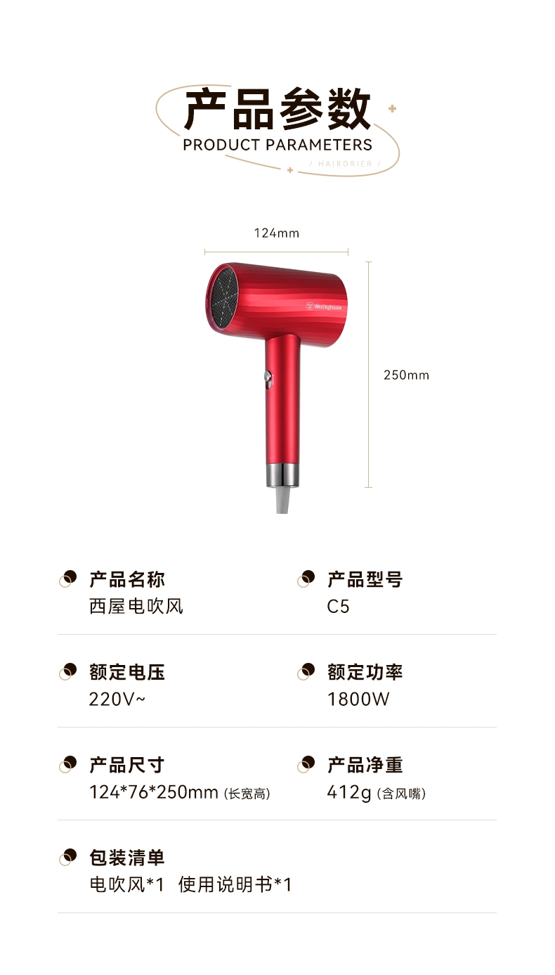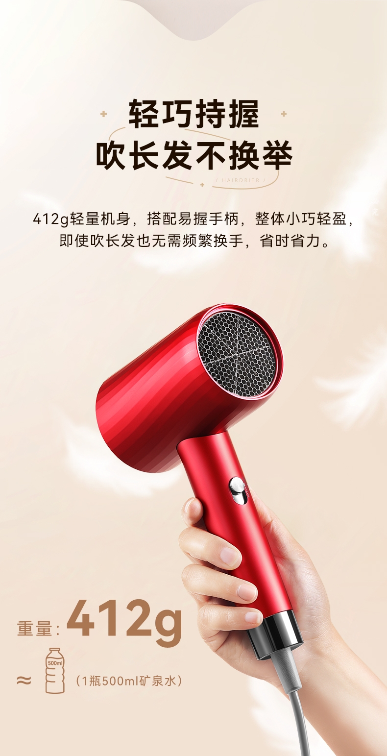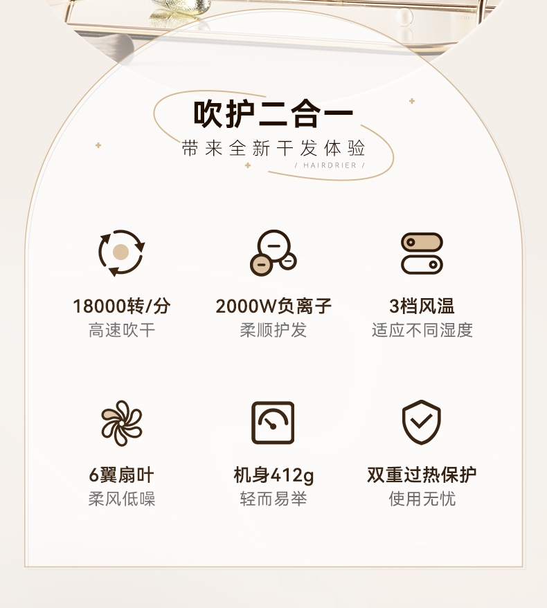 18000r/min高转速吹护二合一,全新干发体验;2000W级负离子抚平干枯毛躁,秀发顺滑亮泽;3档风温2档风速,多种模式切换舒适吹护体验