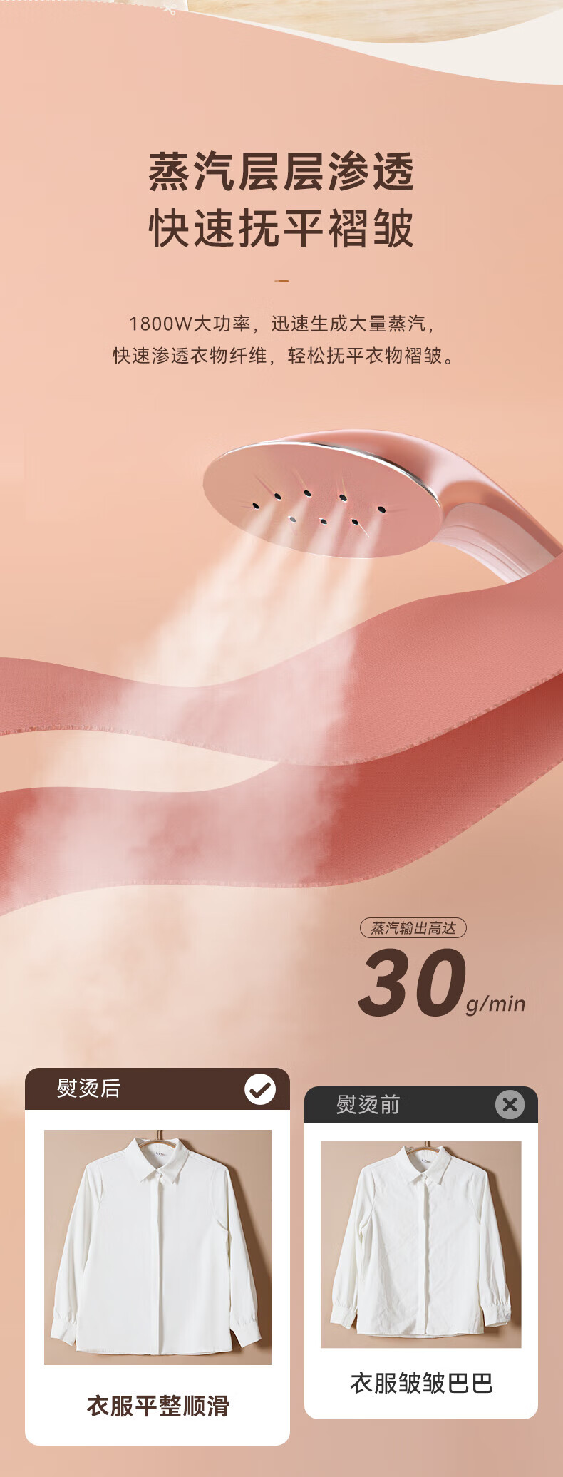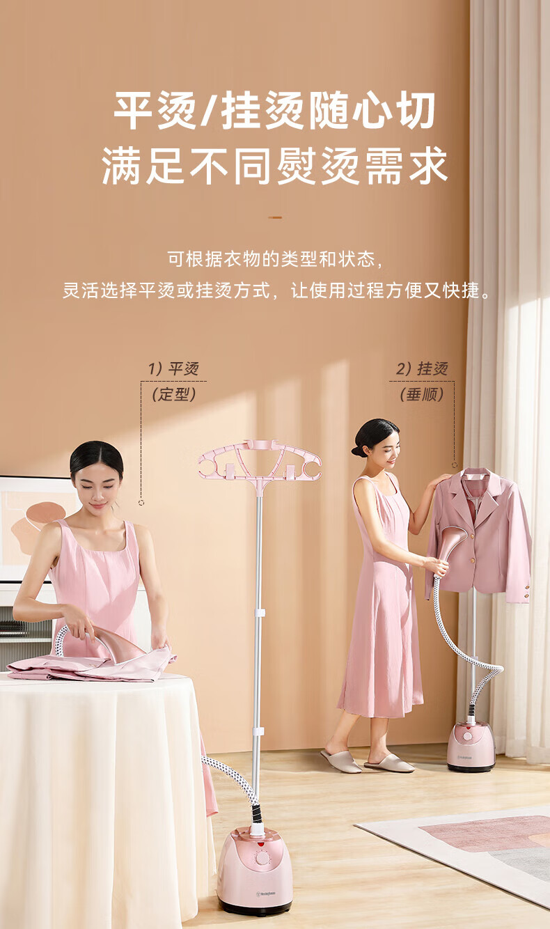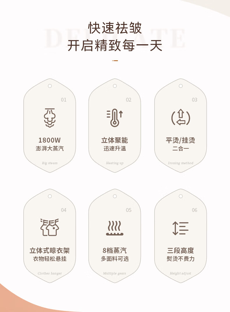 1800W大蒸汽,强劲穿透,快速除皱重塑衣形;平烫/挂烫搭配8档蒸汽,轻松熨烫各种衣物;;预热快无需久等、多孔蒸汽,细腻不伤衣;