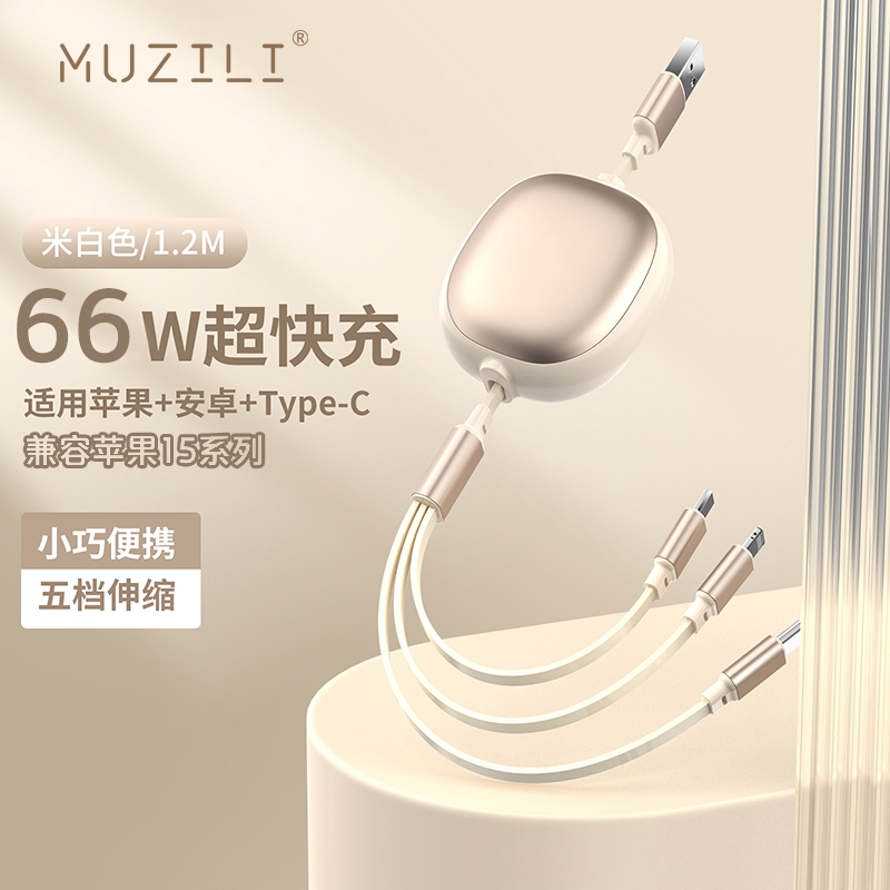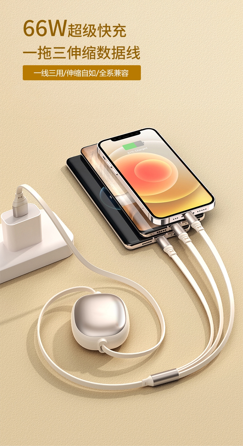 配置清单:66W铝合金超级快充一拖三伸缩数据线*1、迷你全金属手机平板桌面旋转支架*1、天地盖礼盒*1、手提袋*1