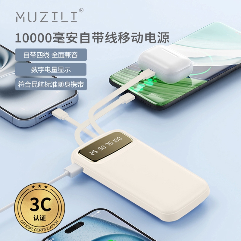 一万毫安自带四线移动电源 数字电量精准显示;内置四线 满足不同手机 3C符合民航局标准随身携带;66W铝合金超级快充一拖三伸缩数据线 兼容苹果15;五档伸缩调节 1.2米长度设计 铝合金面盖;三种充电接口满足各种手机