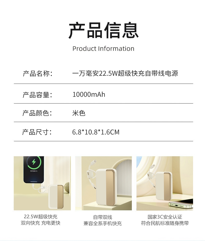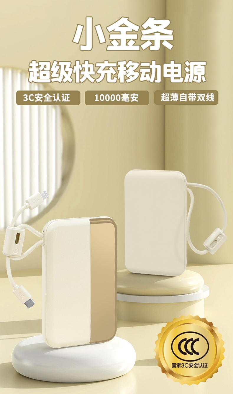 小金条一万毫安22.5W超薄快充移动电源超薄机身;双线快充提绳设计,小金条设计 3C符合民航局标准;迷你全金属手机平板桌面旋转支架 360°可旋转底座;180°双转轴 全金属材质,增加防滑脚垫;支撑力强劲,手机平板通用
