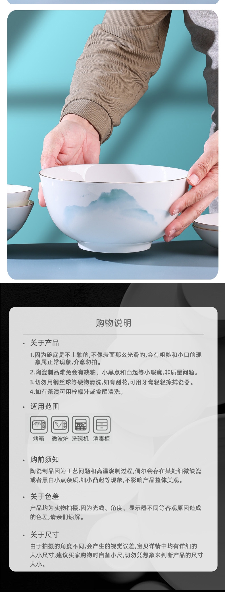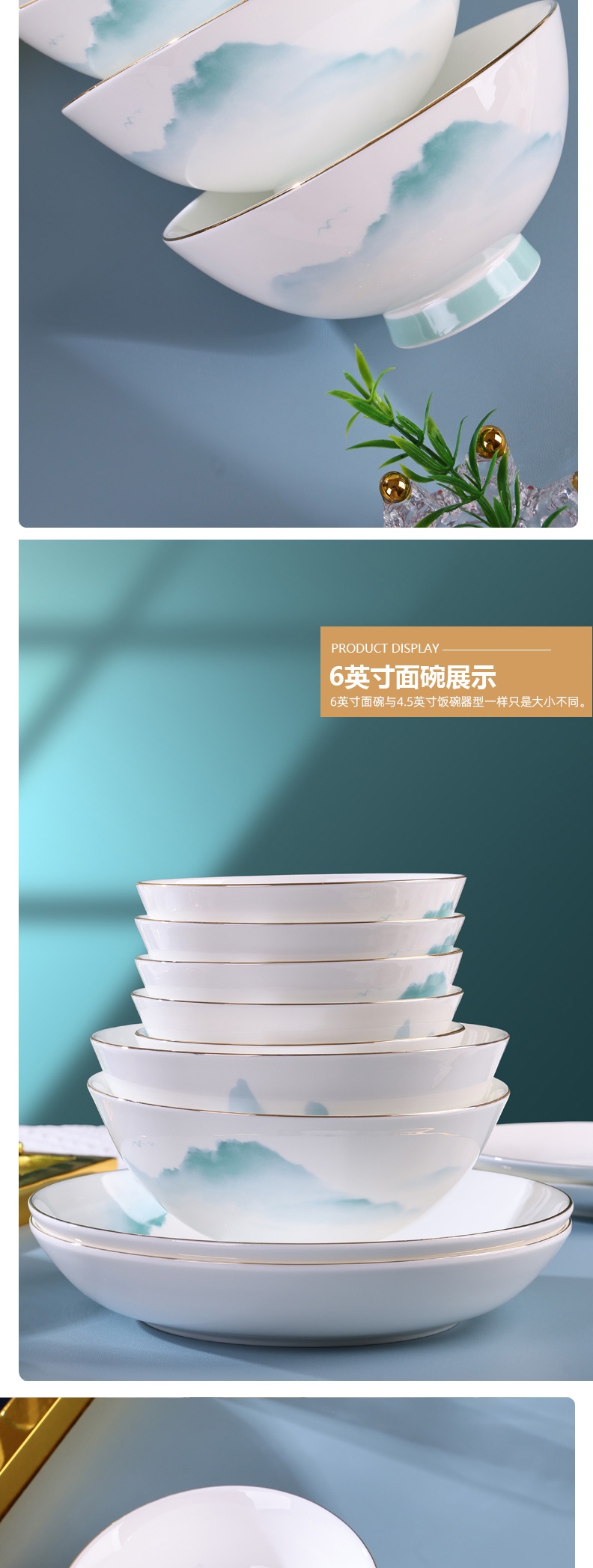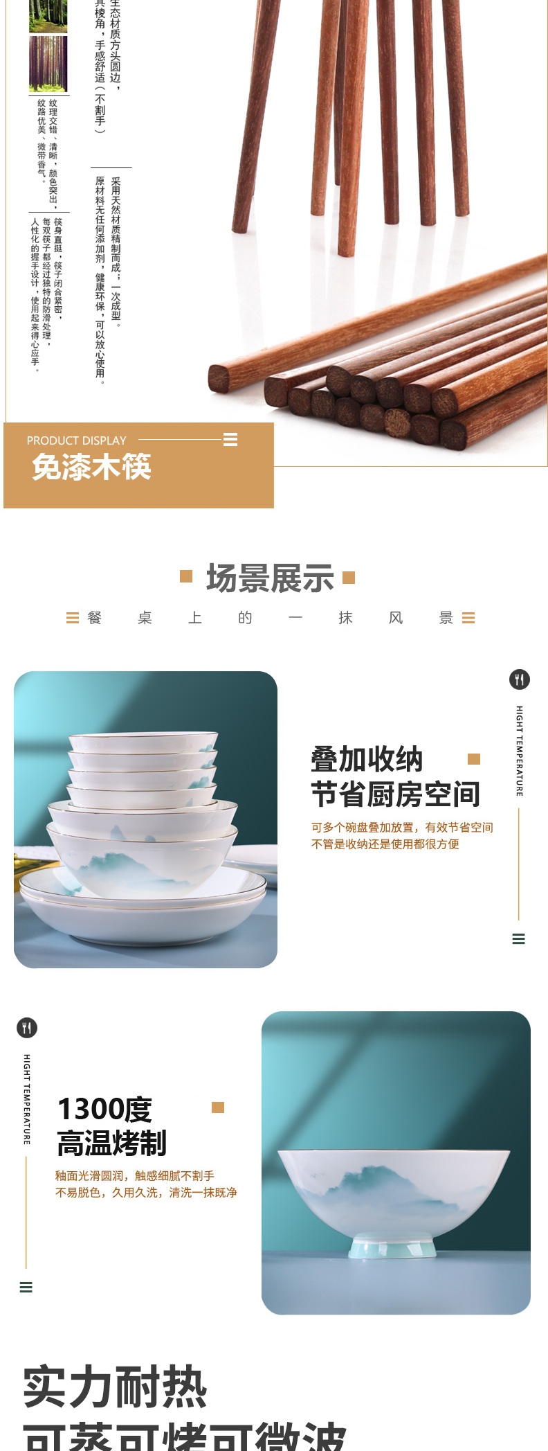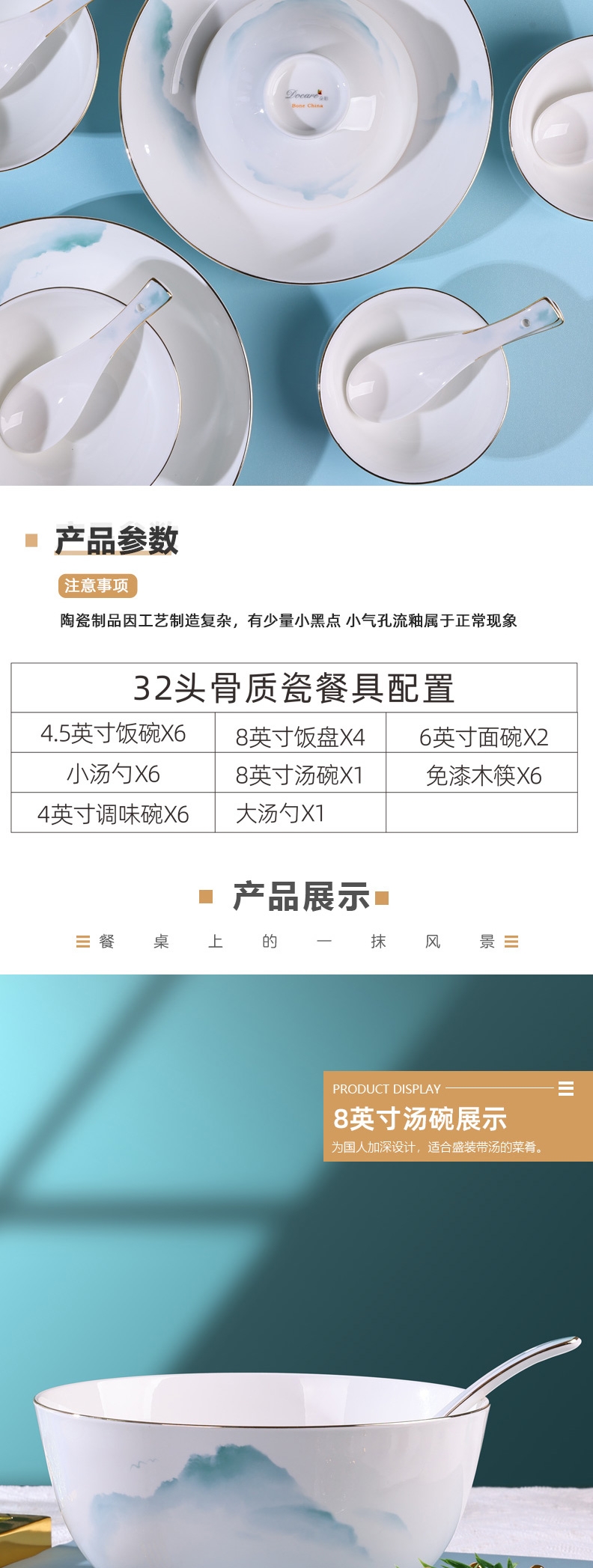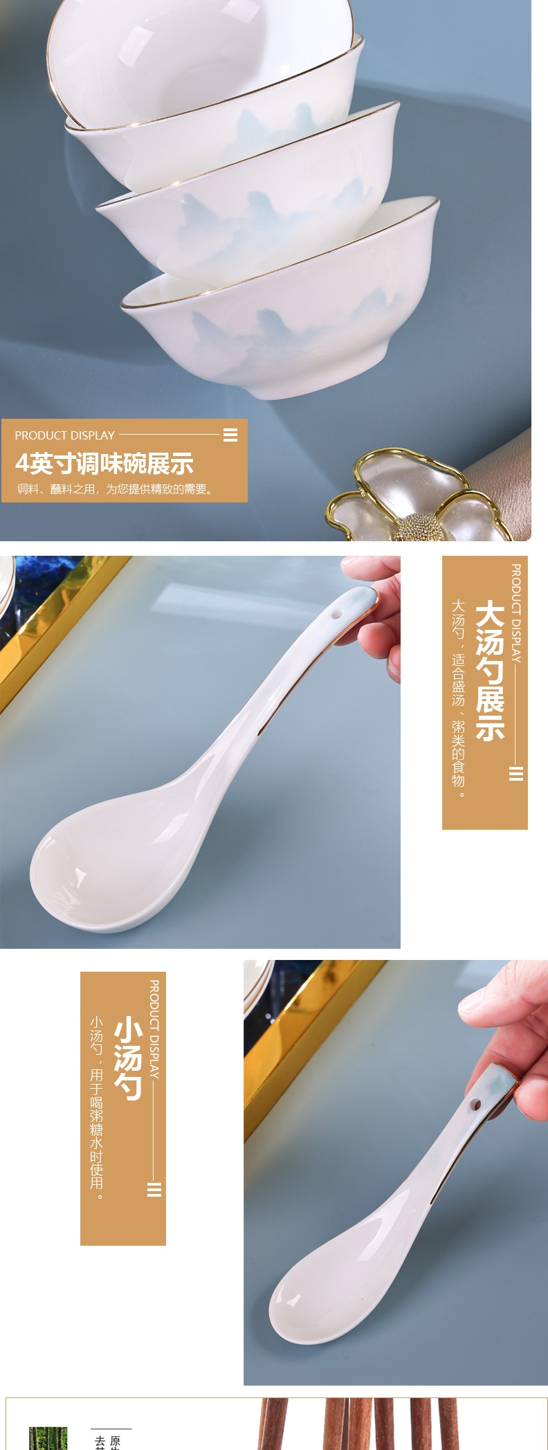 配置清单:产品规格: 4.5英寸饭碗6个,8英寸饭盘4个,免漆木筷6双,4英寸调味碗6个,小汤勺6个,6英寸面碗2个,8寸汤碗1个,大汤勺1个。