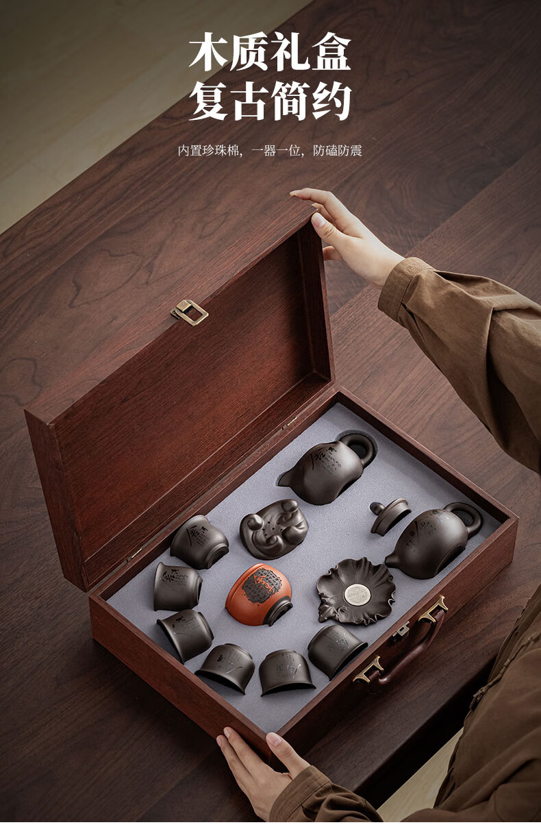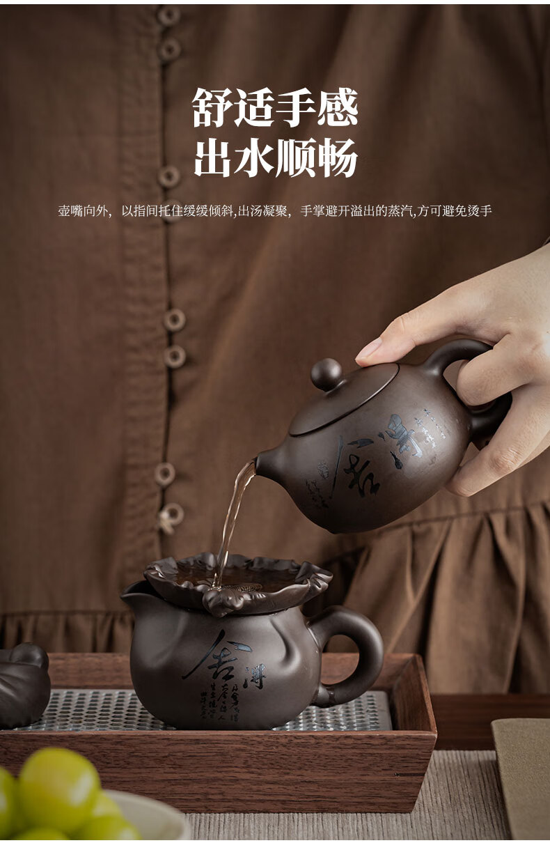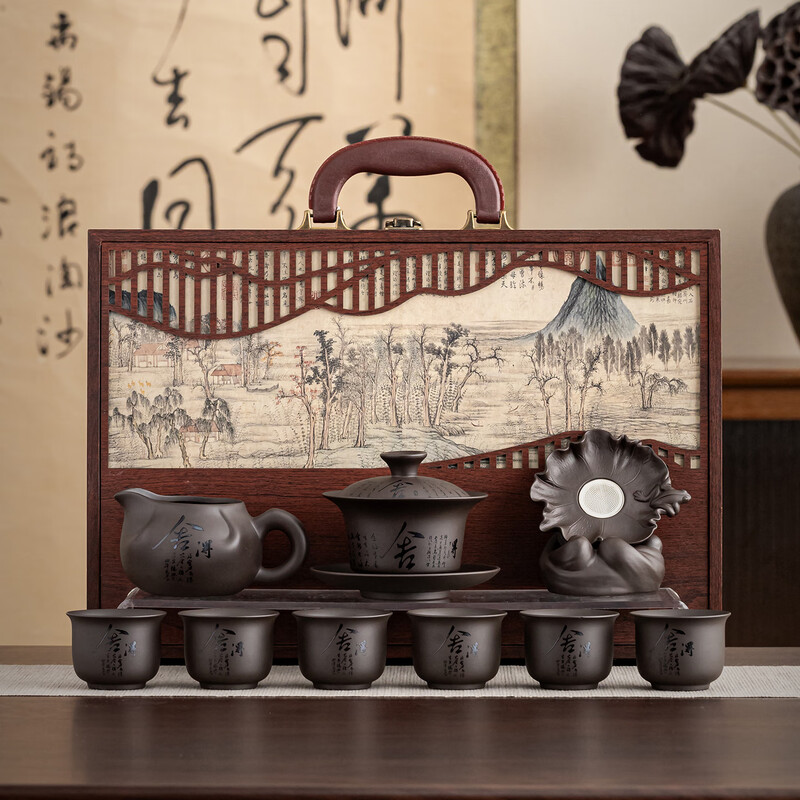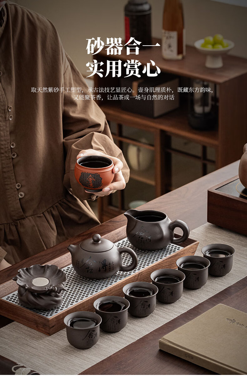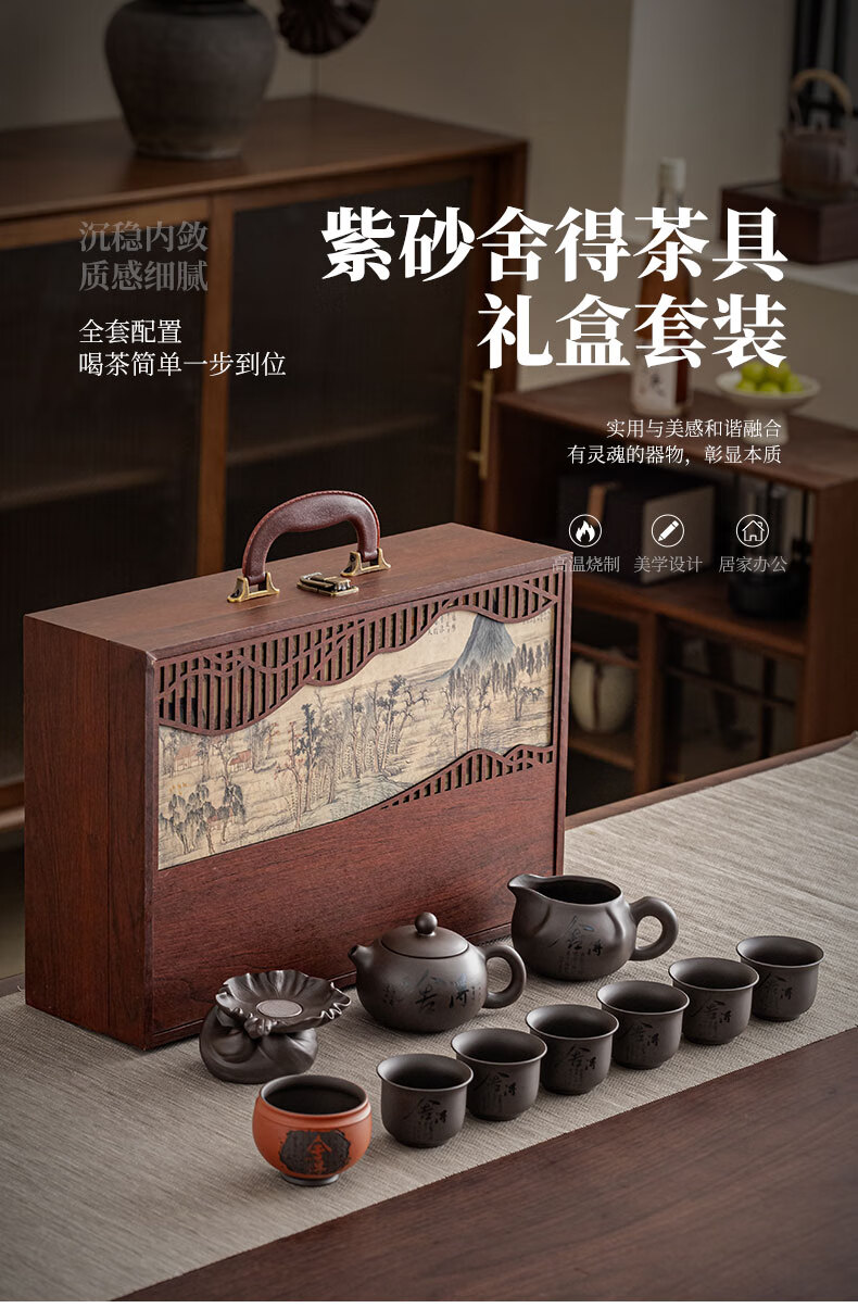 紫砂质感:器型古朴,“舍得”刻字藏禅意;配件精致:盖碗+公道杯+六杯+荷形过滤,品饮超全; 礼盒吸睛:山水木盒,书法墨香里的中式美学;格调拉满:商务送礼有面,日常品茗显品味