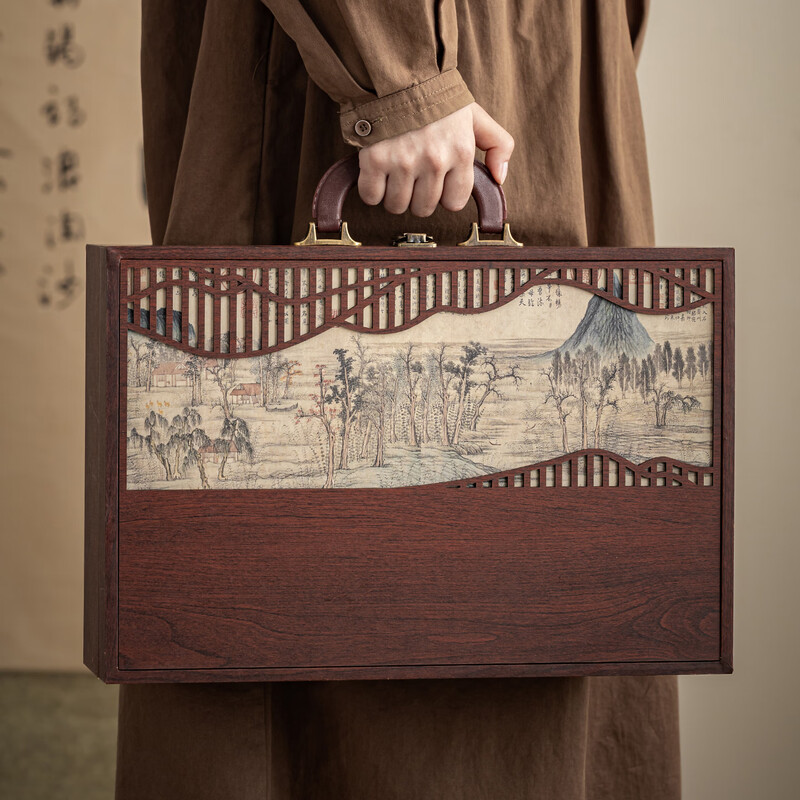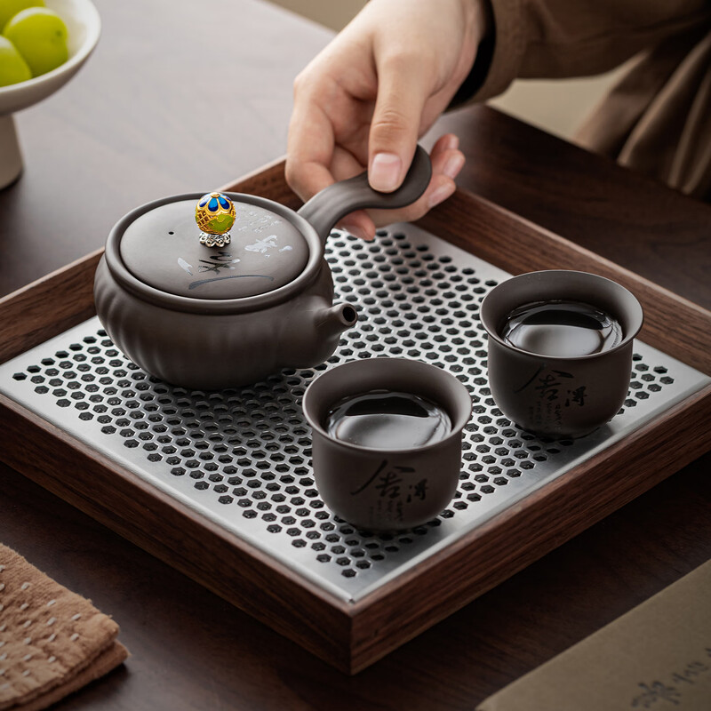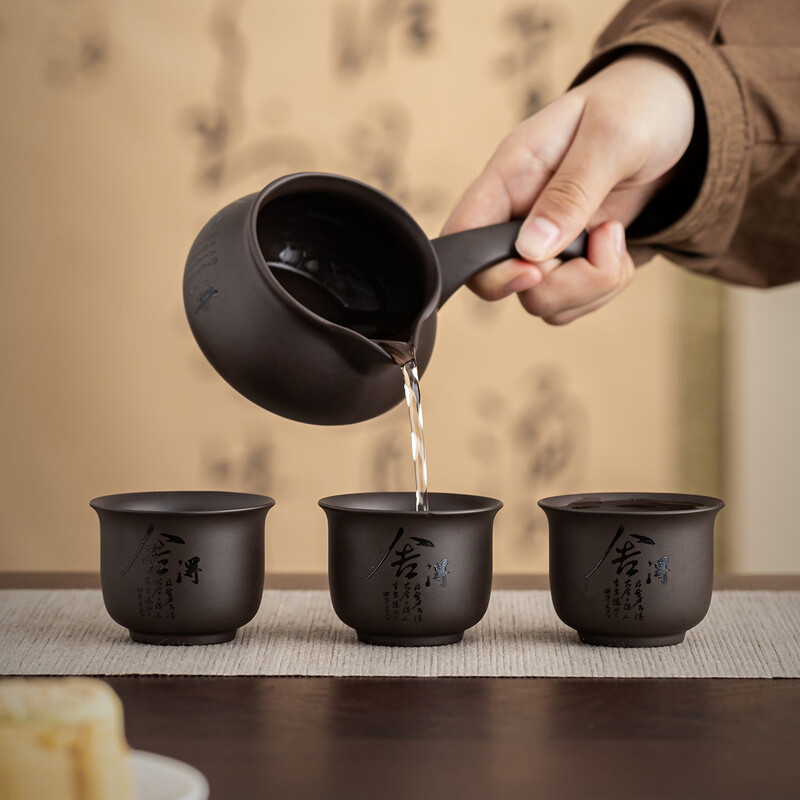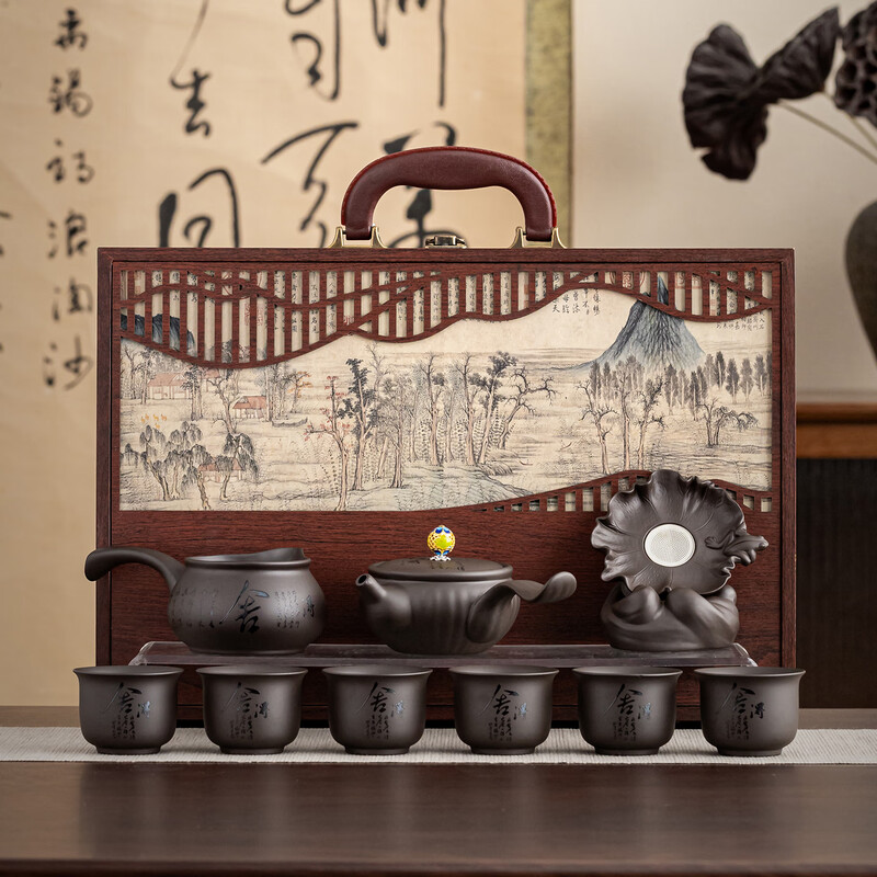 禅意刻字:紫砂器身刻“舍得”,喝茶悟取舍哲学;配件精致:侧把壶+侧把茶海+六杯+荷形茶漏,套装超;礼盒吸睛:山水木盒承古韵,书法墨香里的中式美学;格调拉满:商务送礼有面,日常饮茶显品味