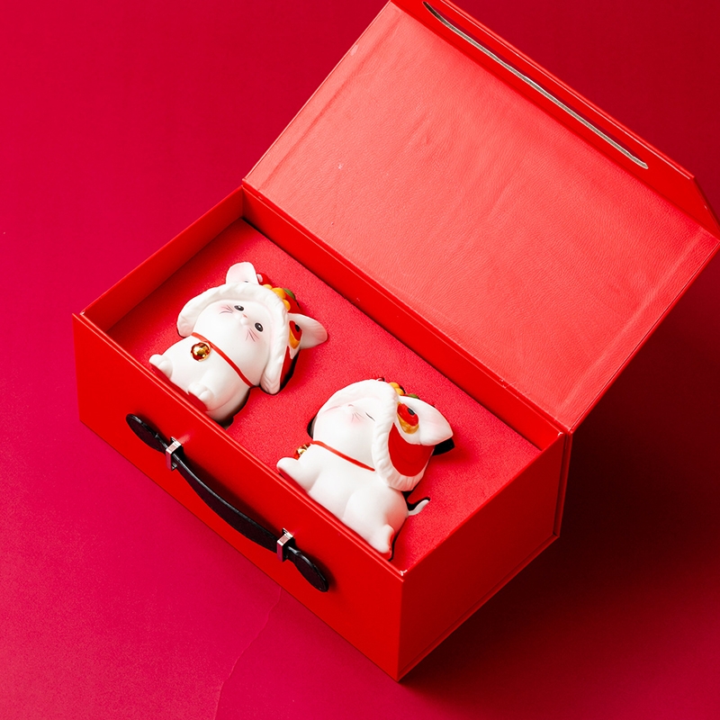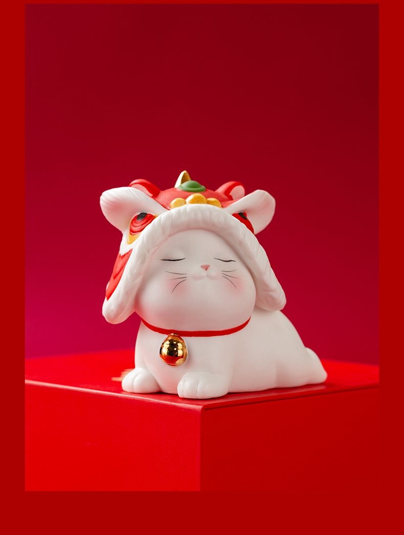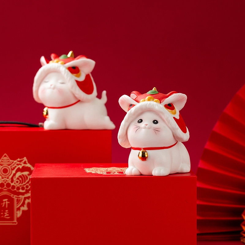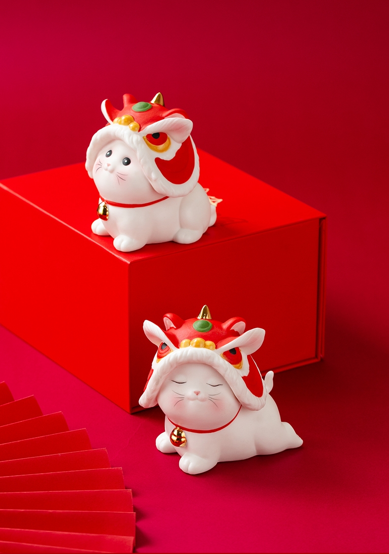 拂器 醒狮开运陶瓷舞狮猫一对白瓷摆件BJ002-2