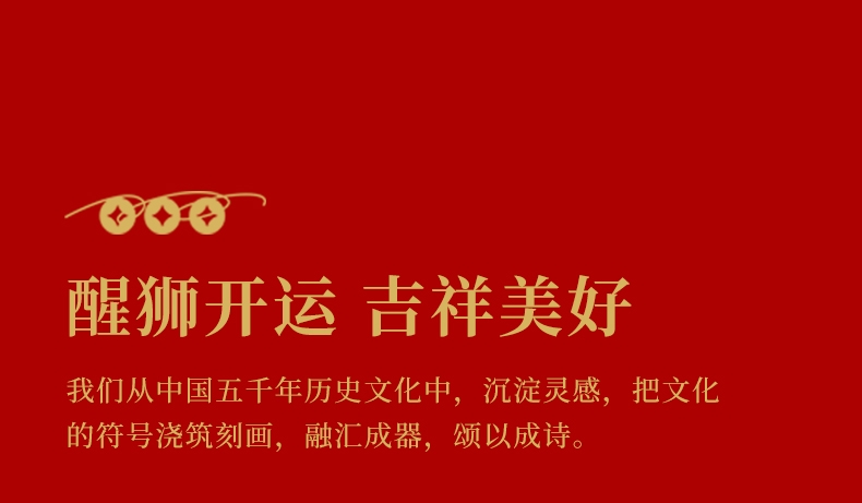 国潮醒狮,艺术演绎。;细腻刻画,栩栩如生,灵动别致。;匠心融入,面面俱到,美观大方。