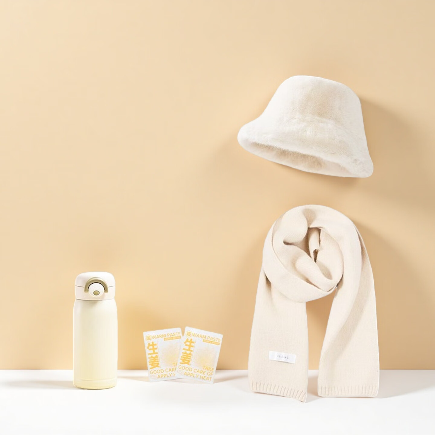 产品组合:(围巾帽子杯子暖宝宝*2片)
