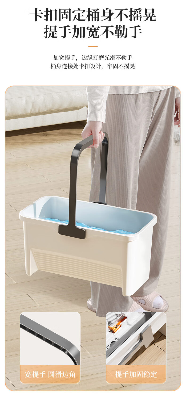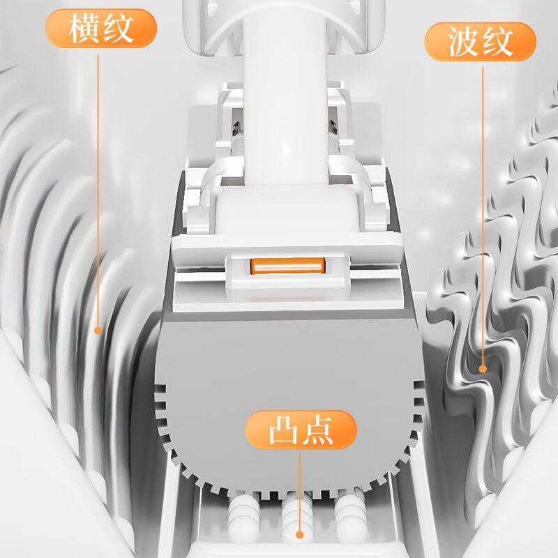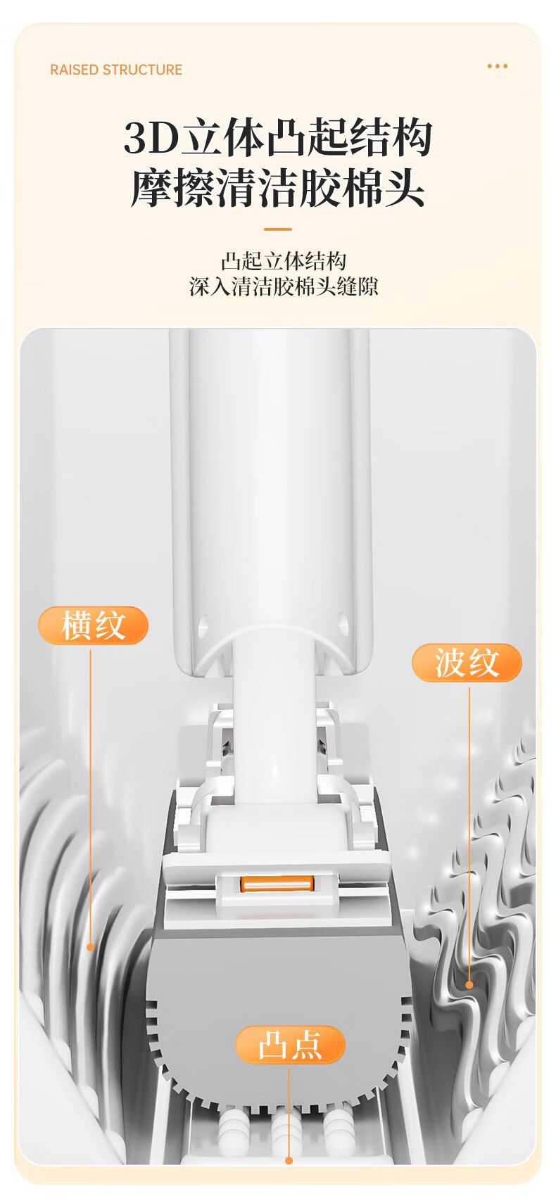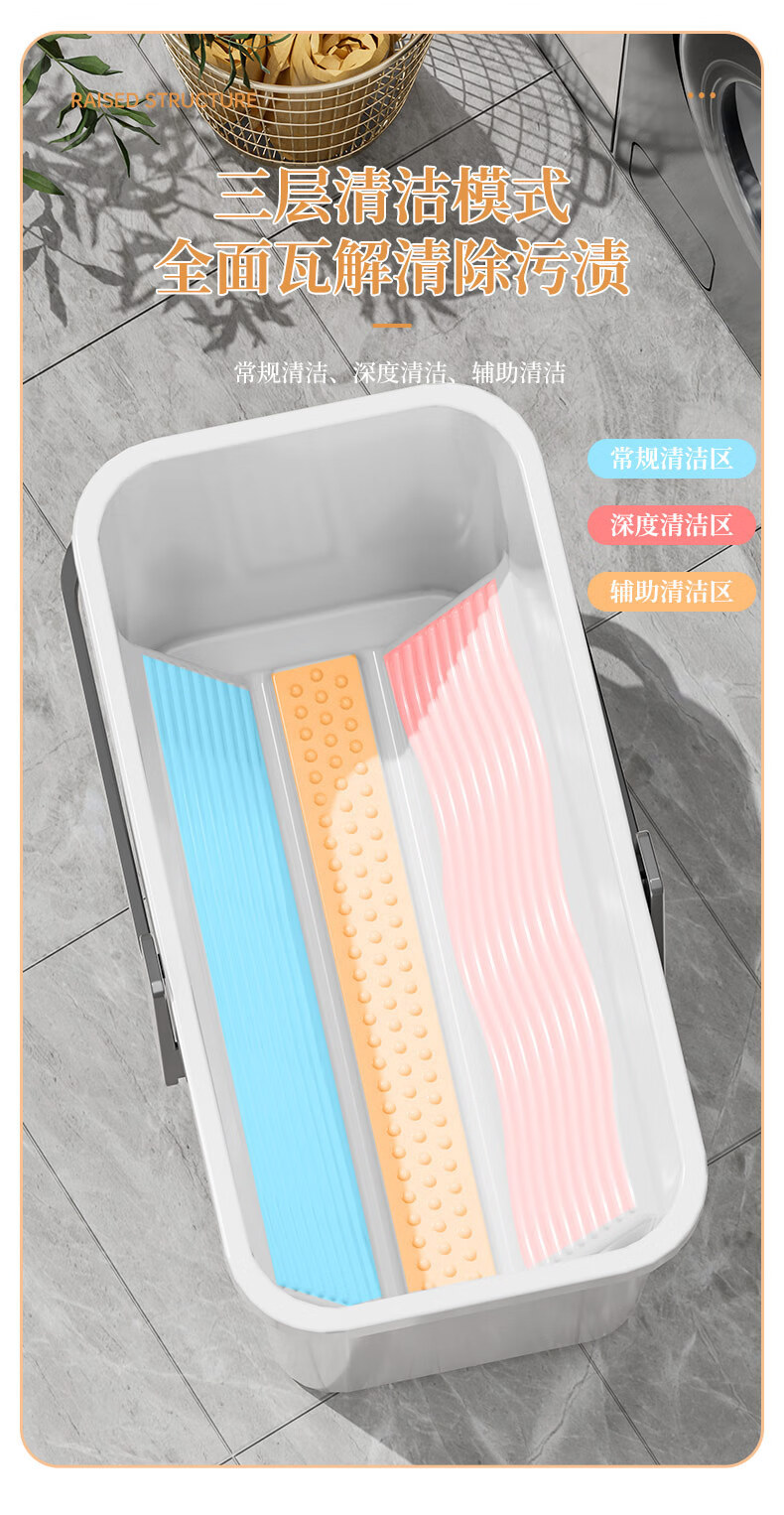 波纹清洁深层清洁拖把 三面三种不同样式清洁波纹深度;凸起立体结构深入清洁胶棉头缝隙;加宽提手,边缘打磨光滑不勒手桶身连接处卡扣设计