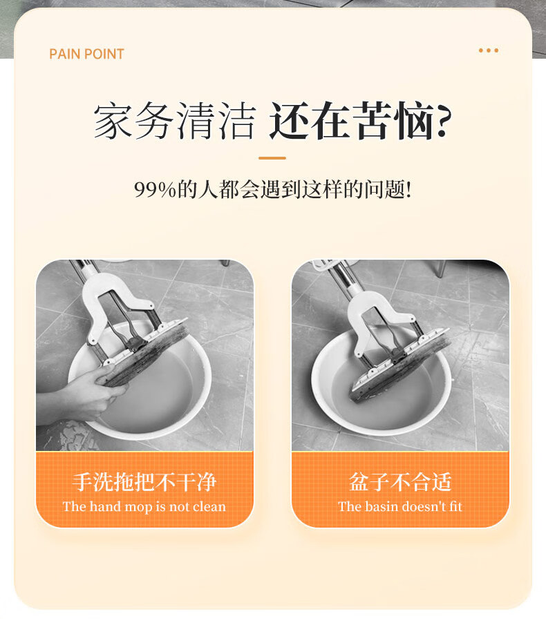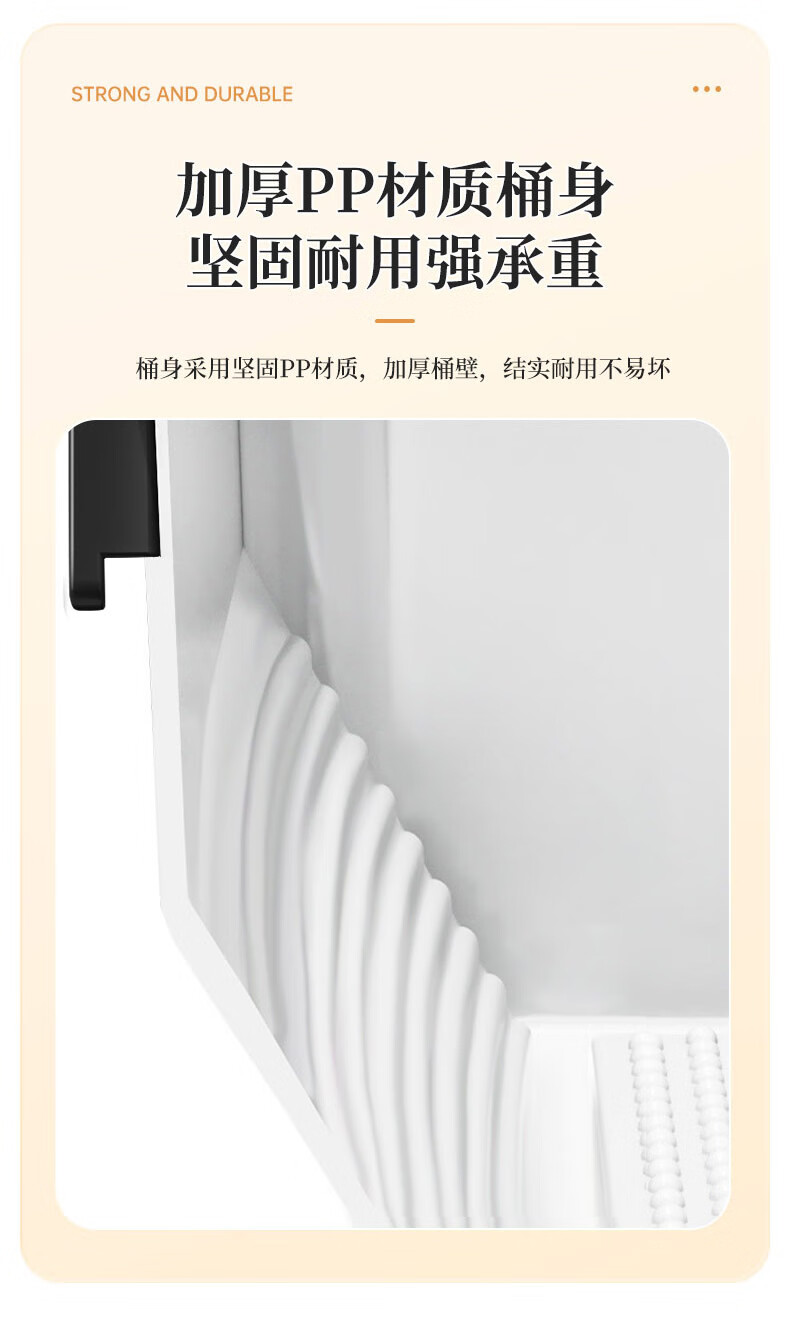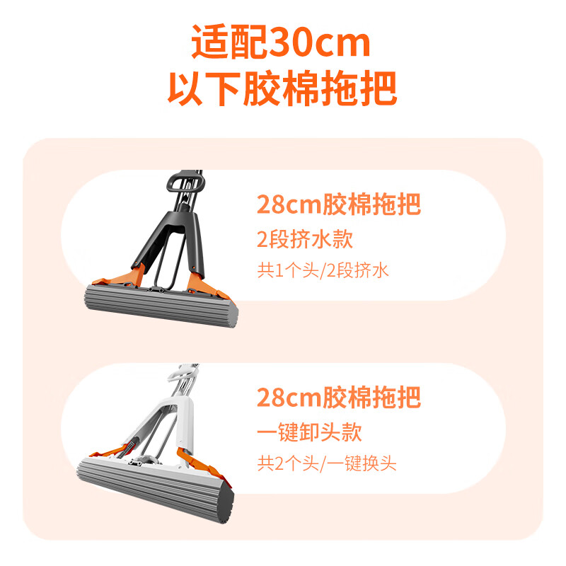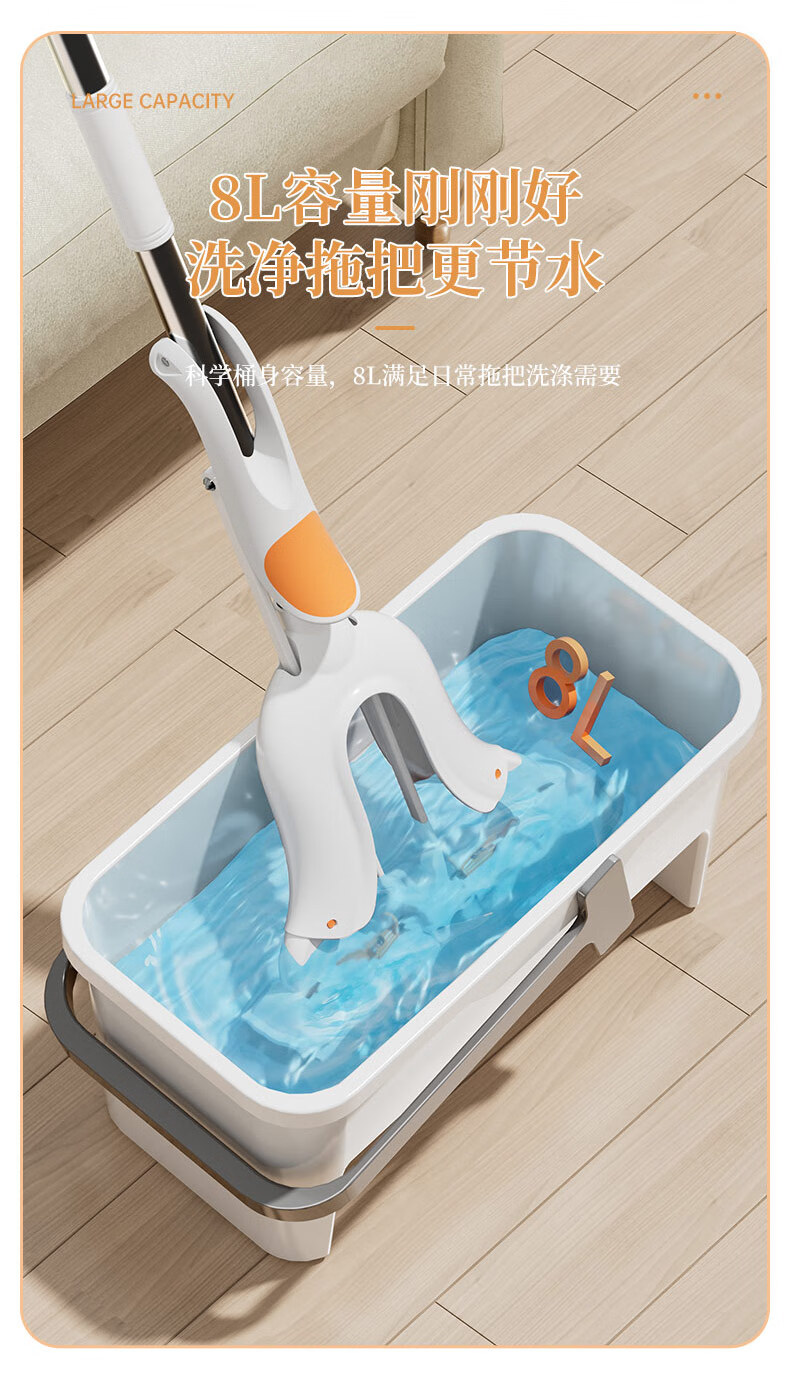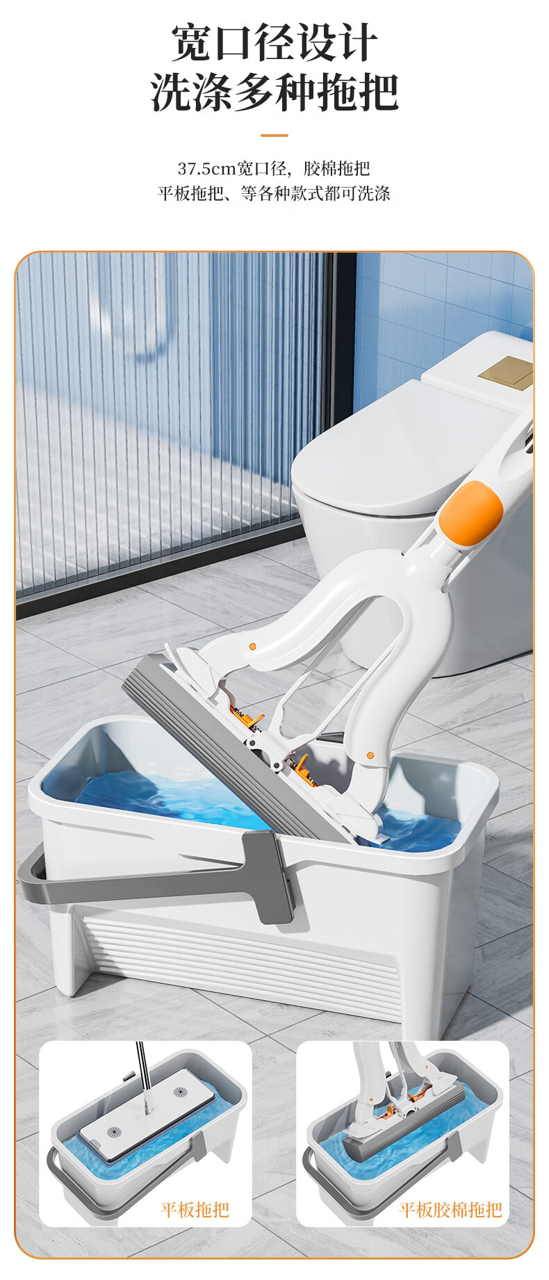 波纹清洁深层清洁拖把 三面三种不同样式清洁波纹深度;凸起立体结构深入清洁胶棉头缝隙;加宽提手,边缘打磨光滑不勒手桶身连接处卡扣设计