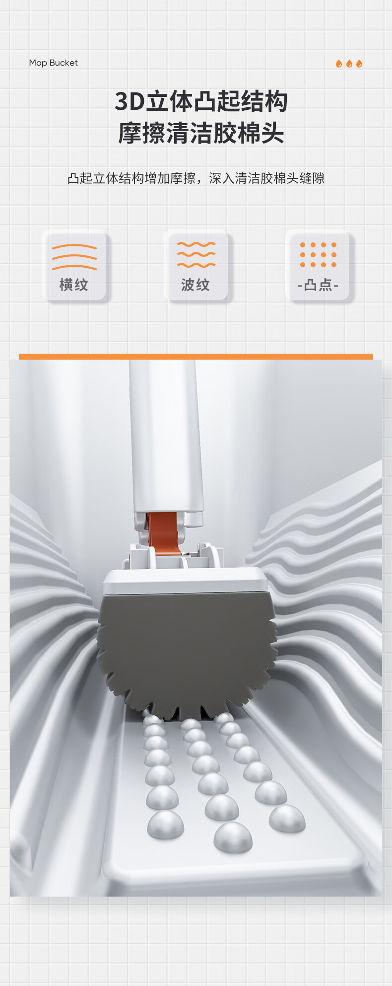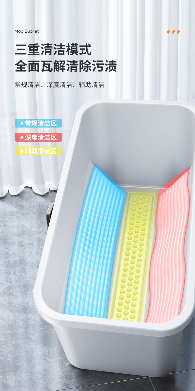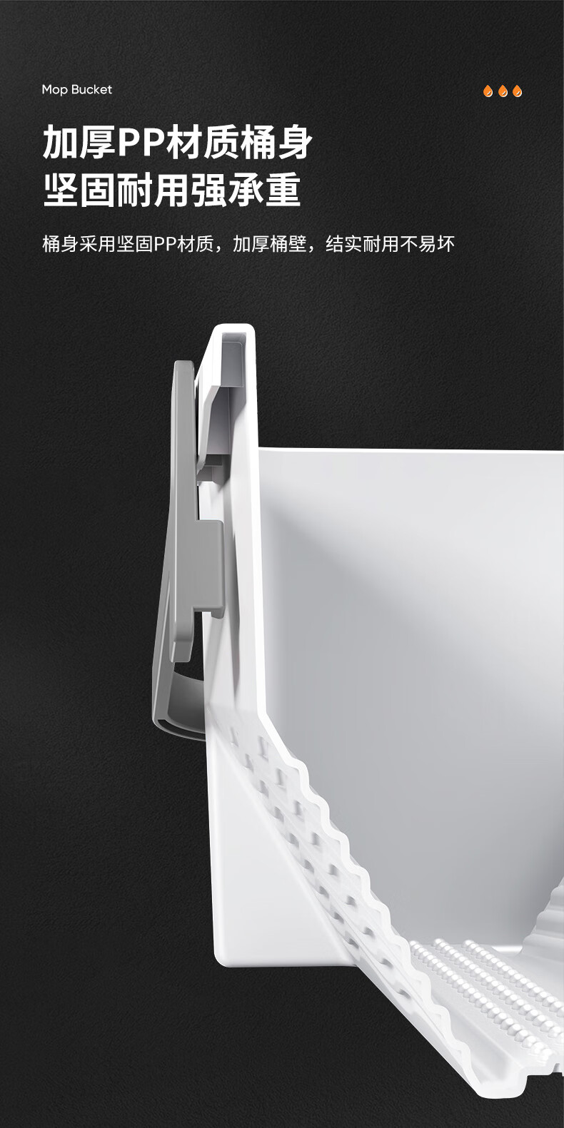 凸起立体结构增加摩擦,深入清洁胶棉头缝隙;科学桶身容量,14L满足日常拖把洗涤需要;桶身采用坚固PP材质,加厚桶壁,结实耐用不易坏