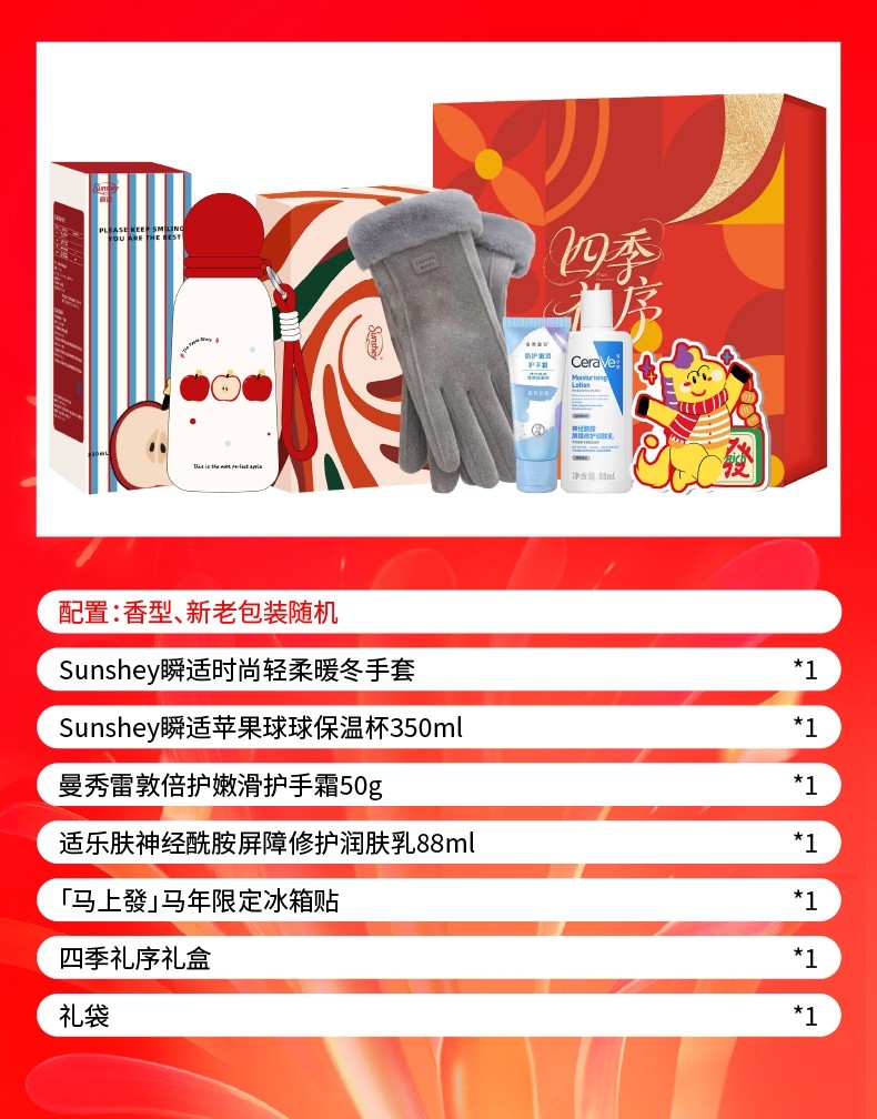 配置清单:Sunshey瞬适苹果球球保温杯350ml*1 Sunshey瞬适时尚轻柔暖冬手套*1双 Sunshey瞬适·双面触感遮光眼罩*1 适乐肤神经酰胺屏障修护润肤乳88ml*1 花王(KAO)护手保湿霜50g*1 蔬果园香挂*1(赠品) 「马上發」马年限定冰箱贴*1块(赠品) 四季礼序礼盒*1 礼袋*1