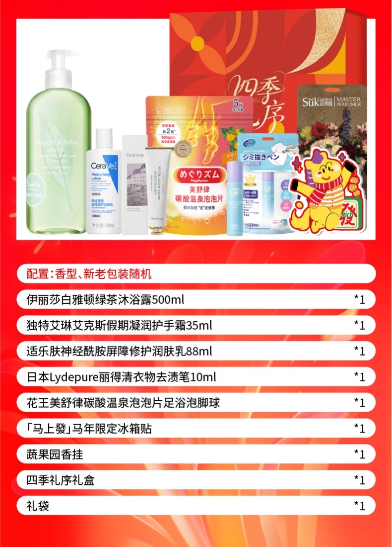 配置清单:伊丽莎白雅顿绿茶沐浴露500ml*1 独特艾琳艾克斯假期凝润护手霜35ml*1 适乐肤神经酰胺屏障修护润肤乳88ml*1 日本Lydepure丽得清衣物去渍笔10ml*1 花王(KAO)美舒律碳酸温泉泡泡片足浴泡脚球(助力好眠)(35gx5片装)*1 「马上發」马年限定冰箱贴*1块(赠品) 蔬果园香挂*1(赠品) 四季礼序礼盒*1 礼袋*1
